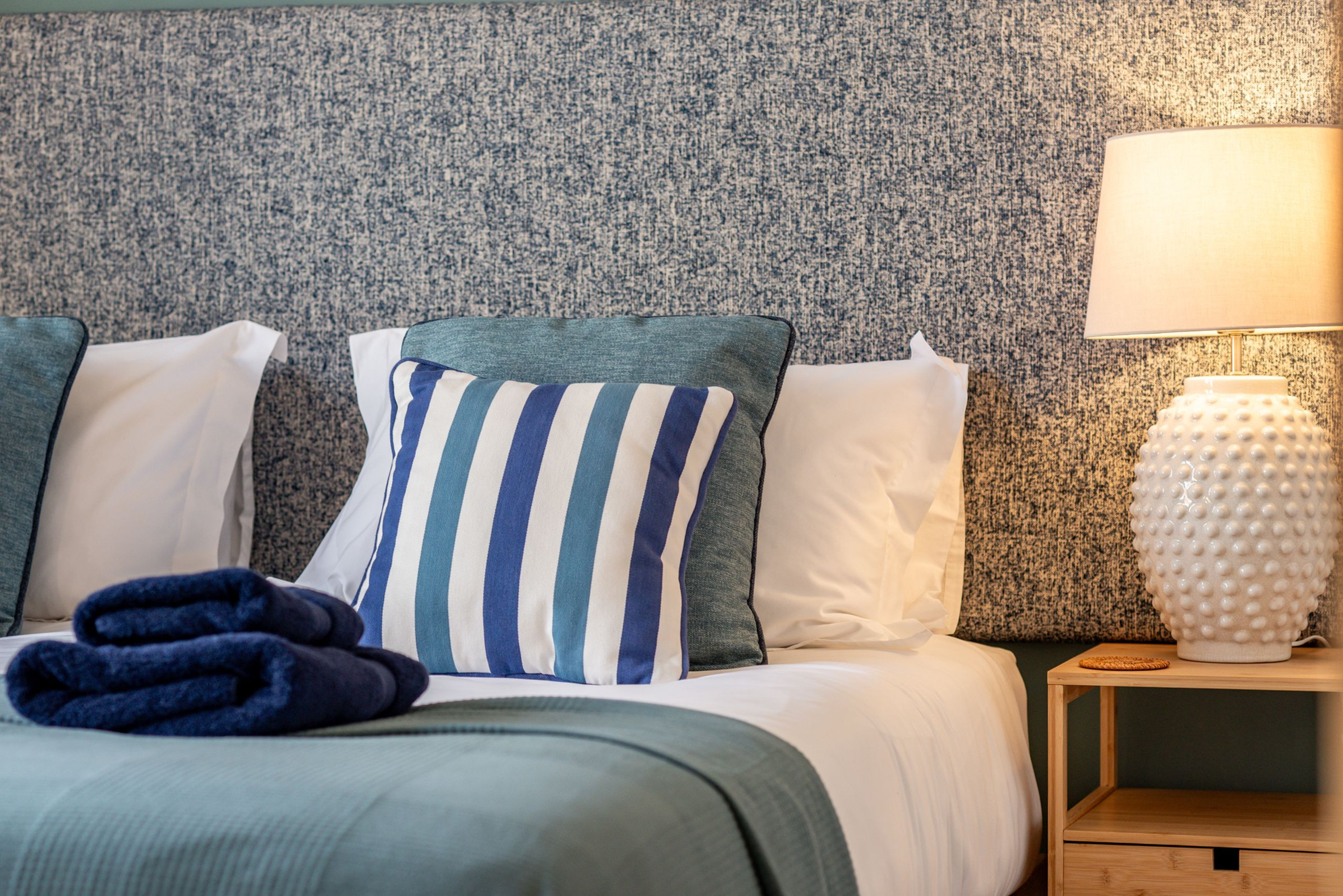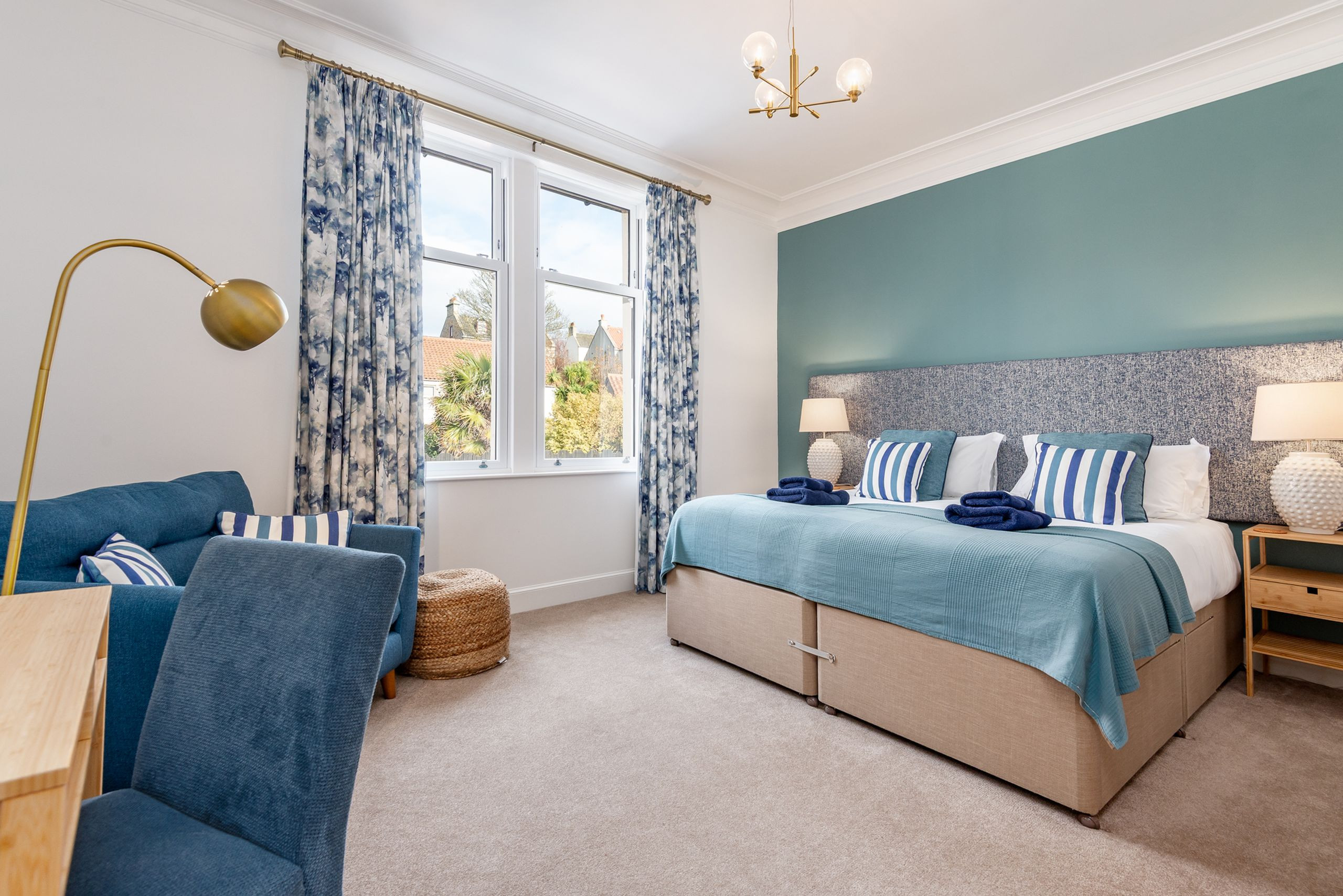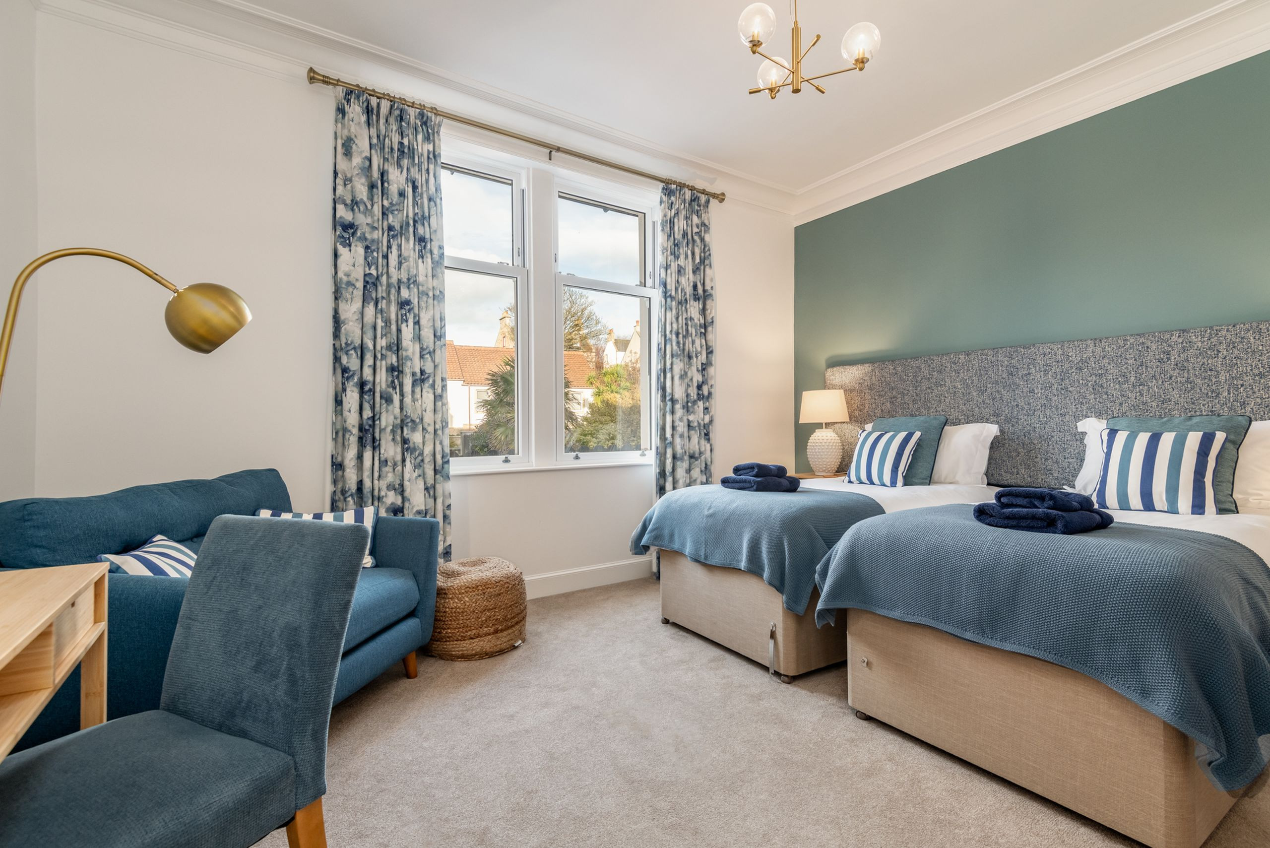 Four inviting bedrooms are set across the apartment, including a couple of stylish doubles and bright twin rooms dressed in soft linens and seaside prints—ideal for mixed groups. A contemporary family bathroom and additional shower facilities make getting ready easy, while Wi-Fi, central heating and an iron add everyday convenience.