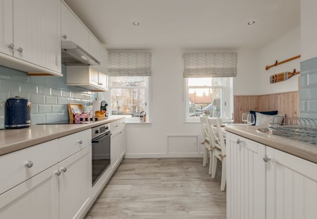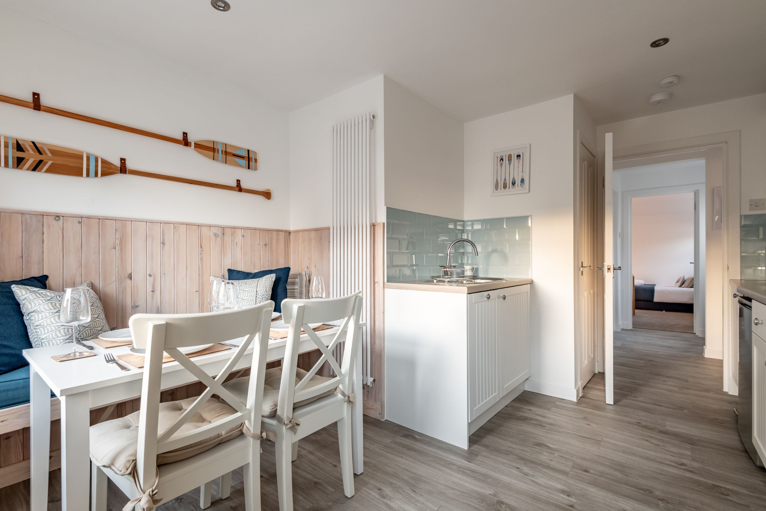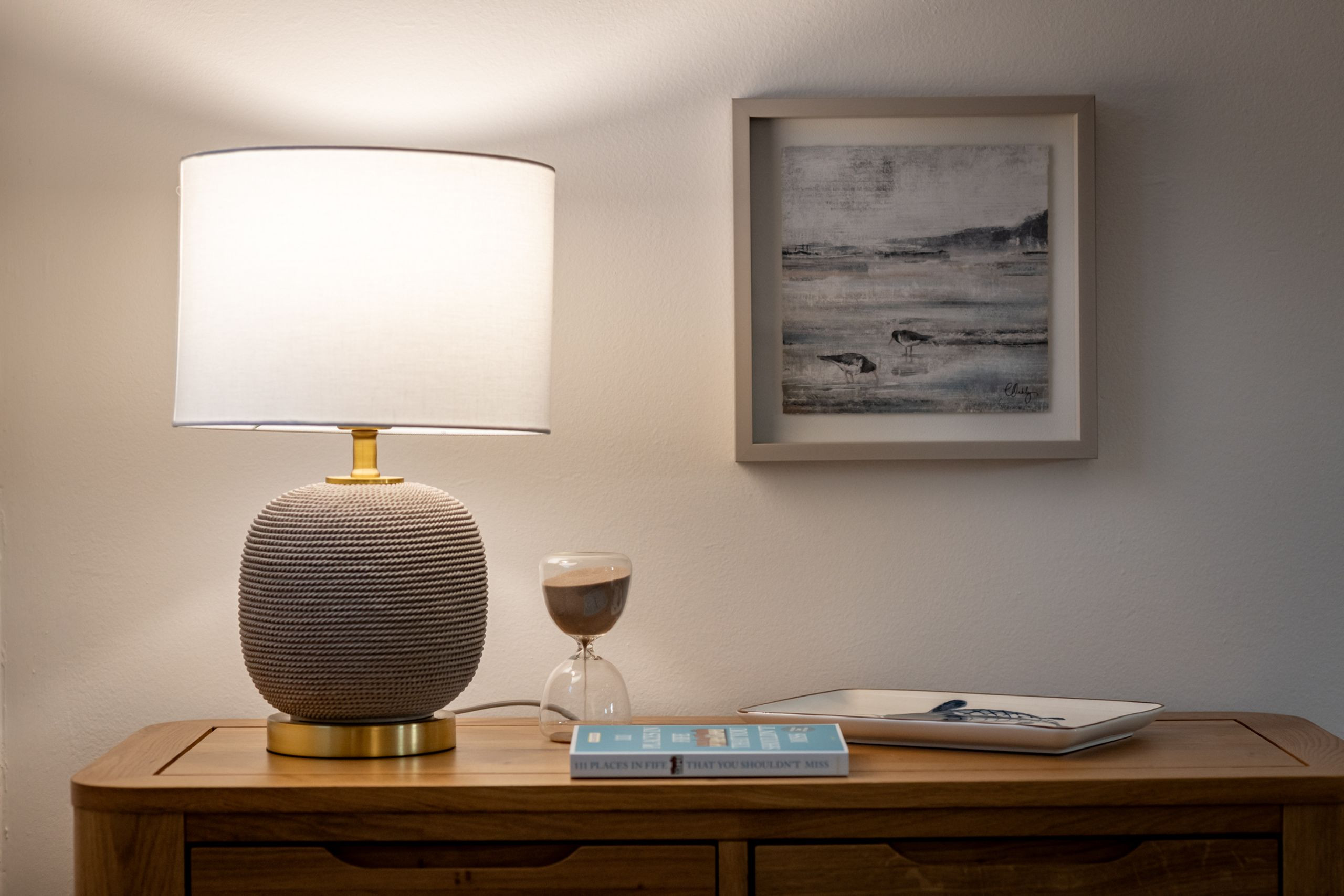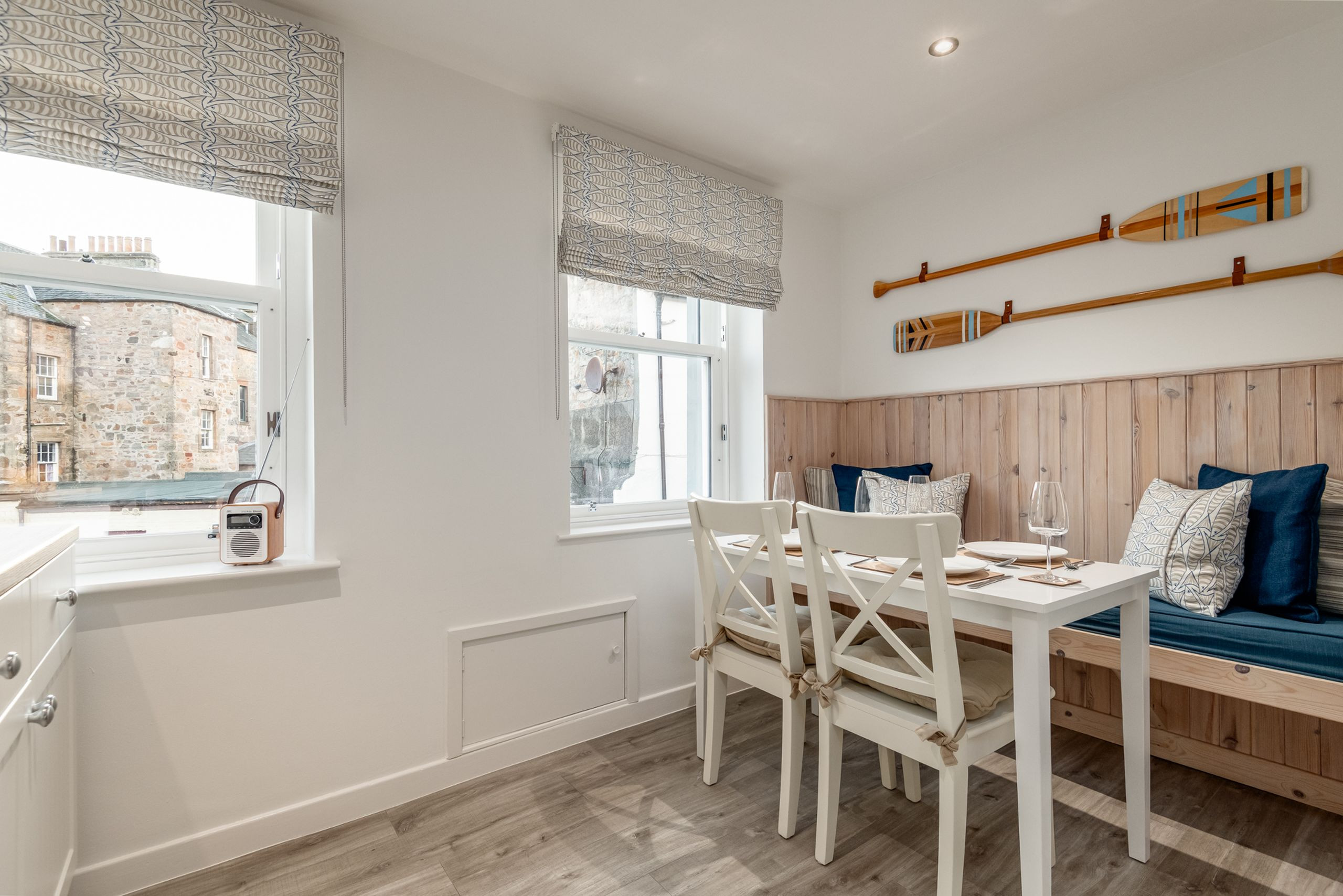 The light-filled living room is made for slow mornings and cosy evenings, with deep sofas, a smart TV and glimpses towards the Firth of Forth. A fresh, well-equipped kitchen runs along the window line, complete with oven, hob and microwave, full-size fridge-freezer, coffee machine and toaster, plus all the dishes, cutlery and cookware you’ll need. The built-in dining nook is perfect for unhurried breakfasts before a day exploring the coast.