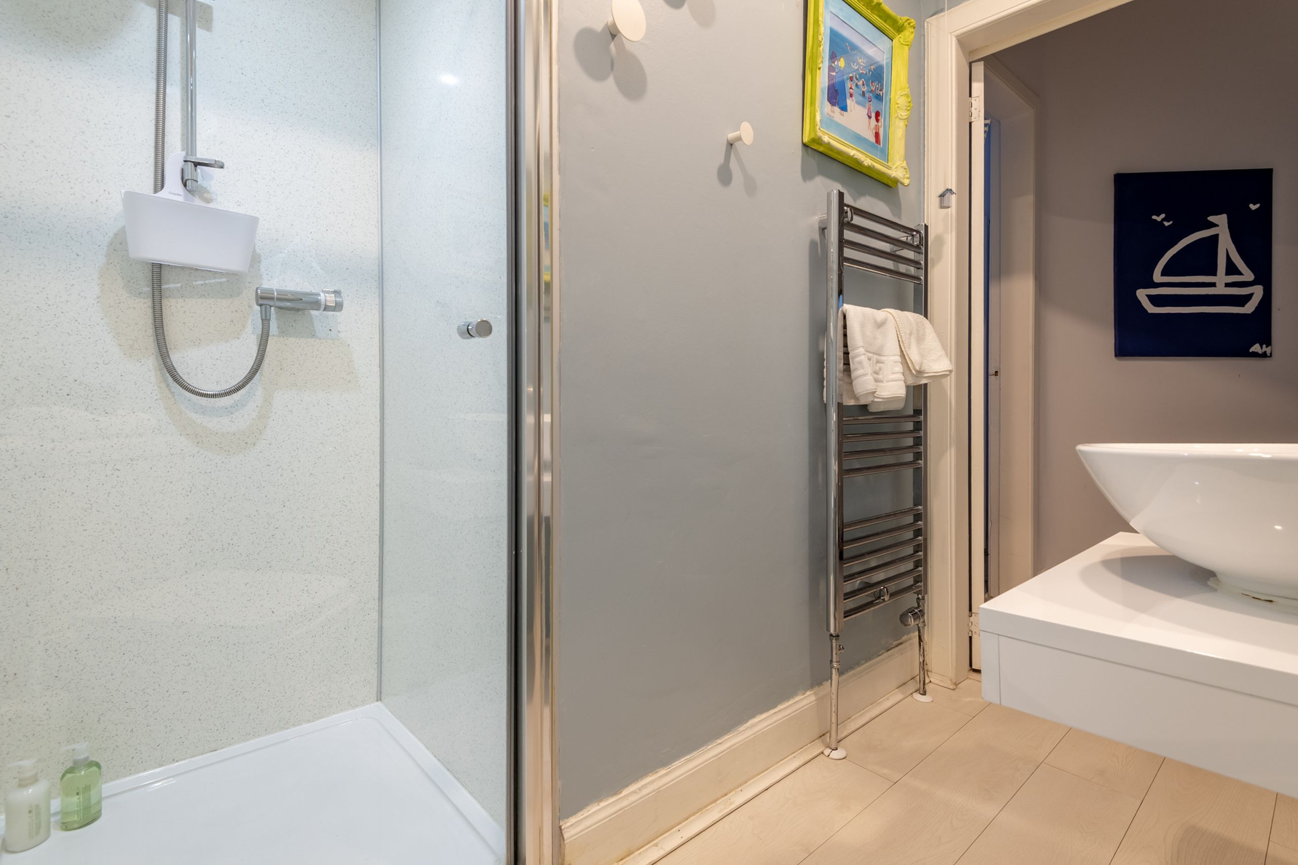 There are two flexible bedrooms: Bedroom 1 can be set up as a super-king (two singles with an over-mattress) or made into twin beds on request, while Bedroom 2 is a good-sized twin with plenty of storage. A modern, fully tiled shower room with enclosure, WC, wash hand basin and heated towel rail completes the layout. Outside, a private gate gives direct access to the beach path, and the outhouse offers secure storage for bikes and golf kit. A small, well-behaved dog may be considered, and Wi-Fi is included to keep everyone connected. Please note that although the apartment sits very close to the beach, it does not have sea views. -