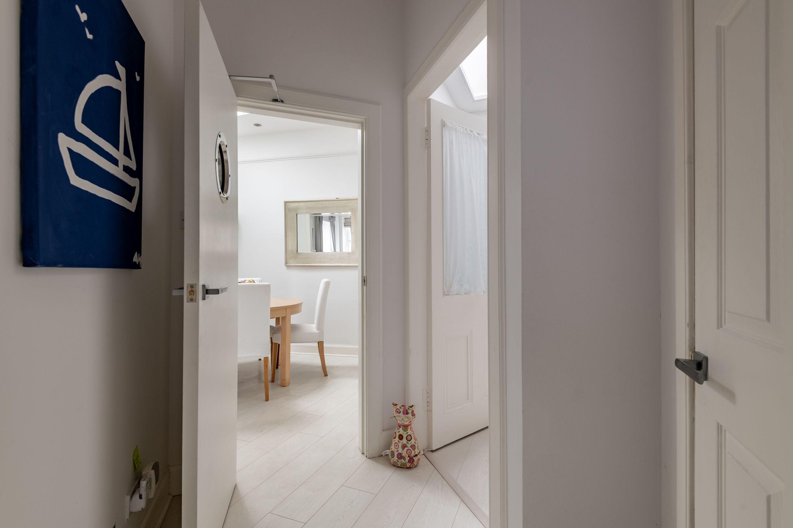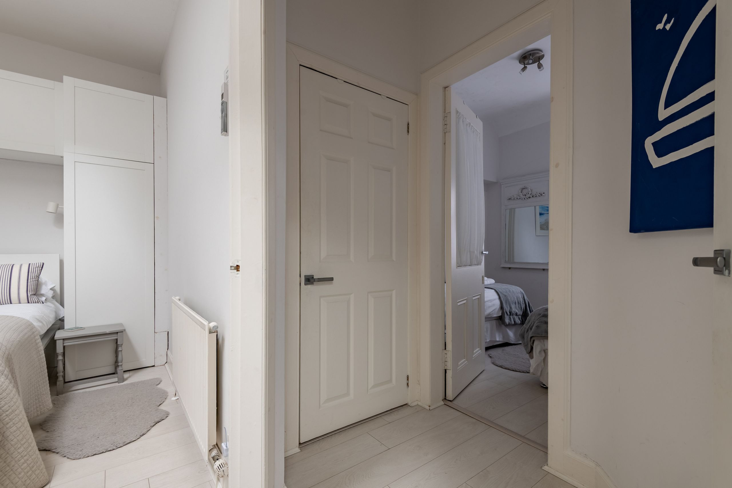 The luxury fitted kitchen overlooks the private patio and comes well equipped with gas hob, electric oven, integrated extractor, dishwasher, fridge-freezer, microwave, Nespresso machine, and stylish Smeg kettle and toaster, keeping self-catering simple and enjoyable. The tranquil master bedroom has a king-size bed, fitted wardrobe and overhead storage, with a large roof window giving a lovely airy feel. A second bedroom, remodelled in 2022, offers two single beds, bedside table with lamp and access to a utility cupboard with washing machine.
