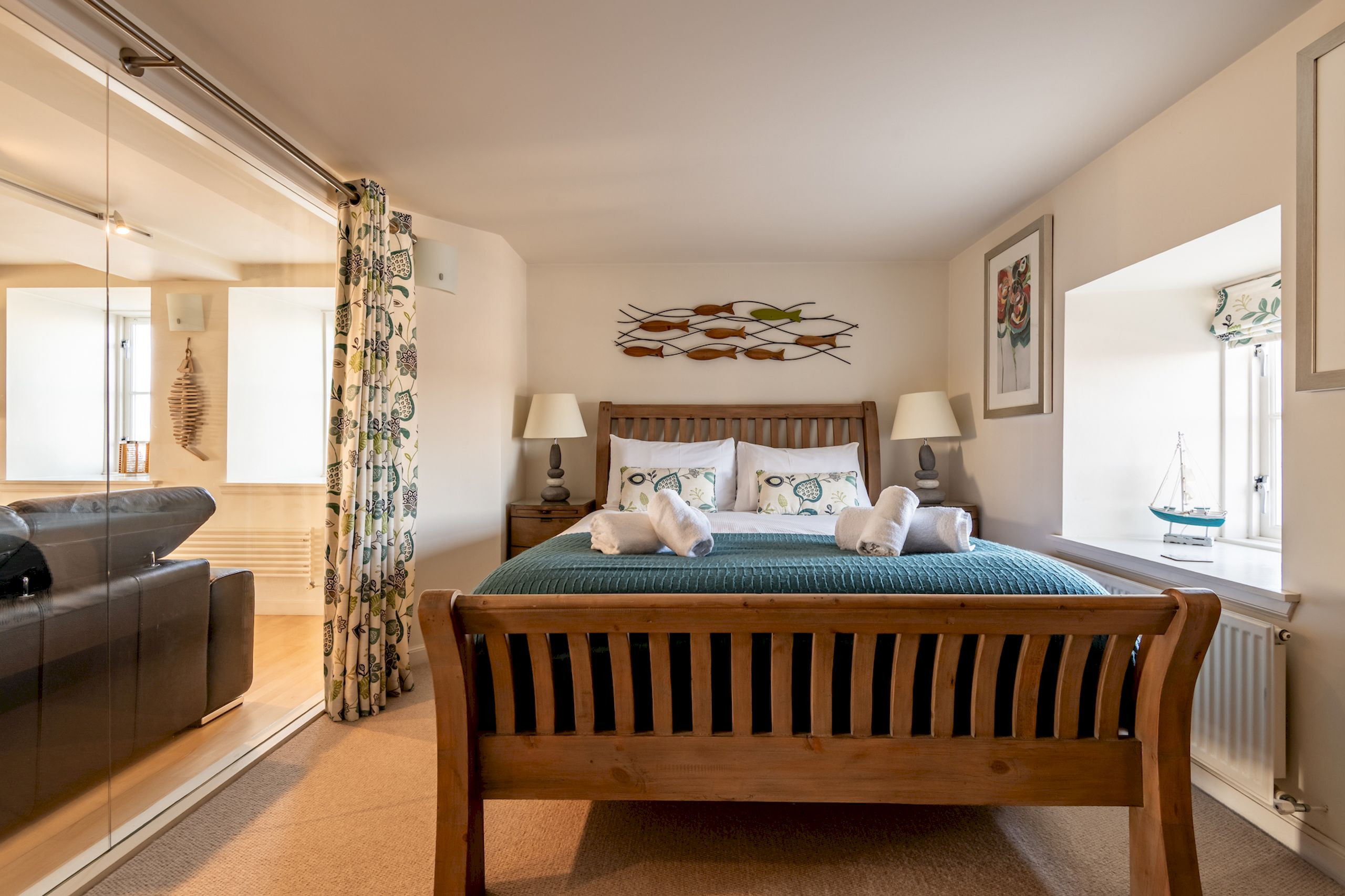 Set right at the very end of the harbour, Granary Beach – Apartment 4 offers an exceptional coastal escape in a truly unique location. This imaginatively converted second-floor apartment places you almost on the water’s edge, with breath-taking, uninterrupted views across the harbour and out to sea. Whether you're relaxing in the living area or waking up to the sound of the waves, the scenery here is nothing short of spectacular.