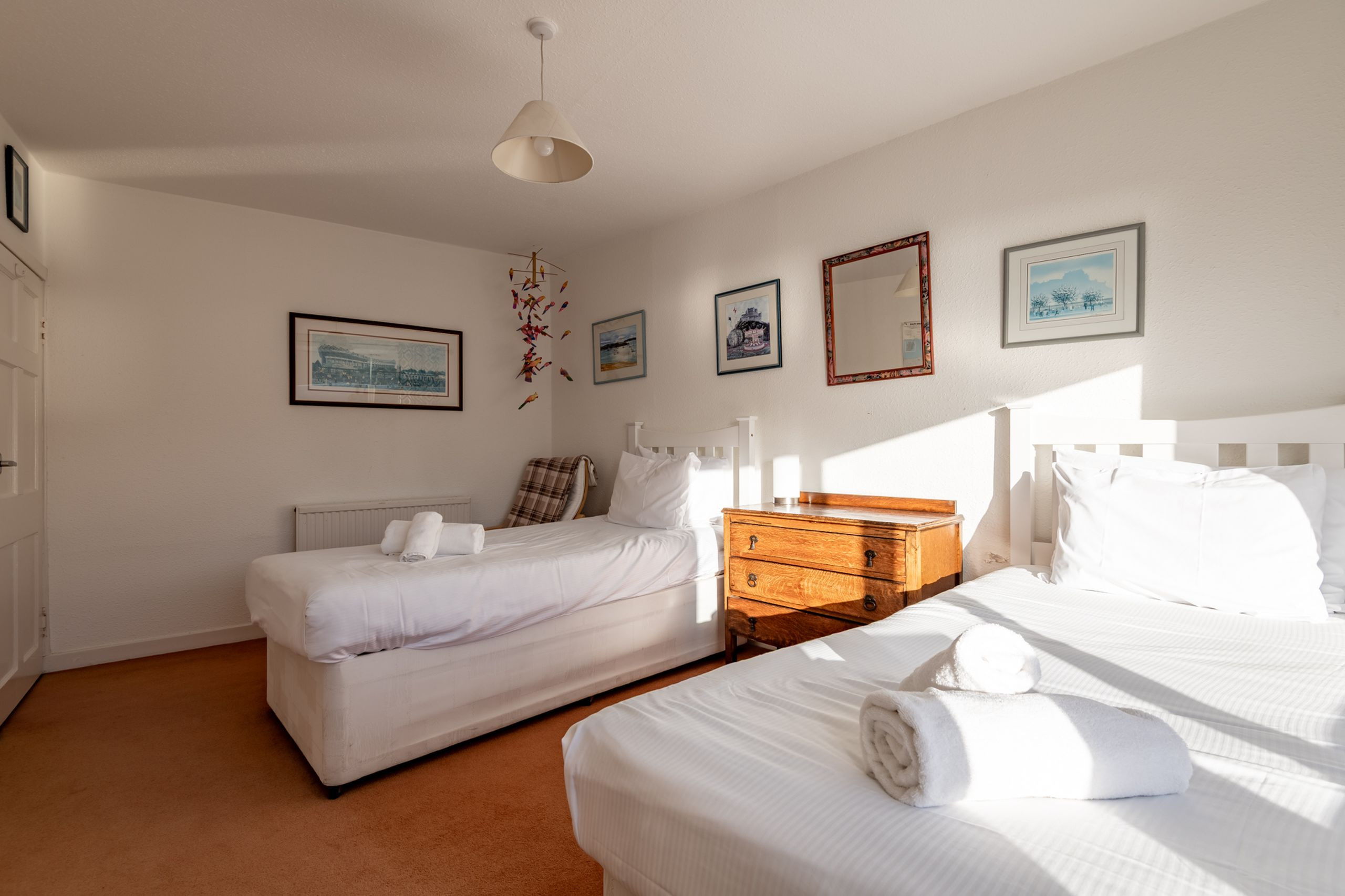 Two bedrooms make the cottage a great choice for families or friends. There’s a double bedroom, plus a twin bedroom with two single beds; a double inflatable bed with built-in pump is also available for extra flexibility (guests should bring their own bedding for this). A modern bathroom with shower enclosure, WC and wash hand basin completes the layout. While there’s no private garden, you do have an exterior bench at the front – perfect for watching the light change over the water – and with the beach just moments away, the shoreline effectively becomes your extended “back garden”.