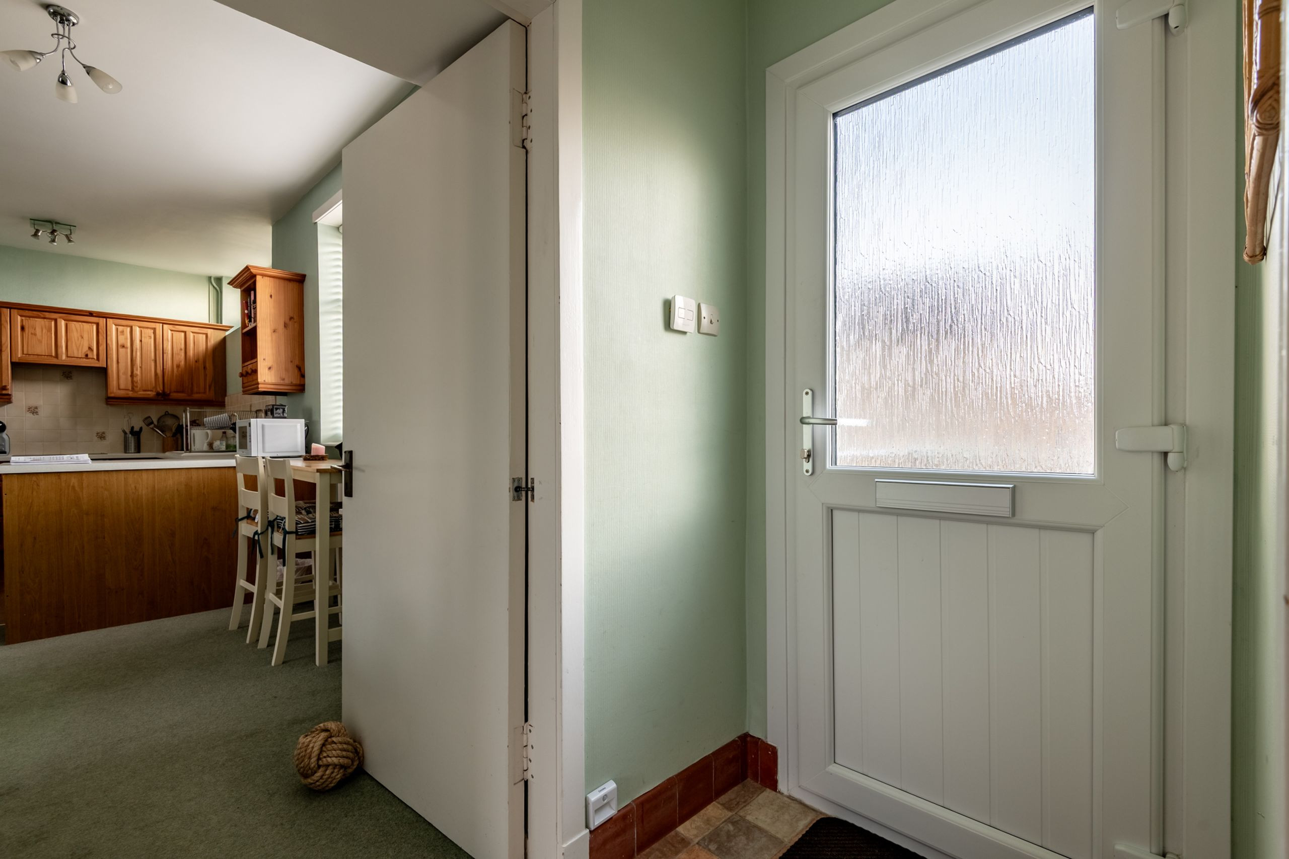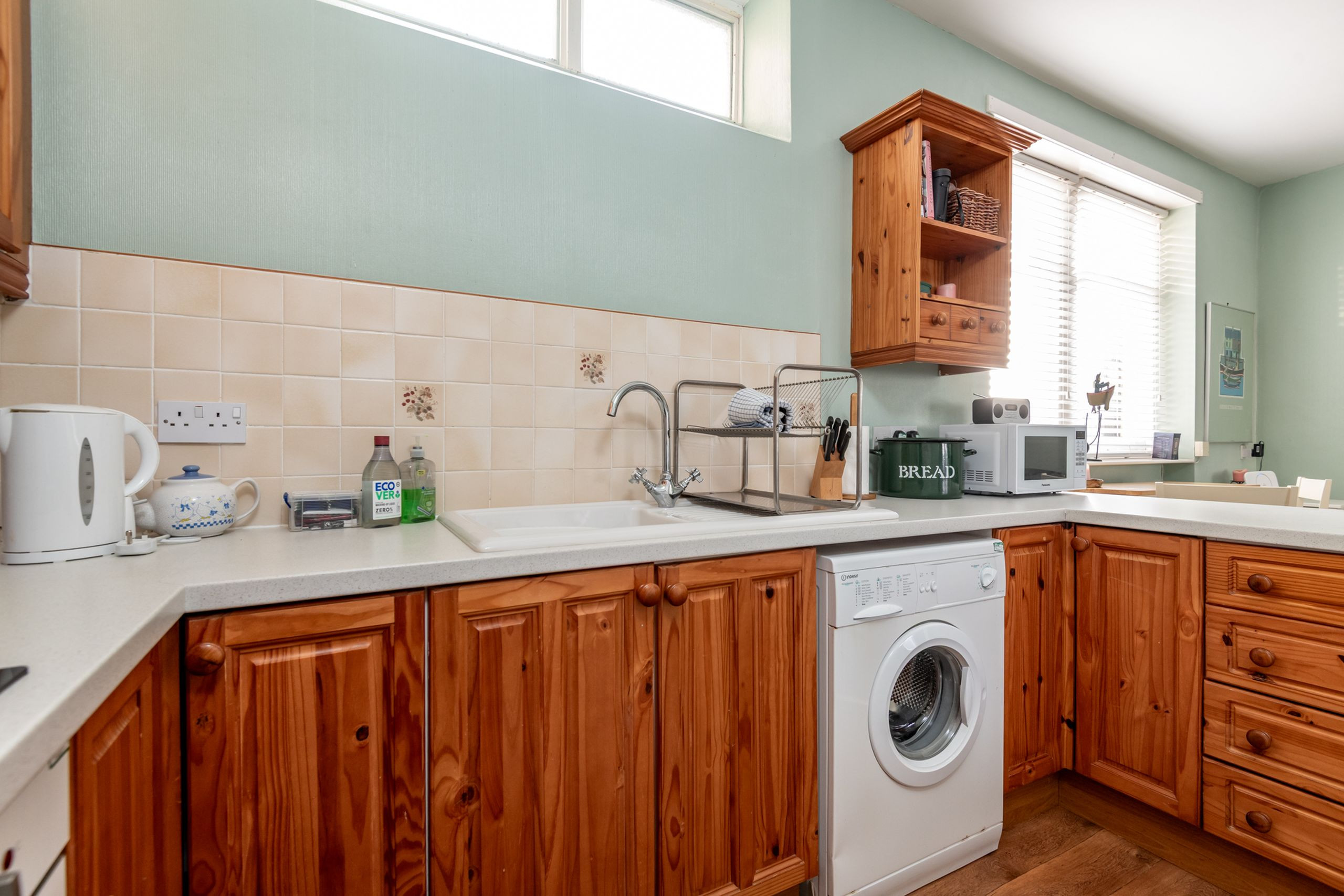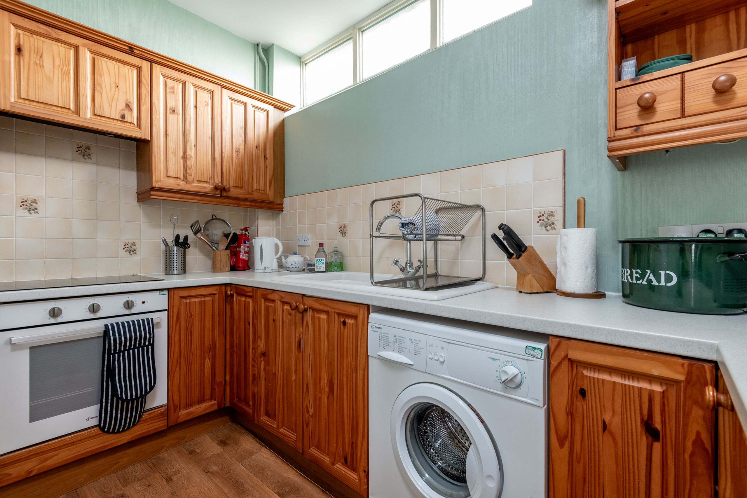 Inside, the main open-plan lounge, dining and kitchen area feels light and spacious, with large windows on both sides bringing in plenty of natural light. Two comfy two-seater sofas, occasional tables, lamps, a TV with Freeview and DVD player create a relaxed space to unwind after a day on the beach or exploring the East Neuk. The dining table seats four, while the fitted kitchen keeps self-catering simple, with hob, oven, extractor, fridge-freezer, washing machine, microwave and cafetière on hand for easy breakfasts and casual suppers.