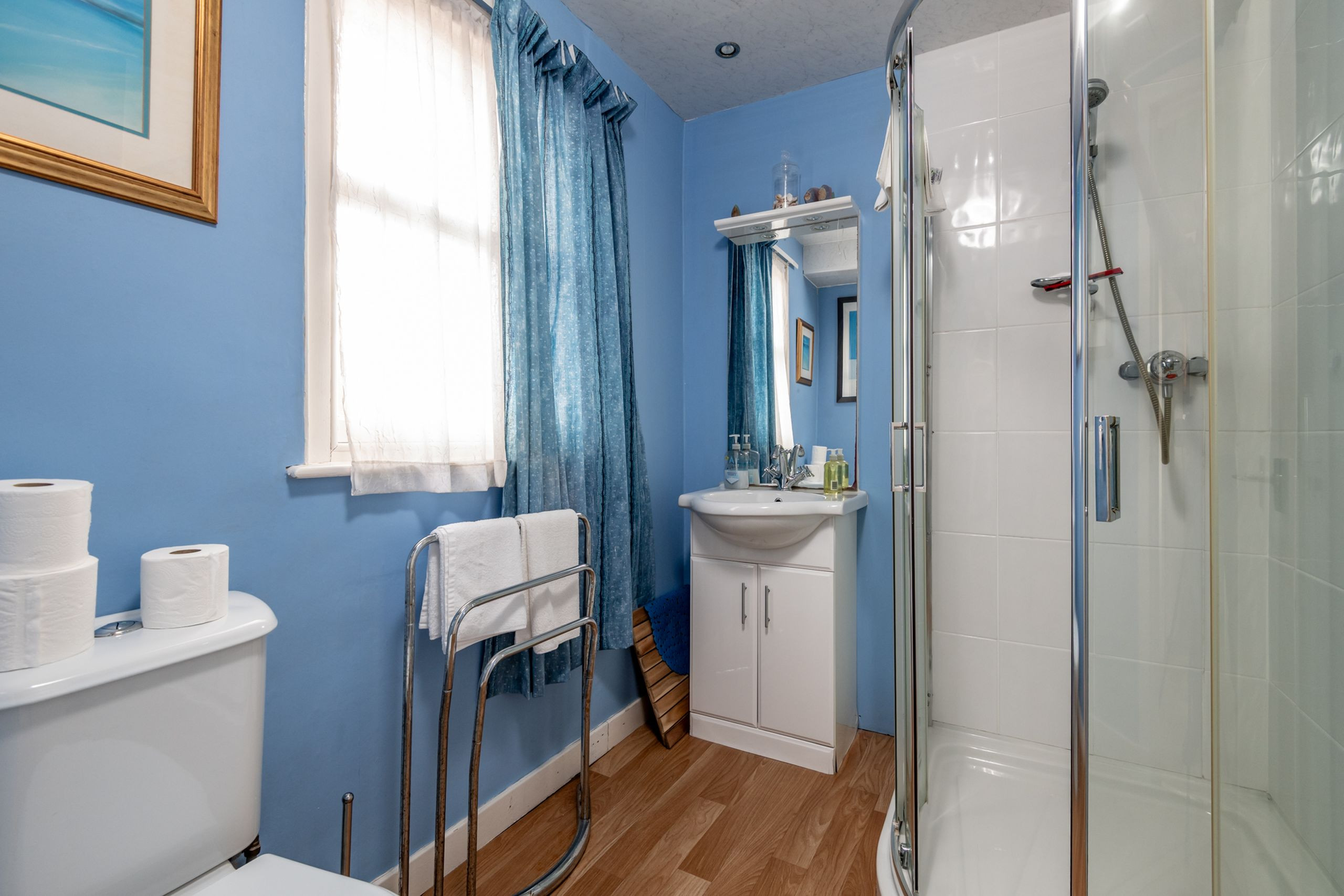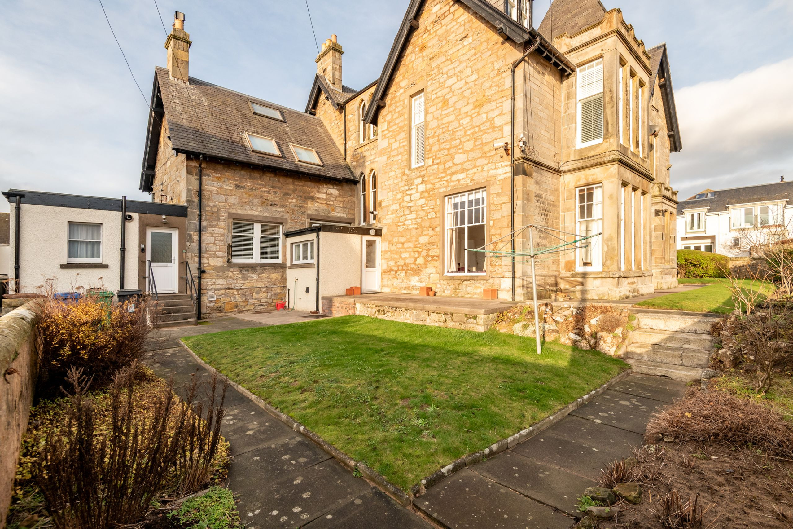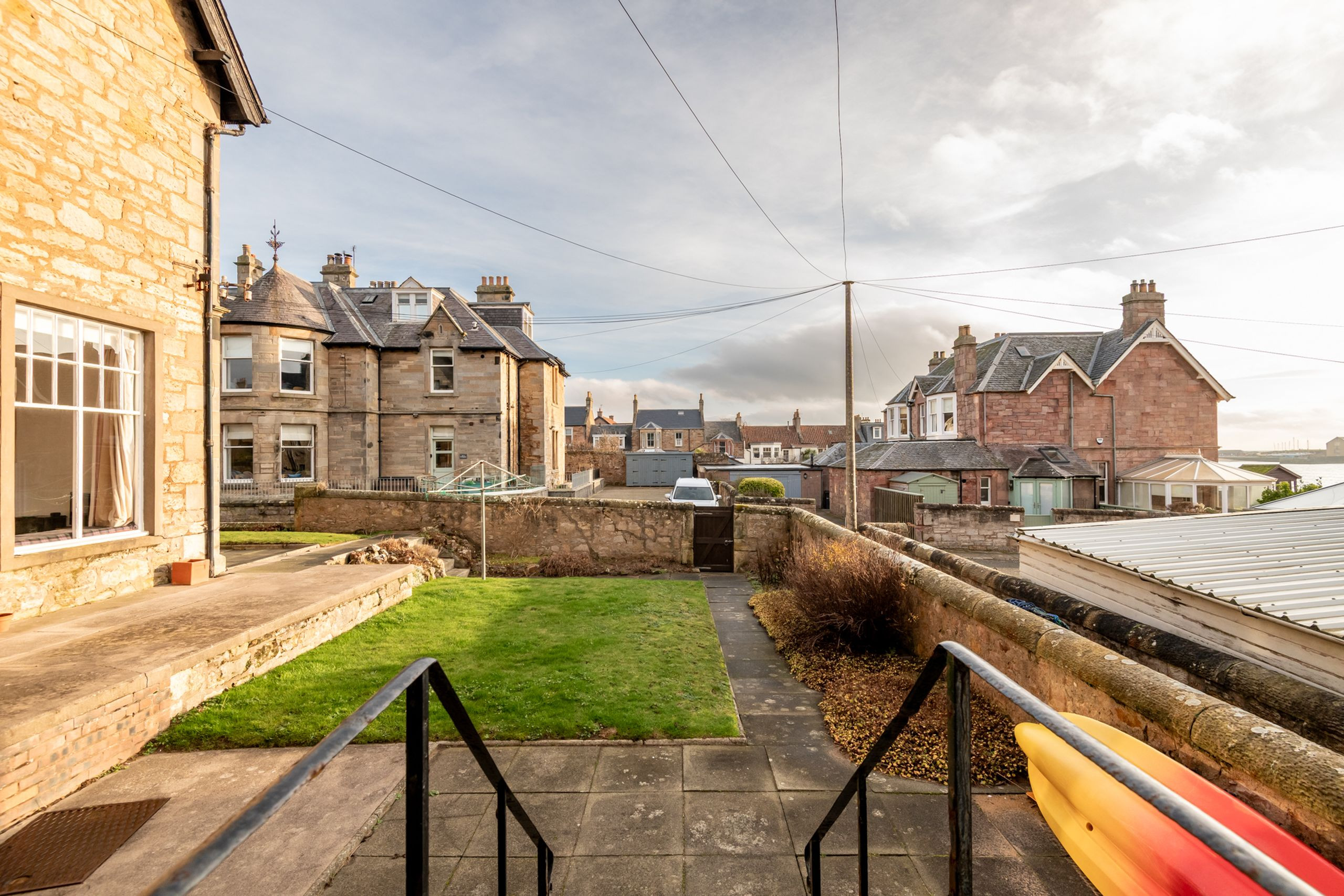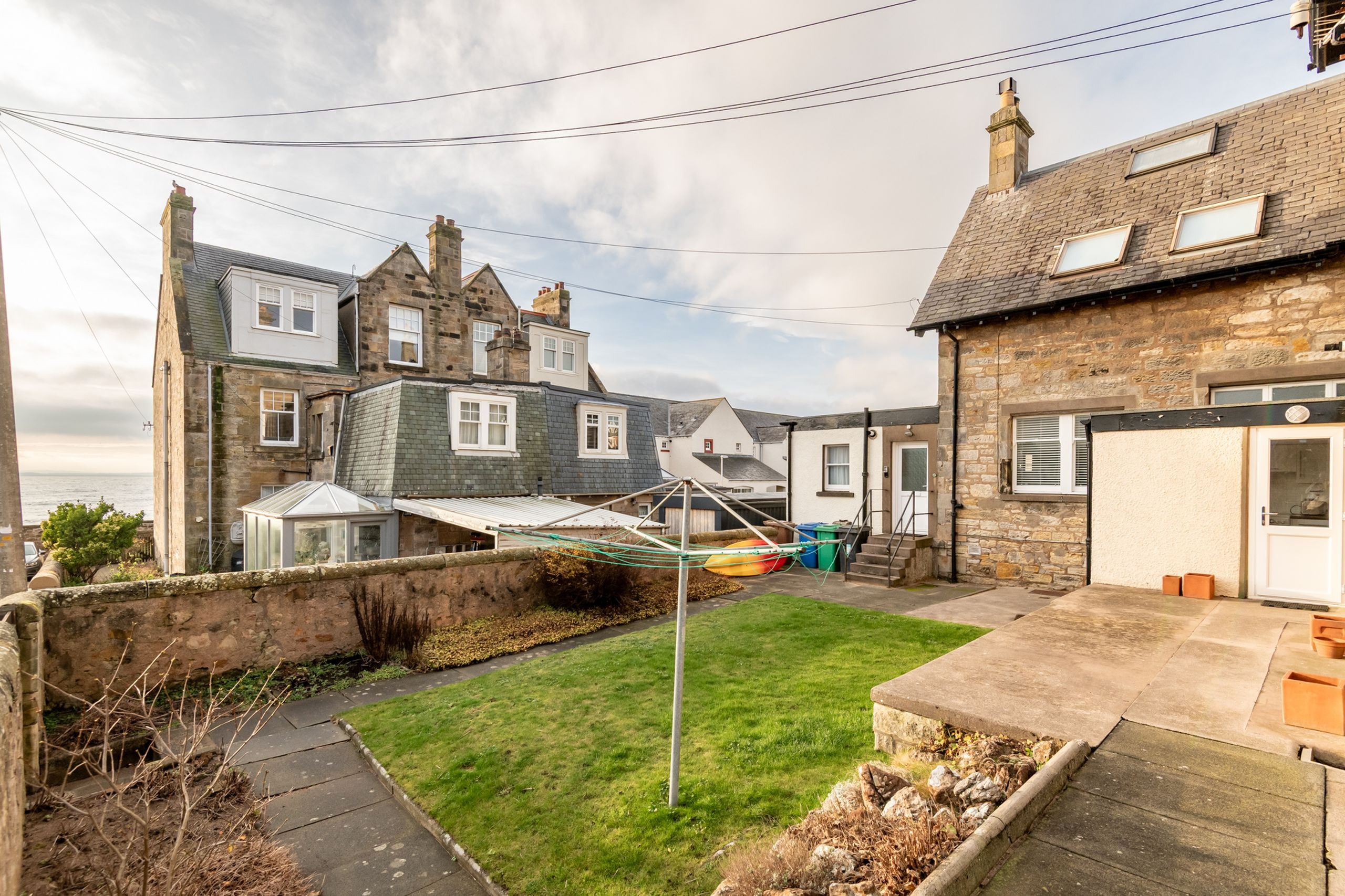 Outside, the communal garden is a real sun trap, with a central lawn and rotary clothes dryer that tend mainly to be used by Flats 1 and 2. A gate from the garden leads straight to the lane, and from there a further gate in the sea wall takes you directly onto the beach. From this peaceful corner of Elie you’re well placed for coastal walks, sea swims, local cafés and days out to nearby St Andrews and the wider East Neuk, with our local team on hand for support during your stay.