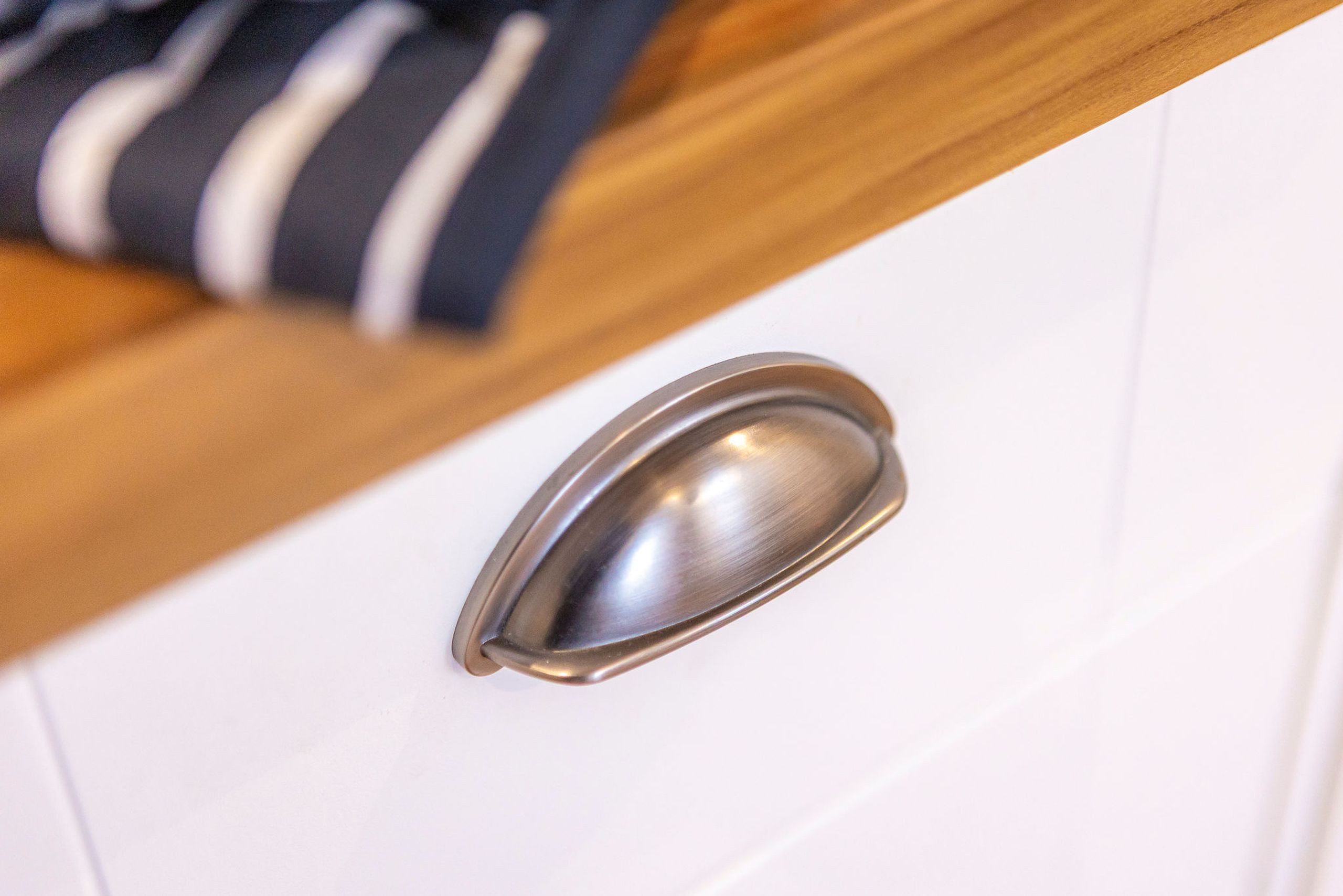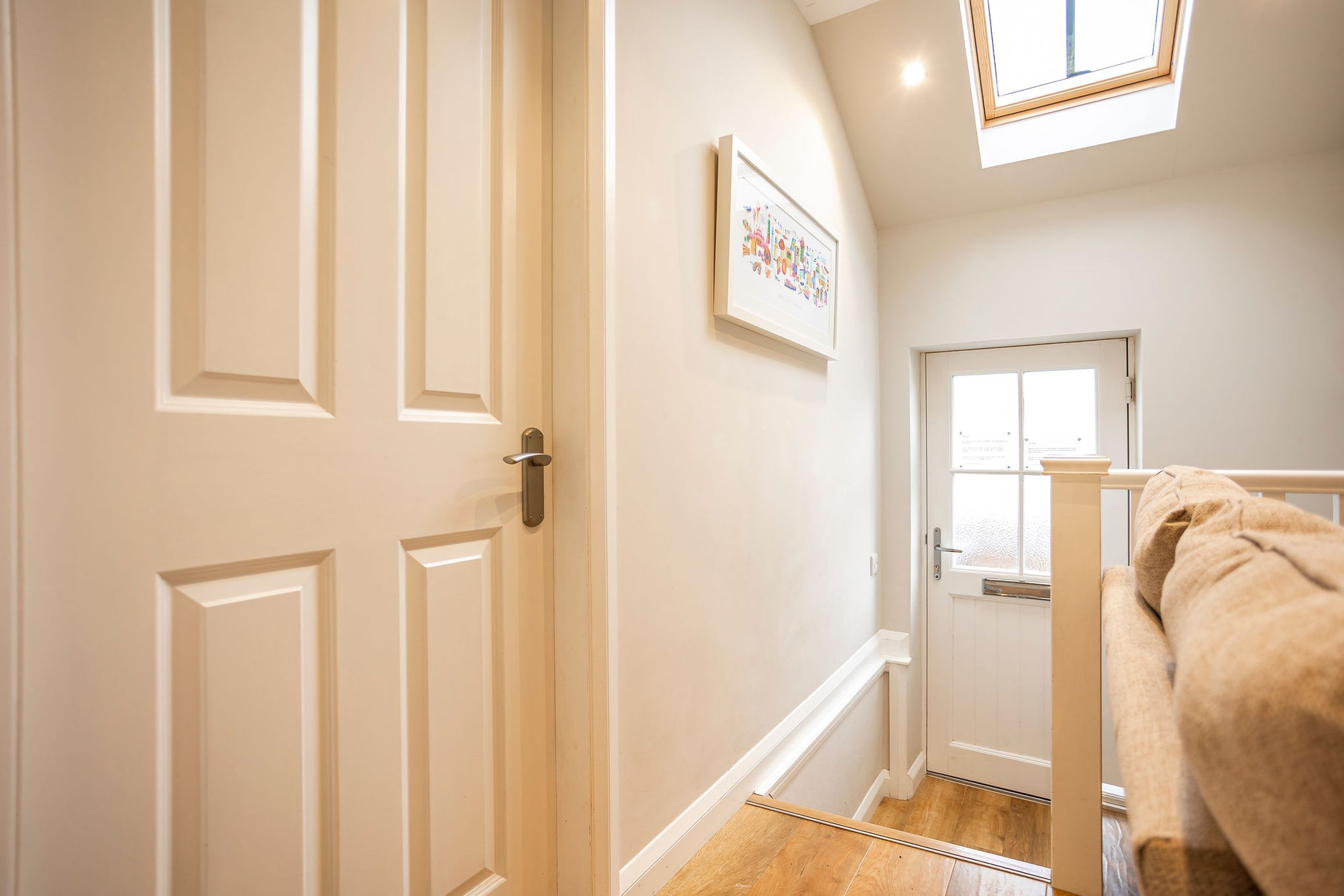 The luxury fitted kitchen overlooks the private patio and comes well equipped with gas hob, electric oven, integrated extractor, dishwasher, fridge-freezer, microwave, Nespresso machine, and stylish Smeg kettle and toaster, keeping self-catering simple and enjoyable. The tranquil master bedroom has a king-size bed, fitted wardrobe and overhead storage, with a large roof window giving a lovely airy feel. A second bedroom, remodelled in 2022, offers two single beds, bedside table with lamp and access to a utility cupboard with washing machine.