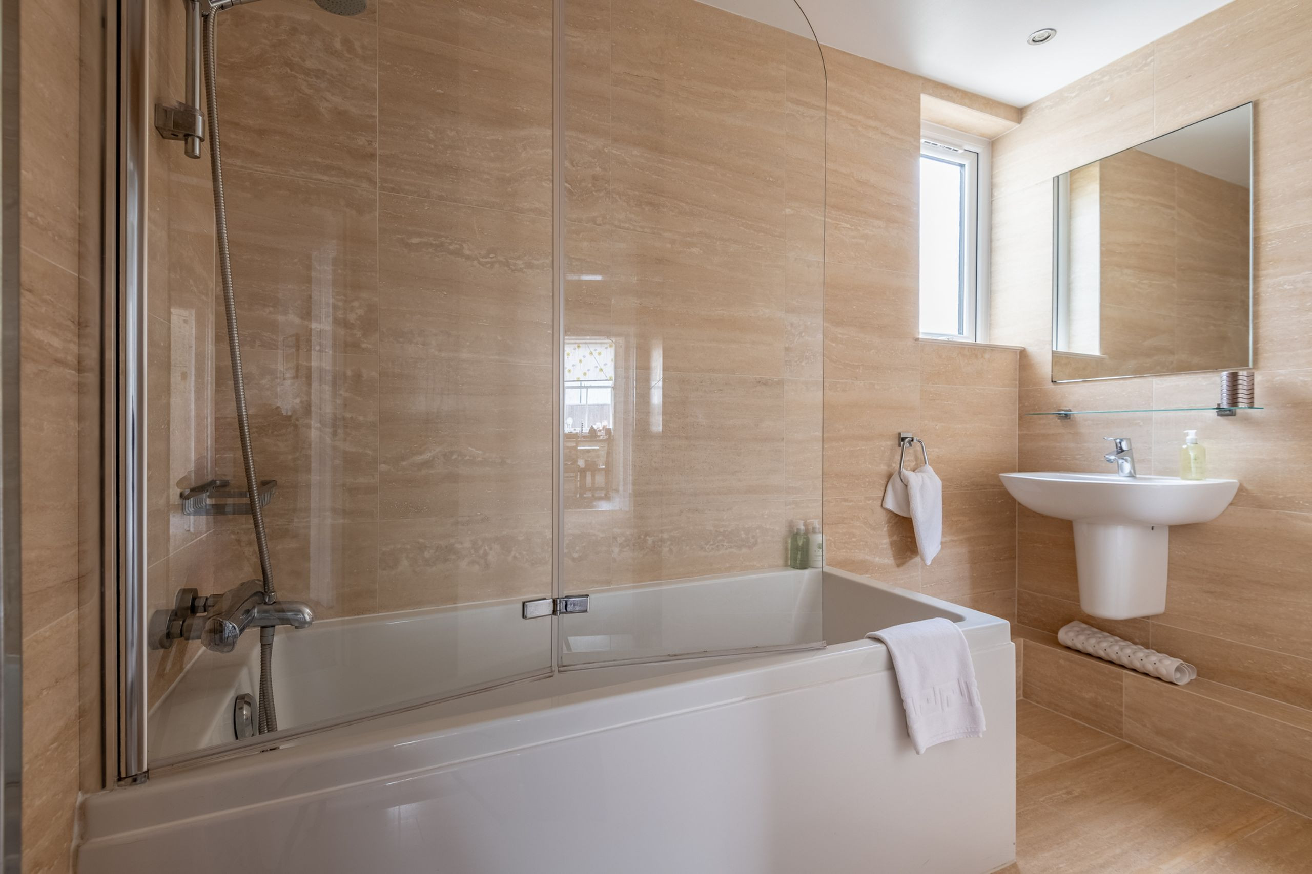 There’s a family bathroom with bath and shower over, WC and wash hand basin, as well as a separate shower room with WC, basin and wet-room style shower with a small step (around 2 inches) for easier access. A large porch provides handy extra space for storing golf clubs, beach gear and wetsuits.