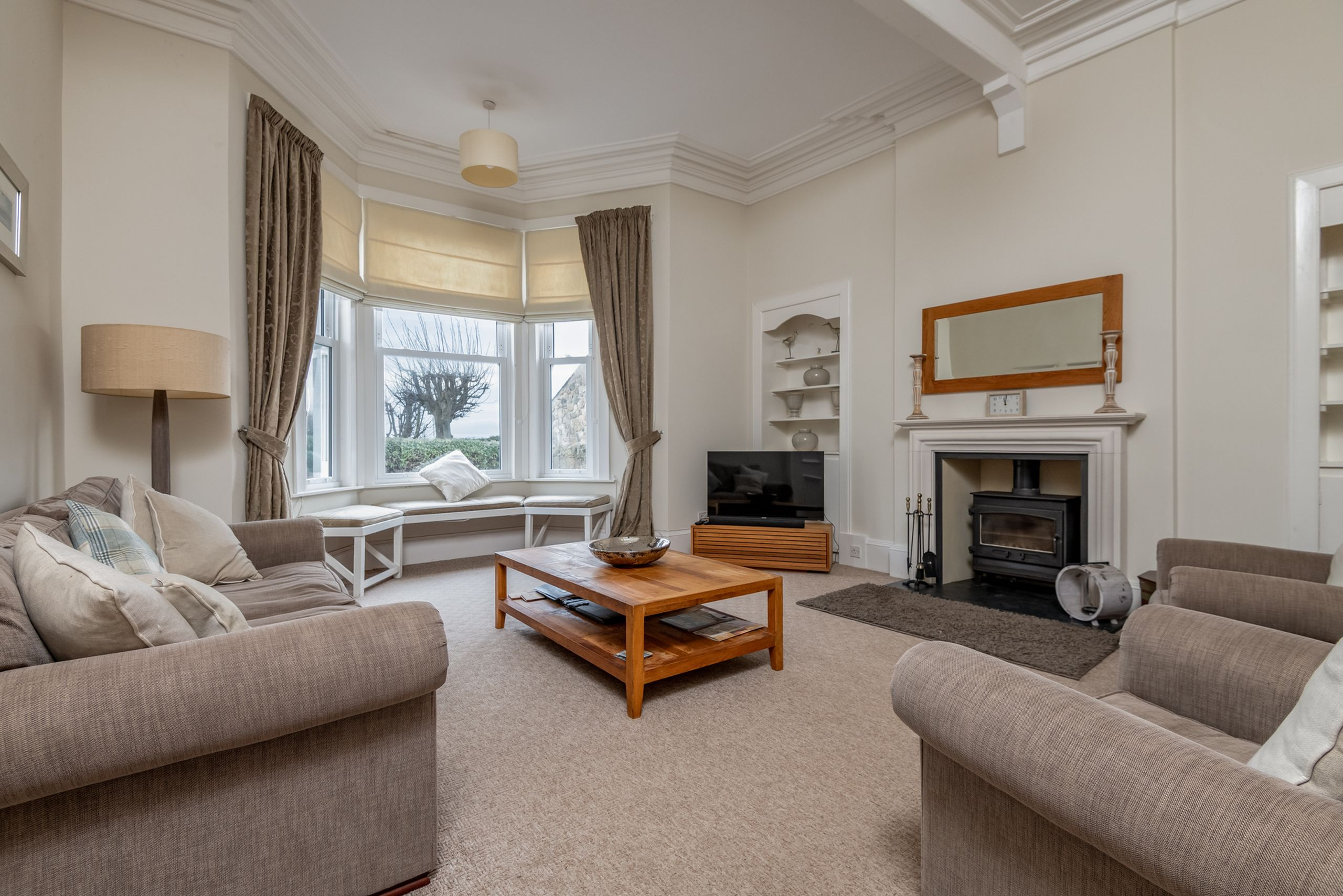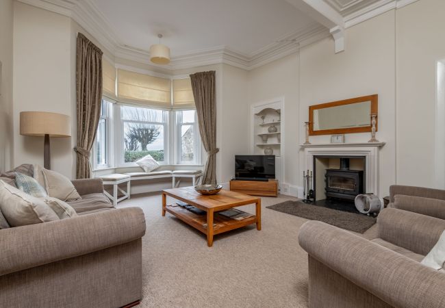 The cosy sitting room has a wood-burning stove, TV, DVD player and views towards the sea – perfect for curling up on cooler evenings. Sleeping is arranged across three comfortable bedrooms: a master with king-size bed and full-length mirror, plus two twin rooms each with two single beds, giving flexible options for families or groups of friends.