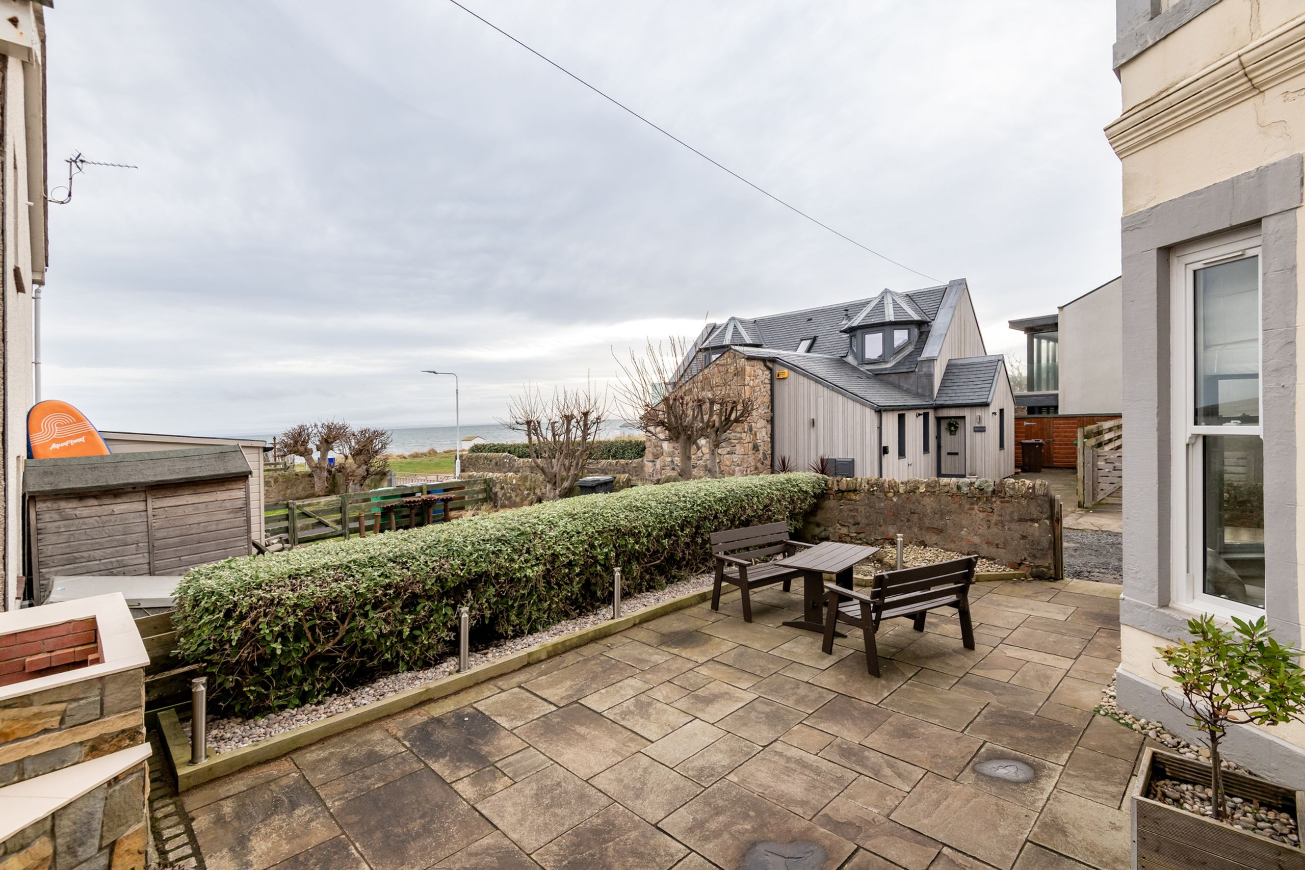 Outside, the enclosed garden/patio gives you a sheltered place to relax, complete with a brick-built barbecue and sea views, with the beach just moments away when you’re ready to wander down to the sand.