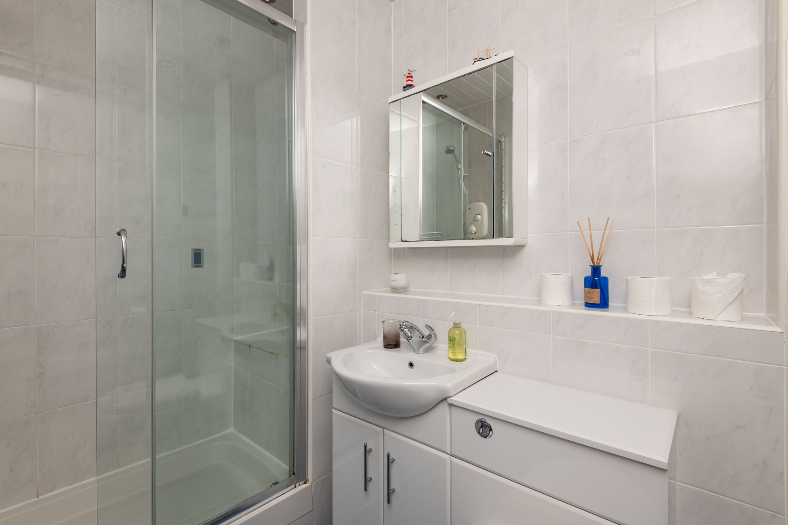Both bedrooms sit peacefully to the rear with open outlooks: a calm king-size room and a twin with two single beds, making the layout ideal for couples, friends or a small family. A fresh, modern shower room with WC, wash hand basin and shower cubicle completes the space.