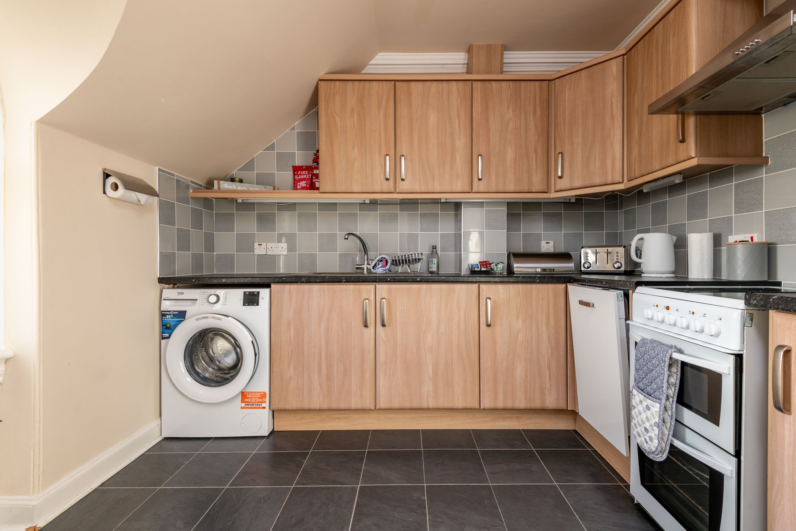 The separate kitchen also faces the front and is fitted with modern units and plenty of worktop space. It’s well equipped for self-catering, with electric hob and oven, washing machine, dishwasher, fridge-freezer, microwave and even a liquidiser – handy for easy breakfasts, picnics or simple suppers.