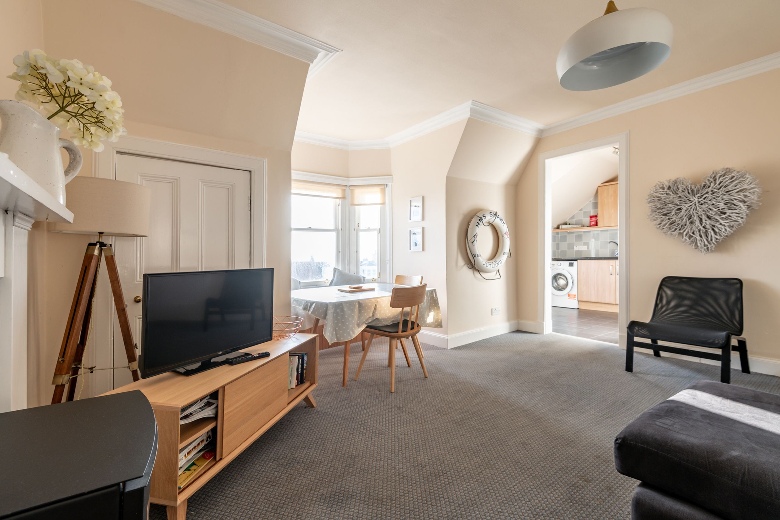 Behind double storm doors, a smart communal hall and staircase lead up to the apartment. Inside, the bright lounge/dining room is the star of the show, with a bay window framing those lighthouse and sea views, comfortable seating for four, a dining table and Smart TV – ideal for relaxed evenings after a day on the beach, the coastal path or nearby golf courses.