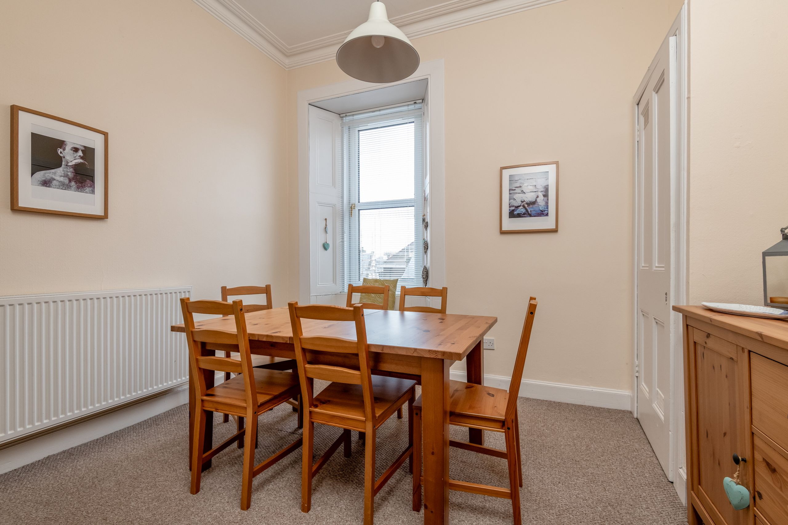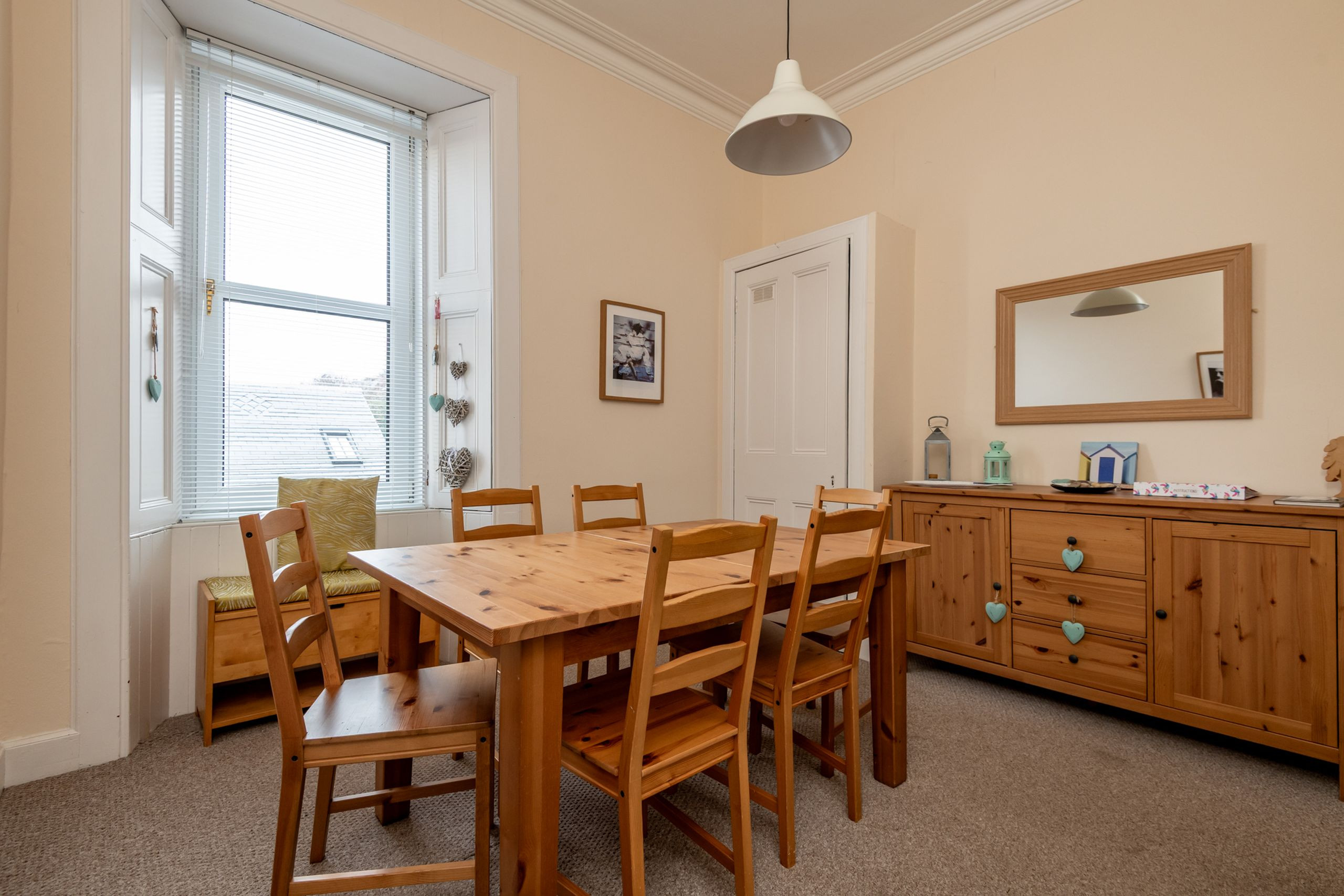 At ground level, a private entrance at the rear leads into a reception hall with a handy cupboard for golf clubs and beach gear, plus a staircase up to the main accommodation. The bright lounge feels spacious and welcoming, with a corner bay and side windows, comfortable sofa and chairs, coordinated soft furnishings and a TV with Freeview. Next door, the separate dining room offers a generous table with six chairs and a matching sideboard – ideal for relaxed dinners or board games after a day on the sand.