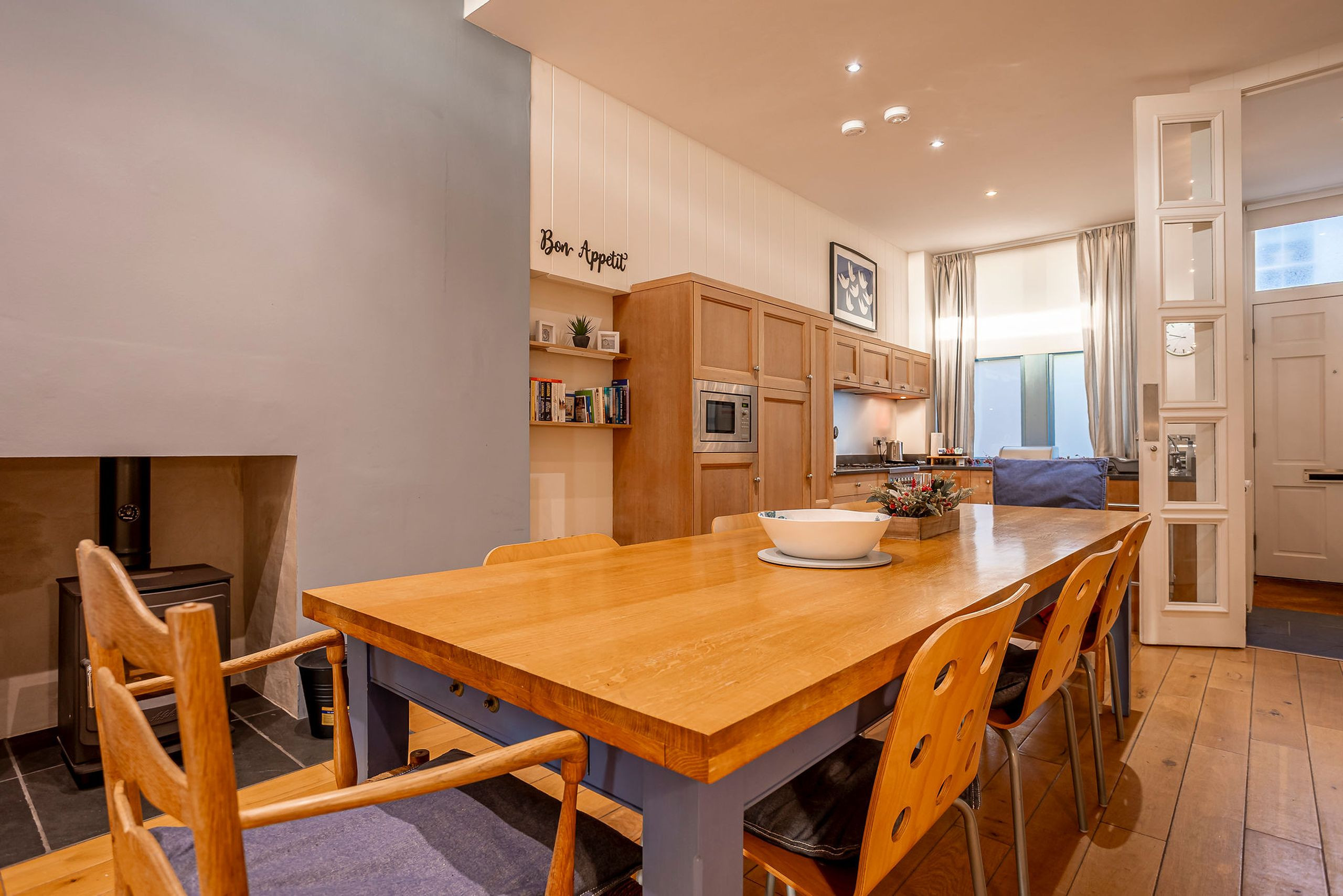 Inside, solid oak flooring runs through the main living area, where the kitchen, dining space and sitting room all flow together towards floor-to-ceiling patio doors and that incredible view. The sleek kitchen is equipped with all the essentials – gas hob, electric oven, microwave, dishwasher and plenty of storage – while the dining area has a large table and an original fire surround now housing a cosy wood-burning stove, perfect for cooler evenings. In the sitting room, comfy seating is positioned to soak up the sea, with the patio doors opening straight out to the terrace.