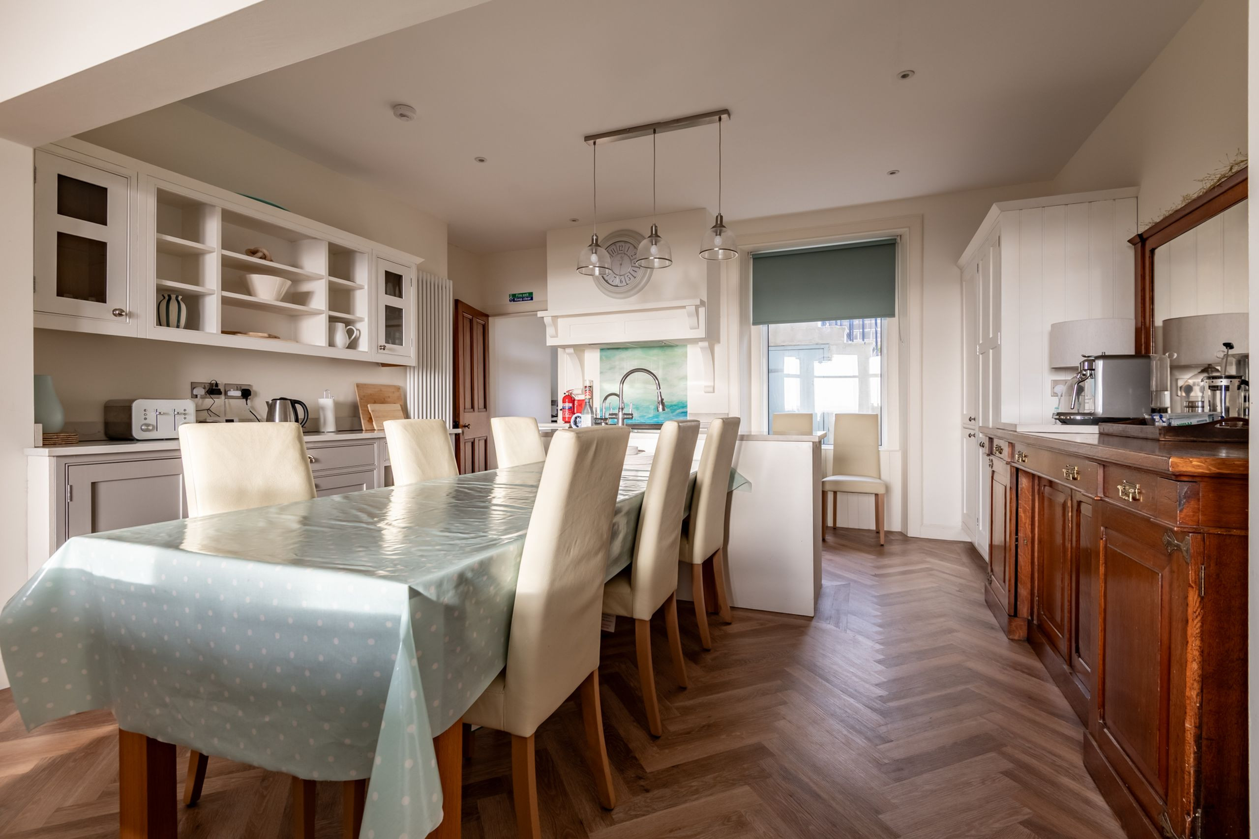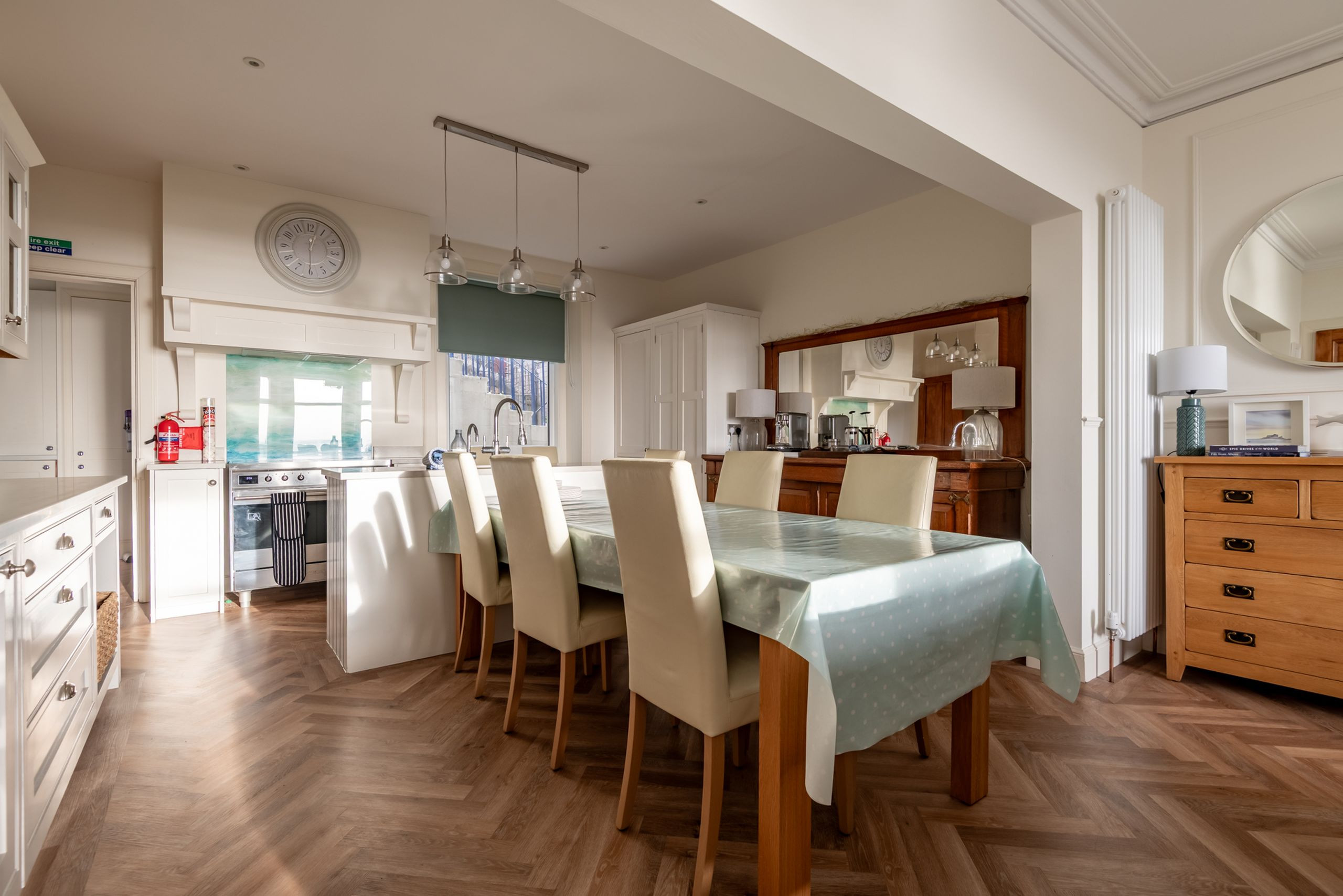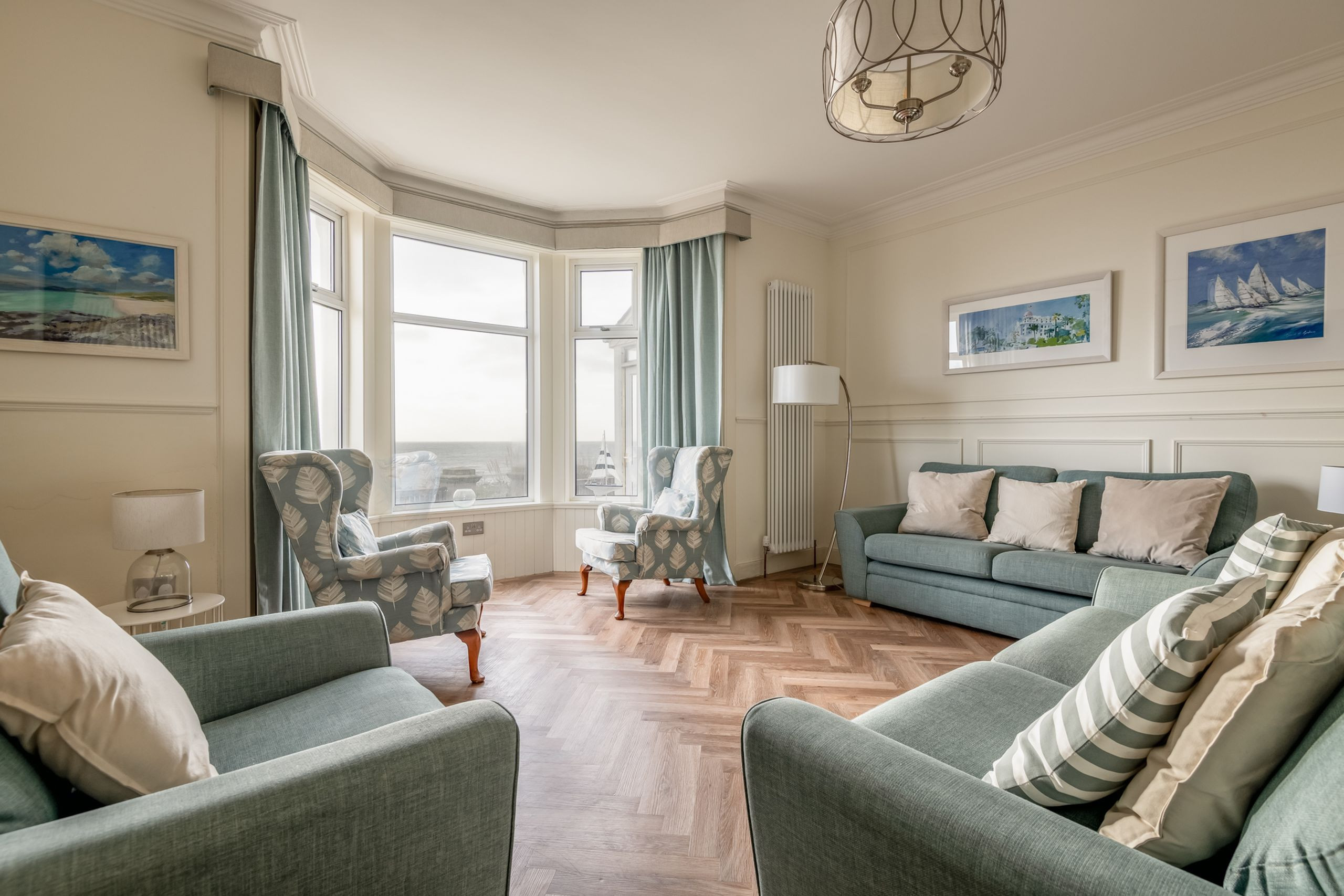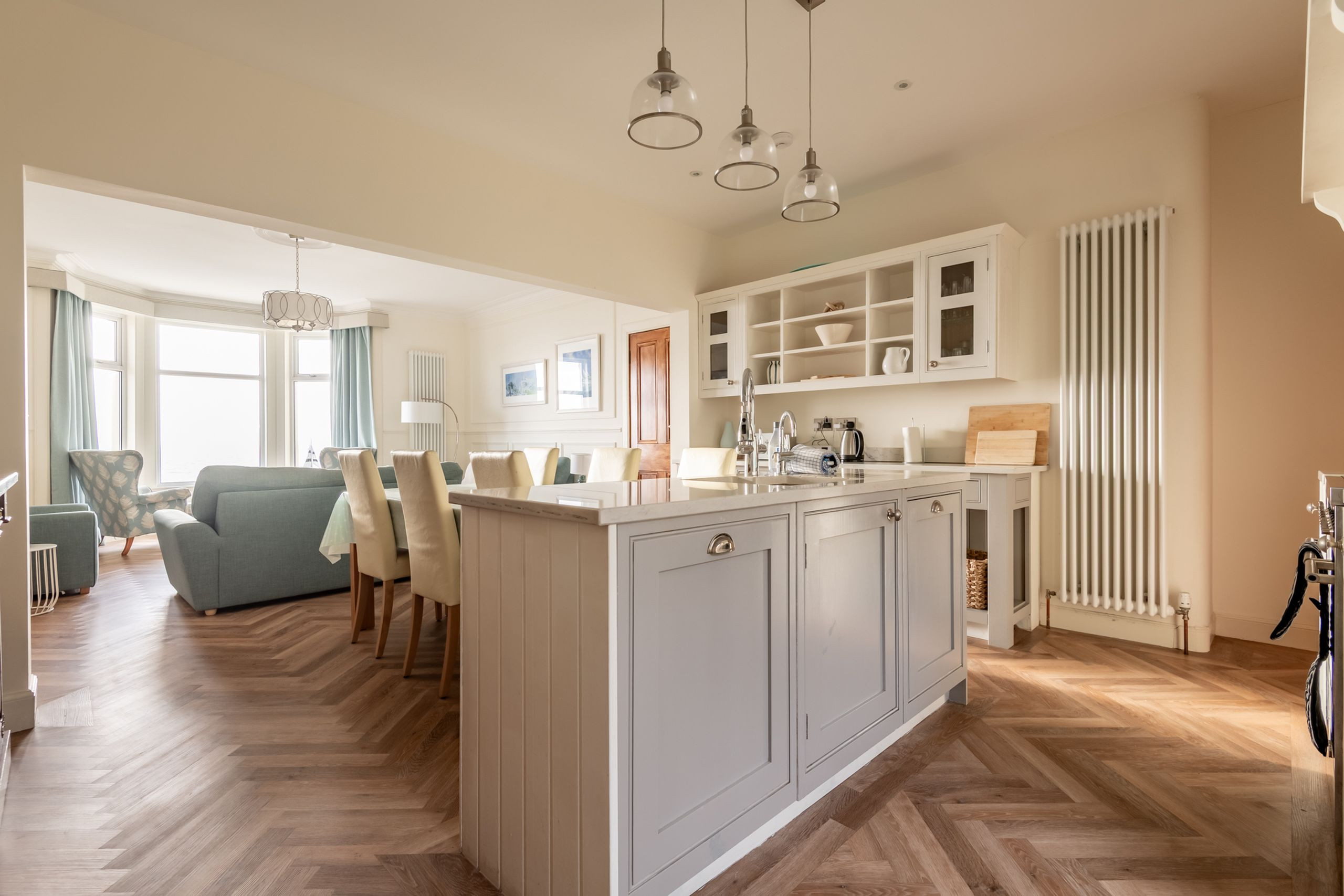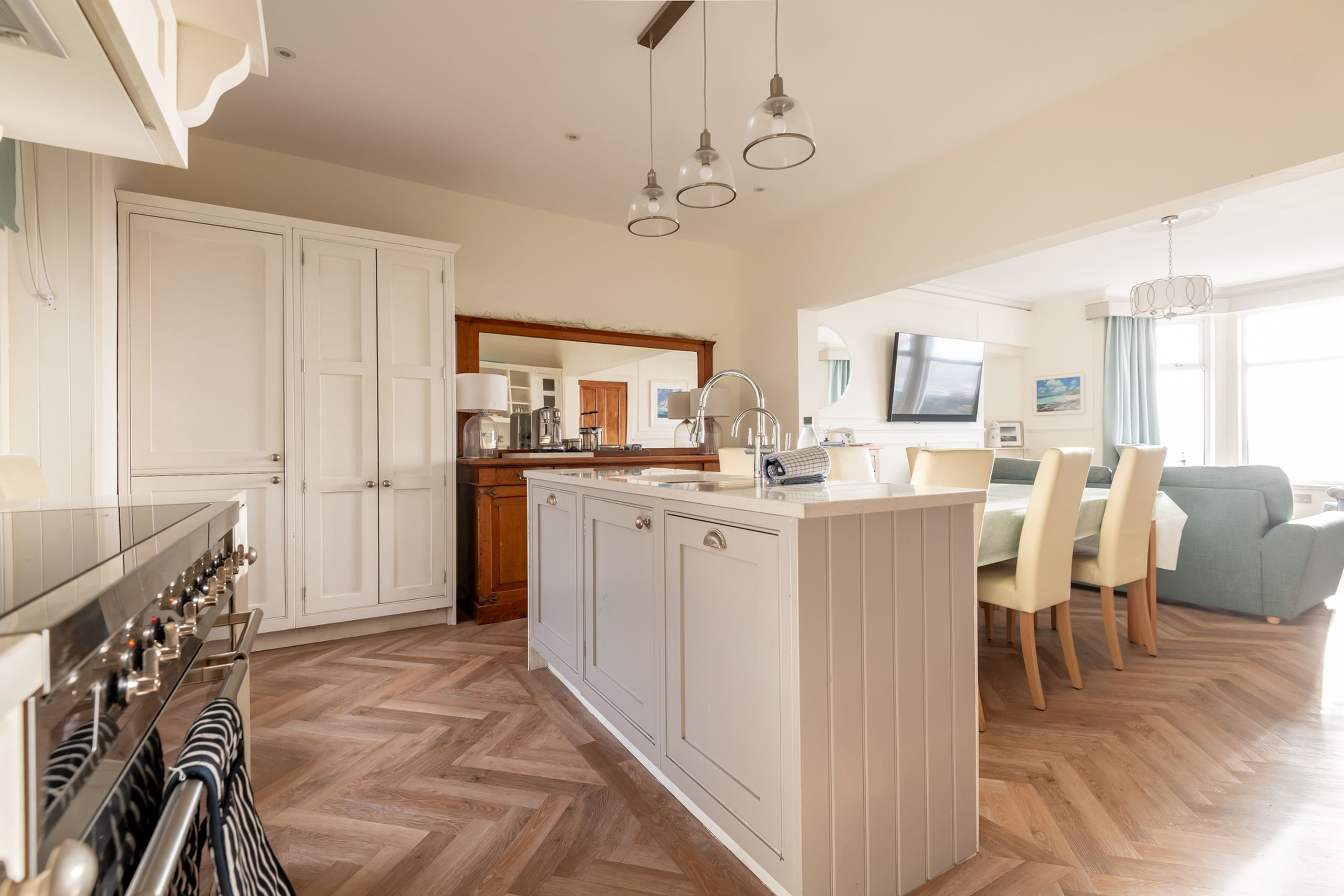 Inside, the tone is calm, bright and beautifully put together. An impressive entrance and L-shaped reception hall lead through to a stunning open-plan sitting, dining and kitchen space with high ceilings, panelling and Karndean flooring. A bay window frames those panoramic sea views, with contemporary sofas and “Sherlock” chairs perfectly positioned to watch the water. The generous dining table seats eight, while the luxury quartz-topped kitchen, complete with range cooker, instant hot water tap, dishwasher, fridge-freezer and coffee machine, is laid out for relaxed cooking and entertaining. A separate utility room keeps laundry and beach gear out of sight.