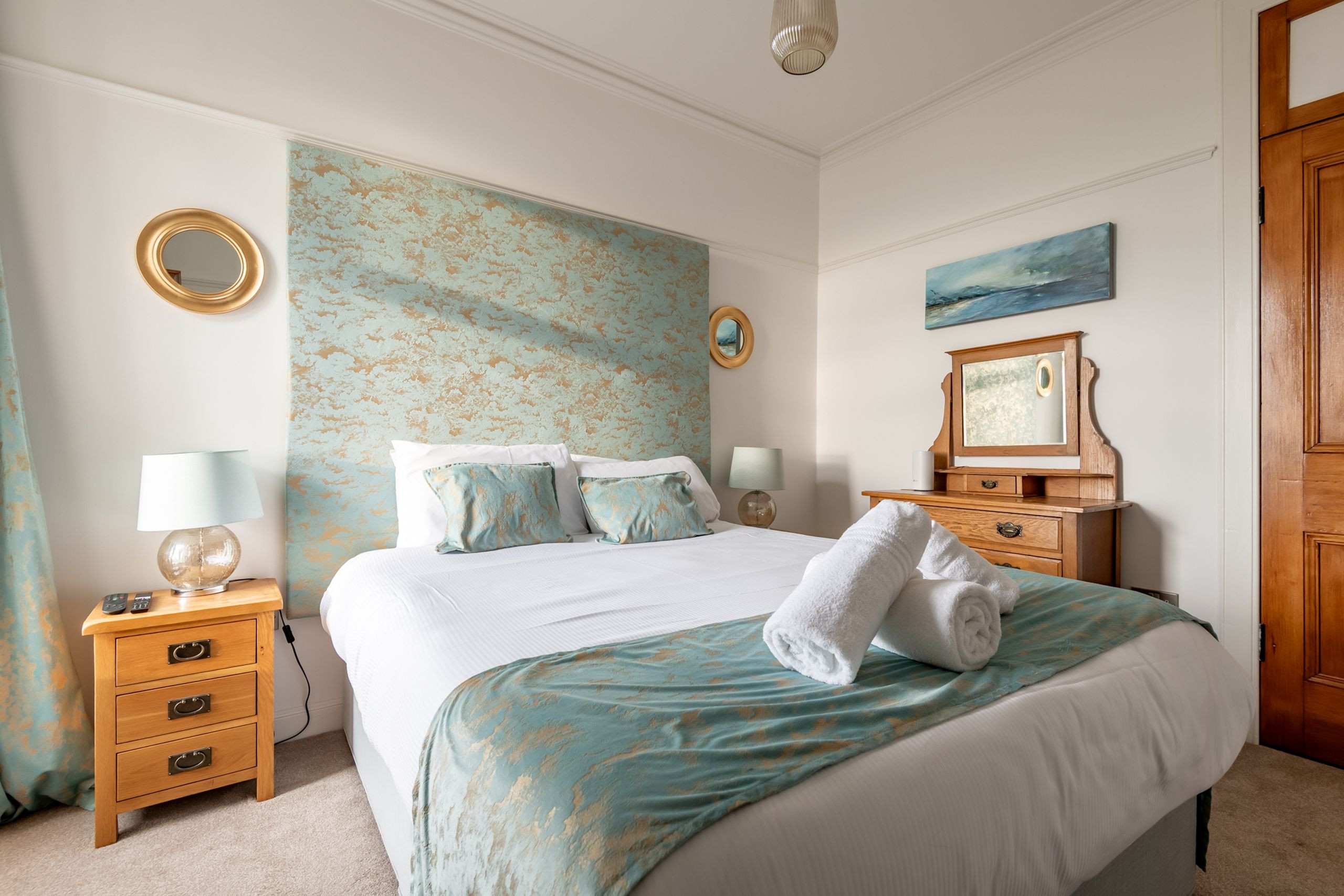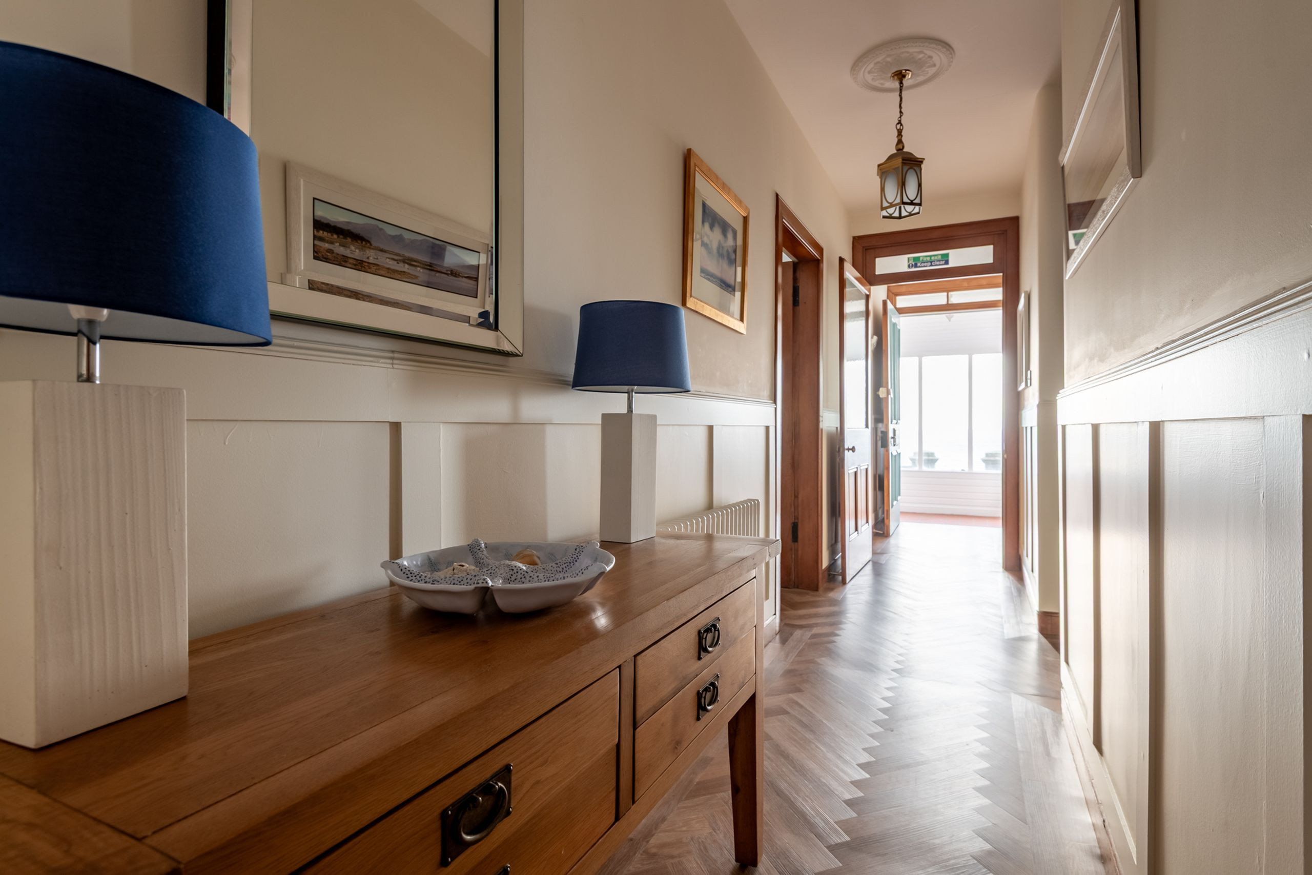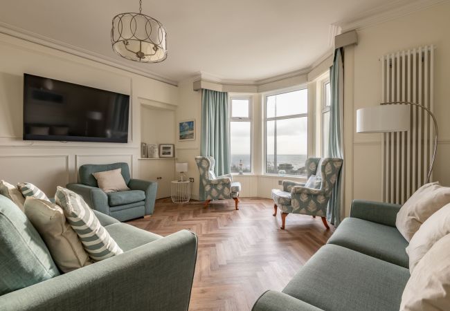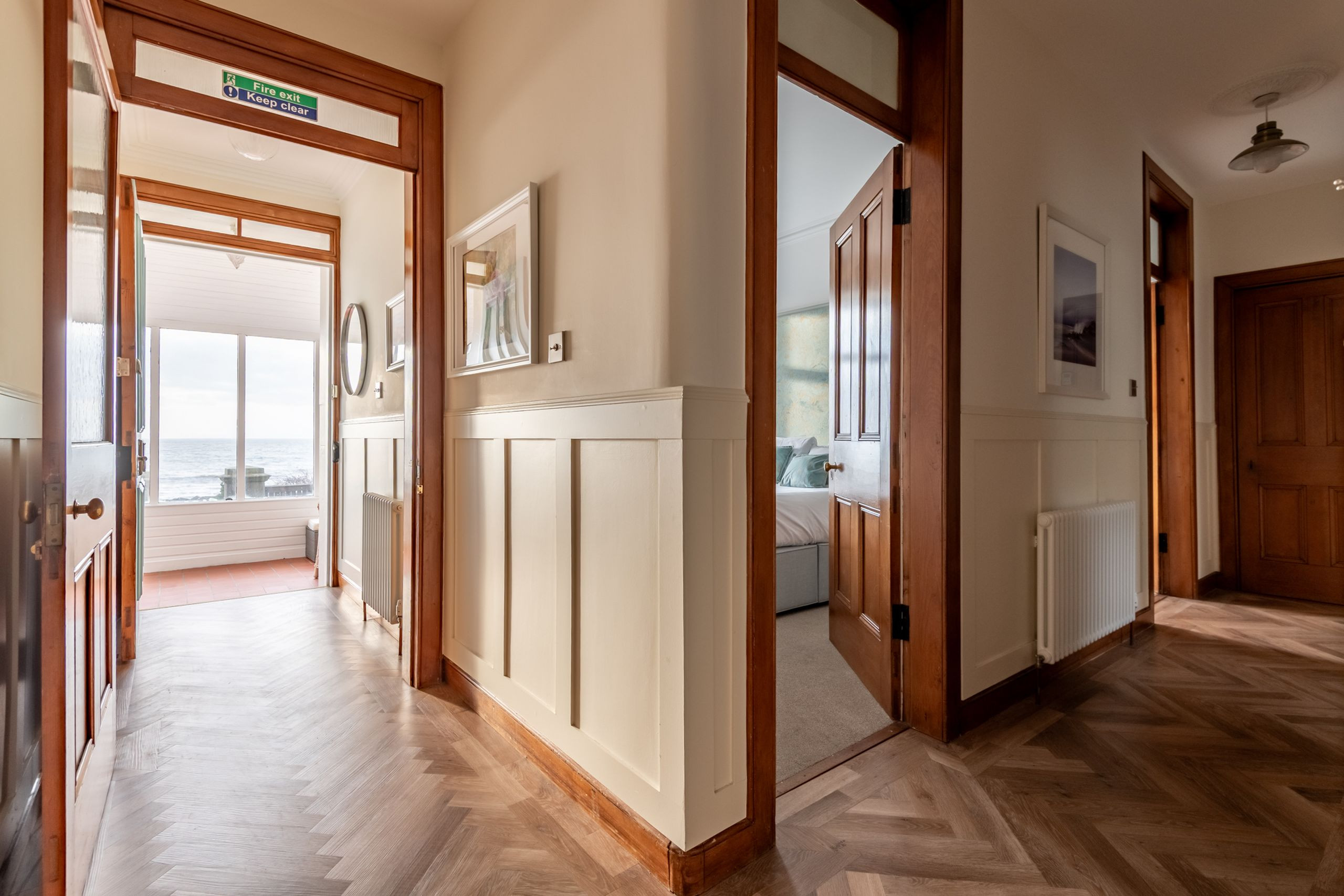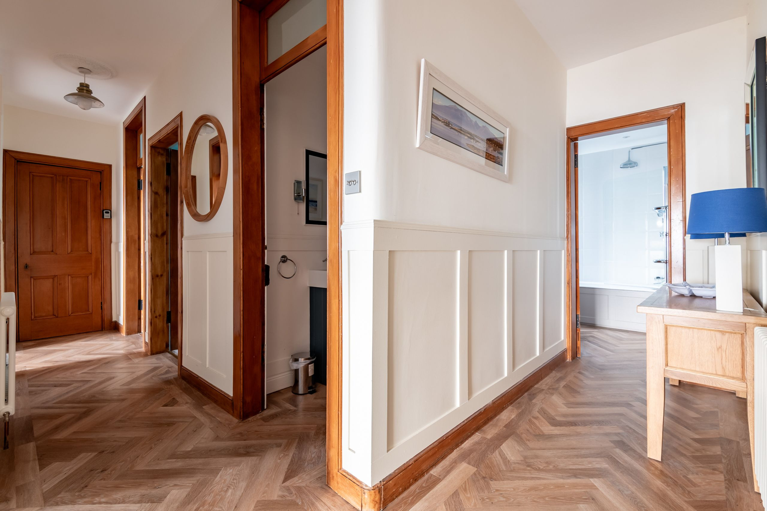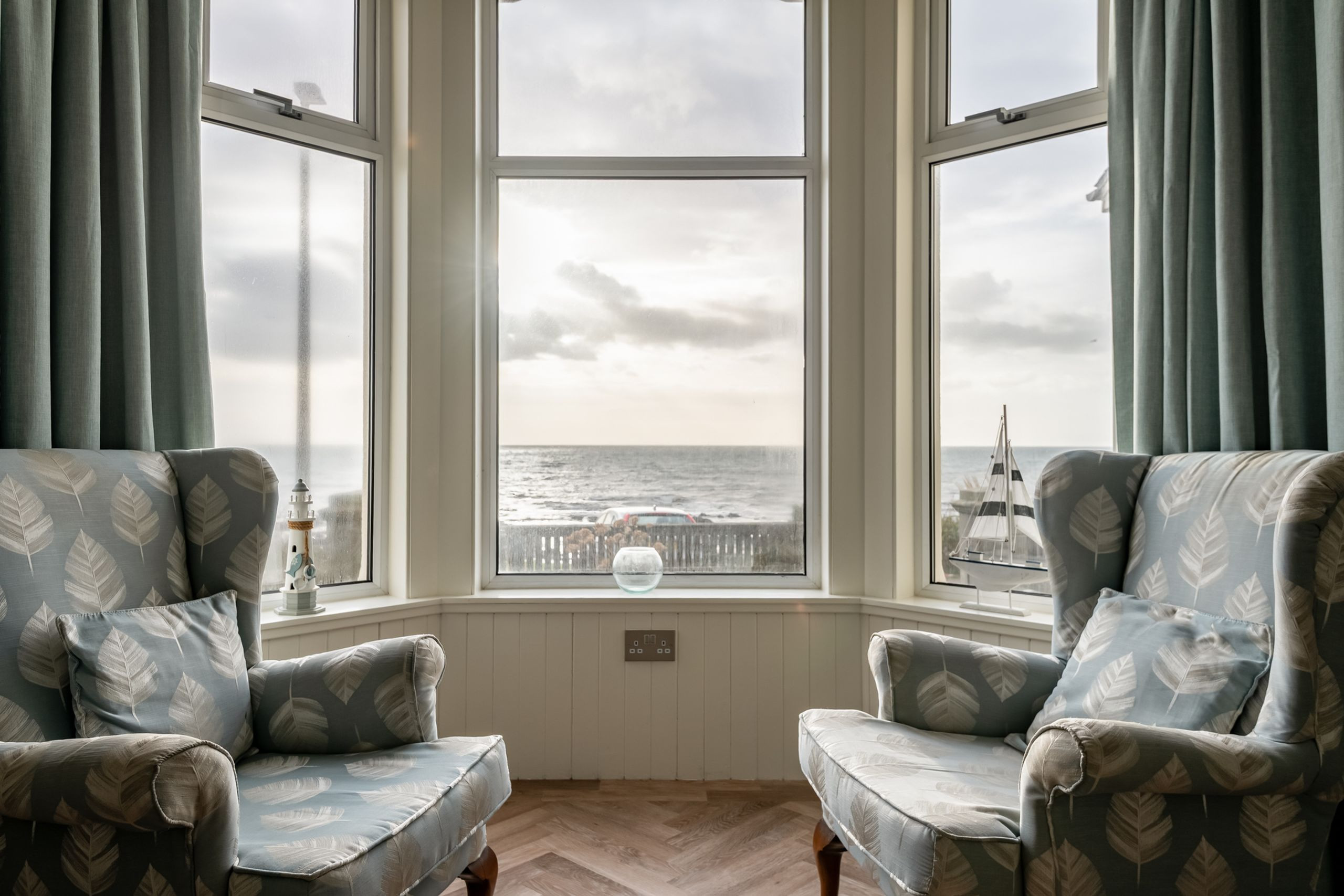 Inside, the tone is calm, bright and beautifully put together. An impressive entrance and L-shaped reception hall lead through to a stunning open-plan sitting, dining and kitchen space with high ceilings, panelling and Karndean flooring. A bay window frames those panoramic sea views, with contemporary sofas and “Sherlock” chairs perfectly positioned to watch the water. The generous dining table seats eight, while the luxury quartz-topped kitchen, complete with range cooker, instant hot water tap, dishwasher, fridge-freezer and coffee machine, is laid out for relaxed cooking and entertaining. A separate utility room keeps laundry and beach gear out of sight.