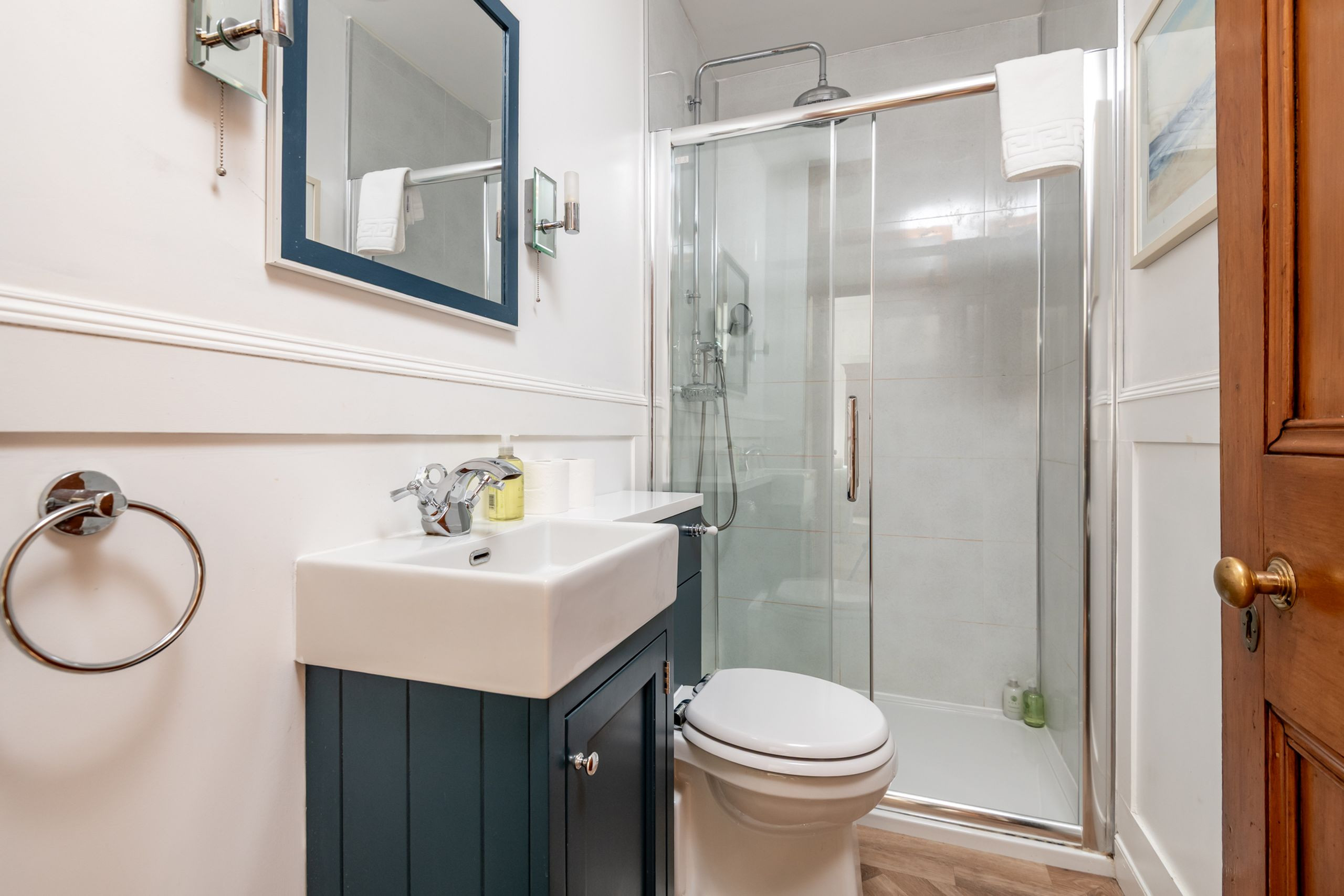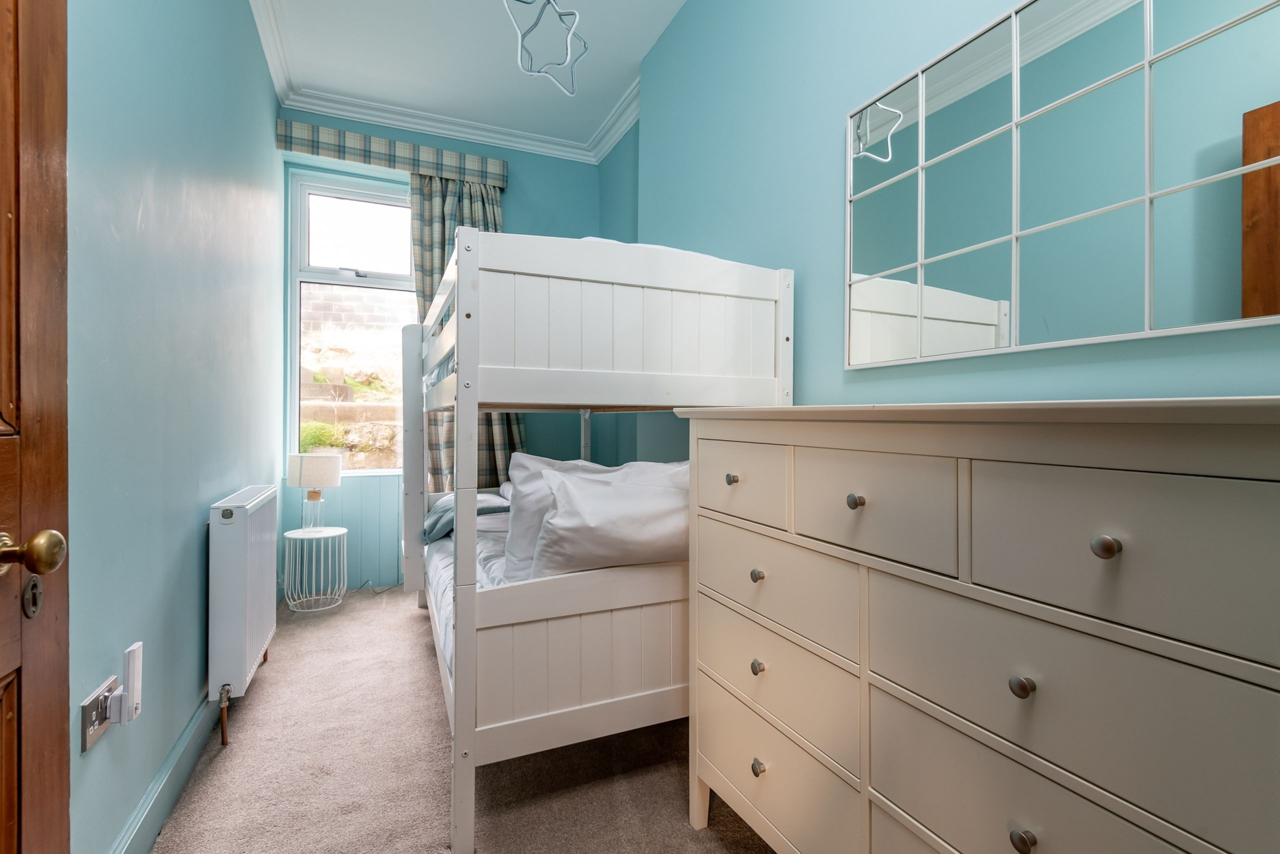 Three elegant king-size bedrooms – two to the front with sea views, one to the rear – offer boutique styling, traditional storage and Sky Glass TVs, while a fourth bedroom with full-size bunk beds makes a fun hideout for younger guests. A sleek shower room with rainfall enclosure and a stylish family bathroom with overhead rain shower mean there’s plenty of space for everyone to freshen up after a day on the sand or the nearby golf courses. Outside, the private lawn and patio in front of the villa are for guest use, and a side path links to the back door and straight on to the coastal path. Parking is available a short walk away at the Temple Car Park (around 200m).