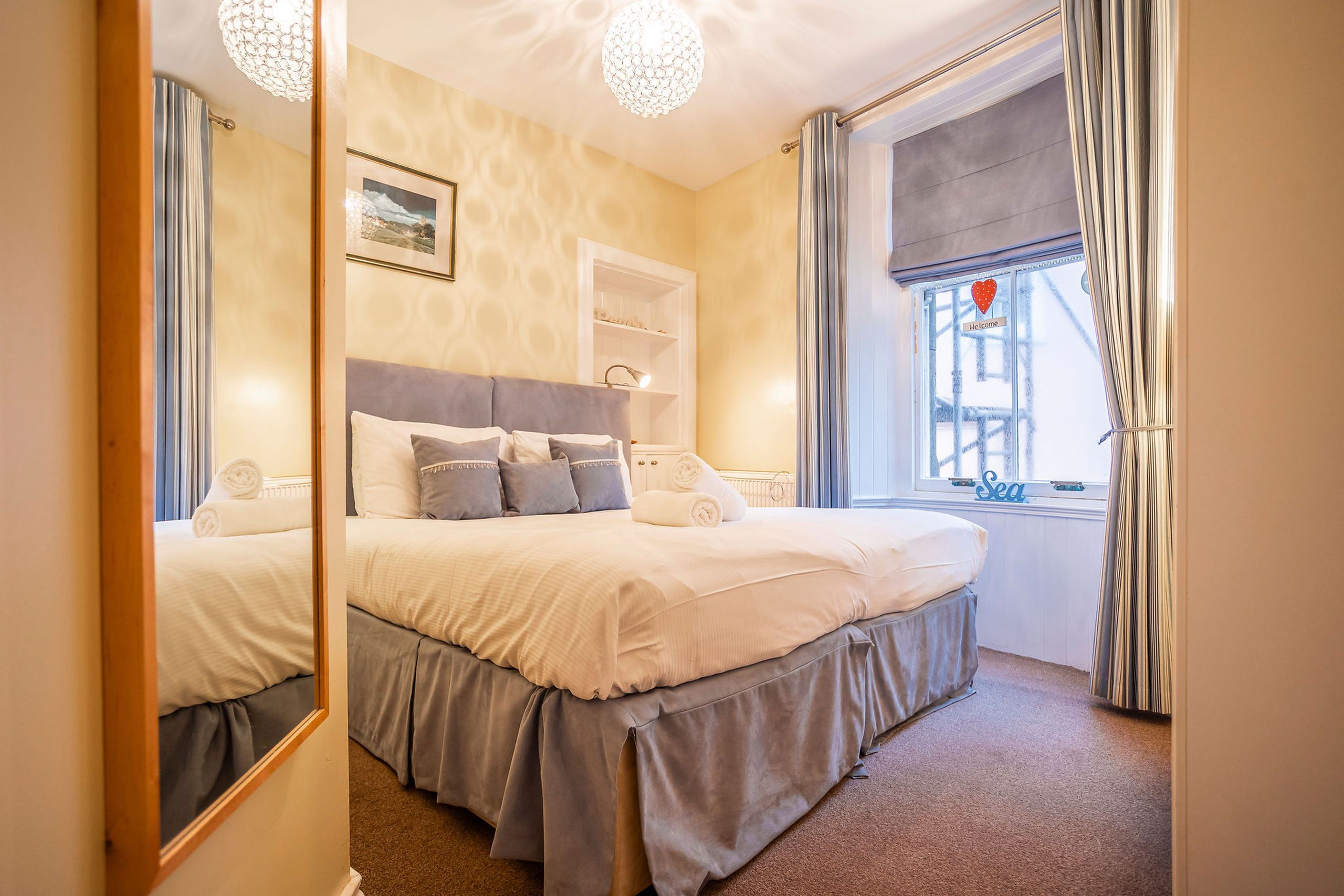 The bedroom has a super king-size bed and sits alongside a wardrobe and chest of drawers – plenty space. Next door is the bathroom with walk-in shower and separate bath and everything you need for a relaxing stay.