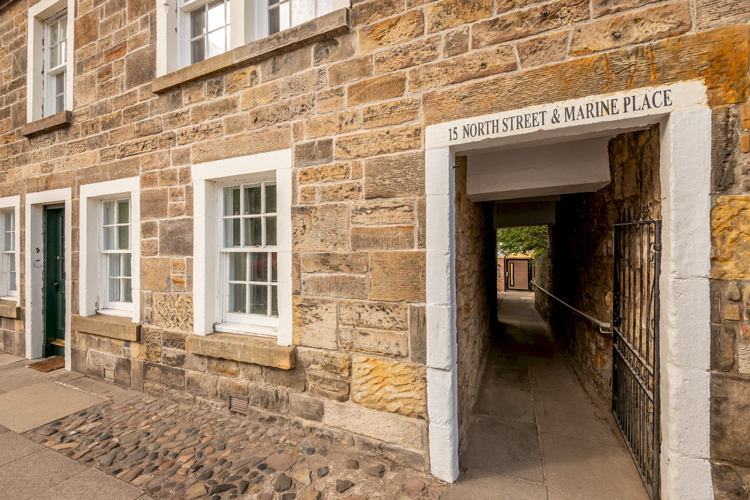 The entrance to the apartment is at the back of the building, and is accessible through a small close, and up a small flight of stairs.