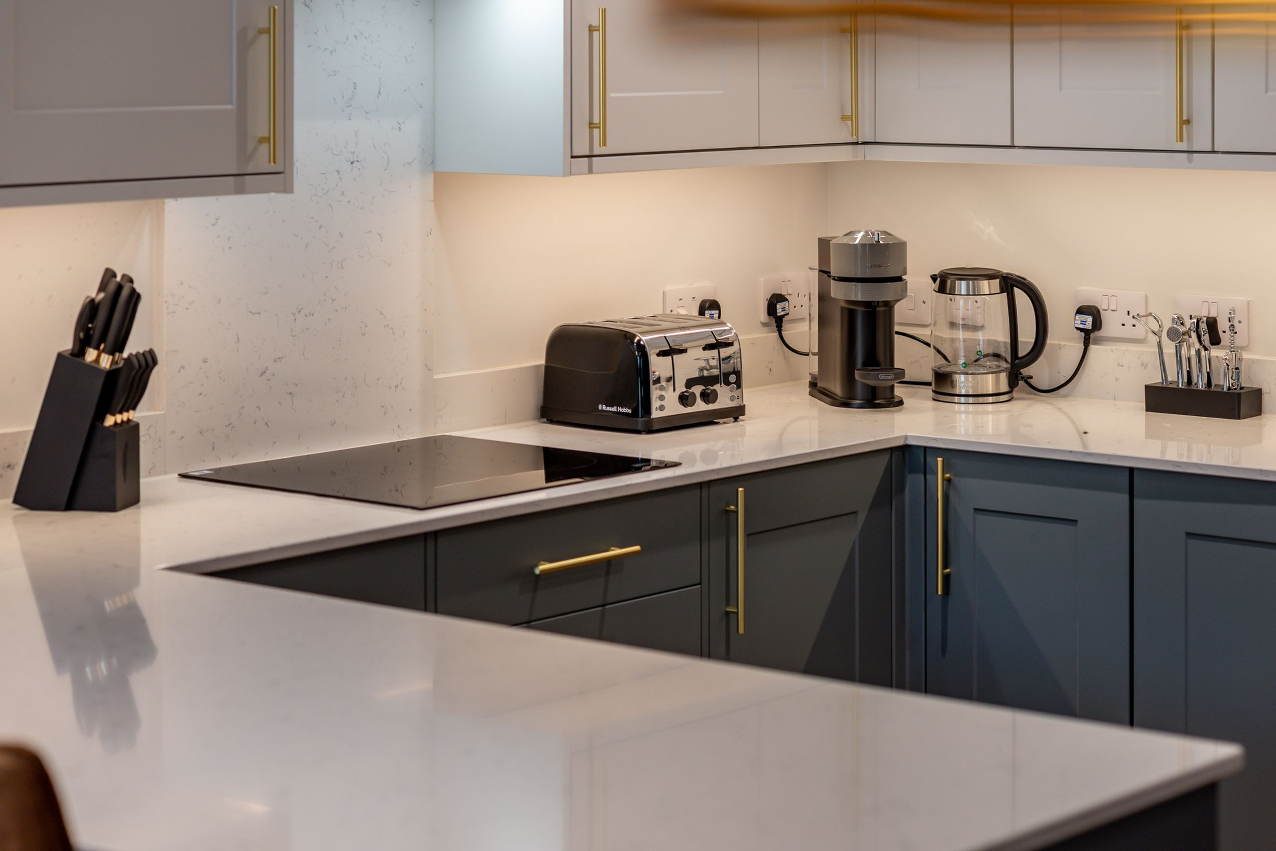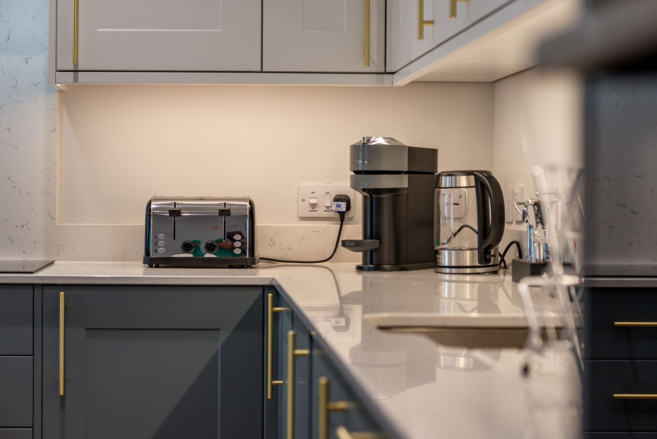 The contemporary kitchen is fully equipped for proper cooking: oven and hob, microwave, fridge-freezer, dishwasher, coffee machine, toaster, kettle and a full set of cookware, plates, bowls, dishes, cutlery and utensils.