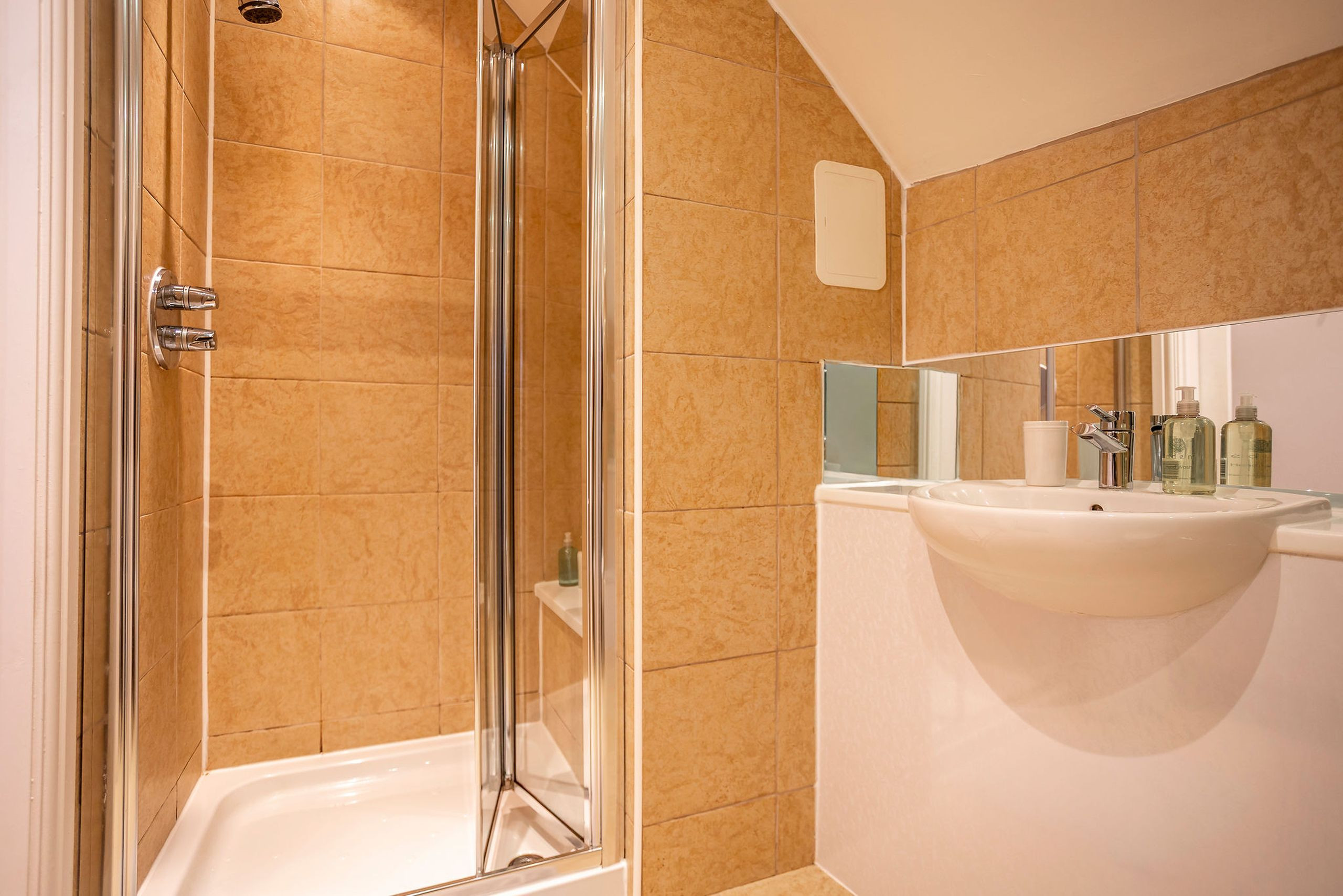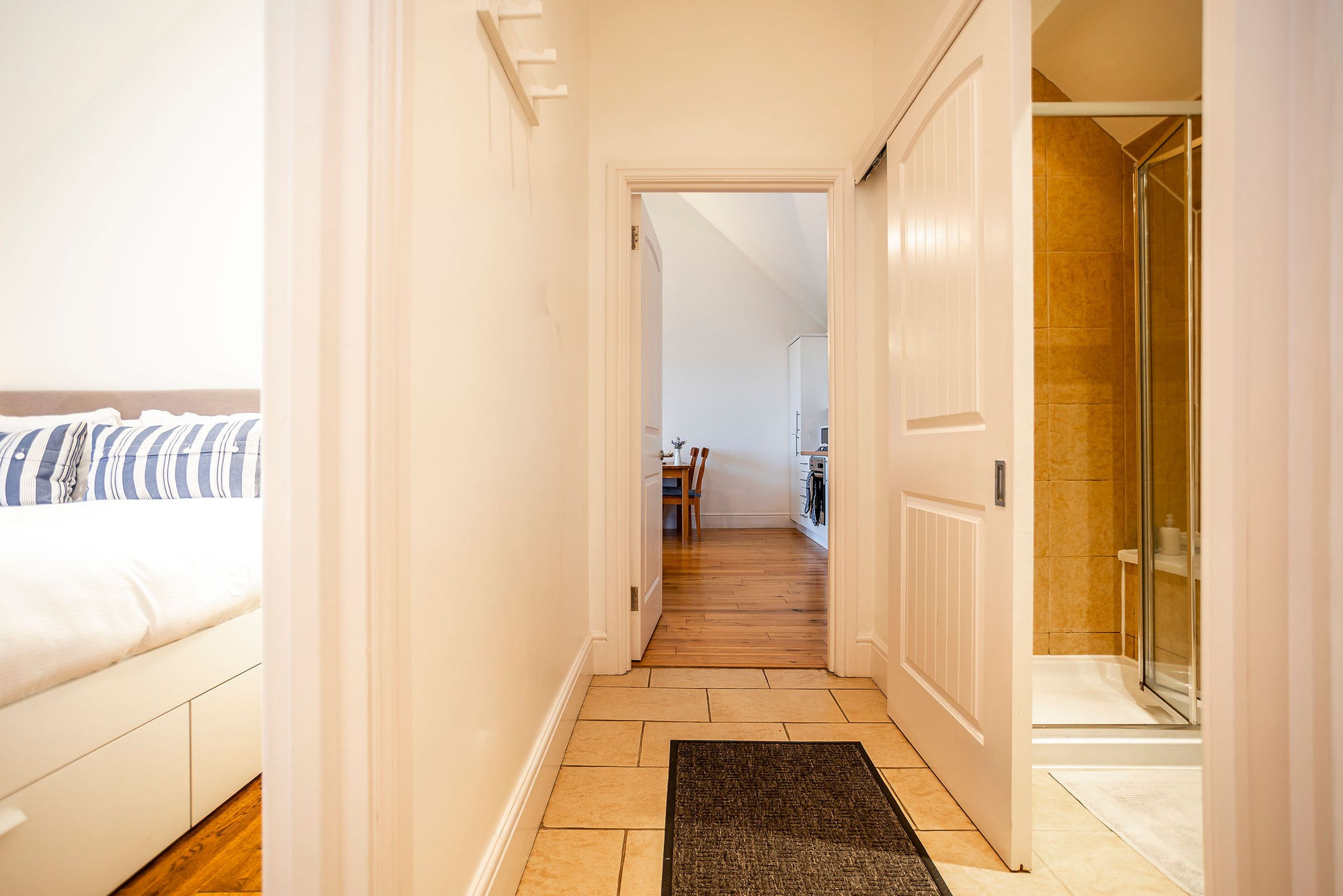 The bedroom is a calm, comfortable king-size room positioned to the front, with wooden floor, fitted wardrobes and a built-in dressing desk with chair – ideal for getting ready for dinner or catching up on emails. A luxury fully tiled shower room with enclosure, wash hand basin and WC completes the apartment.