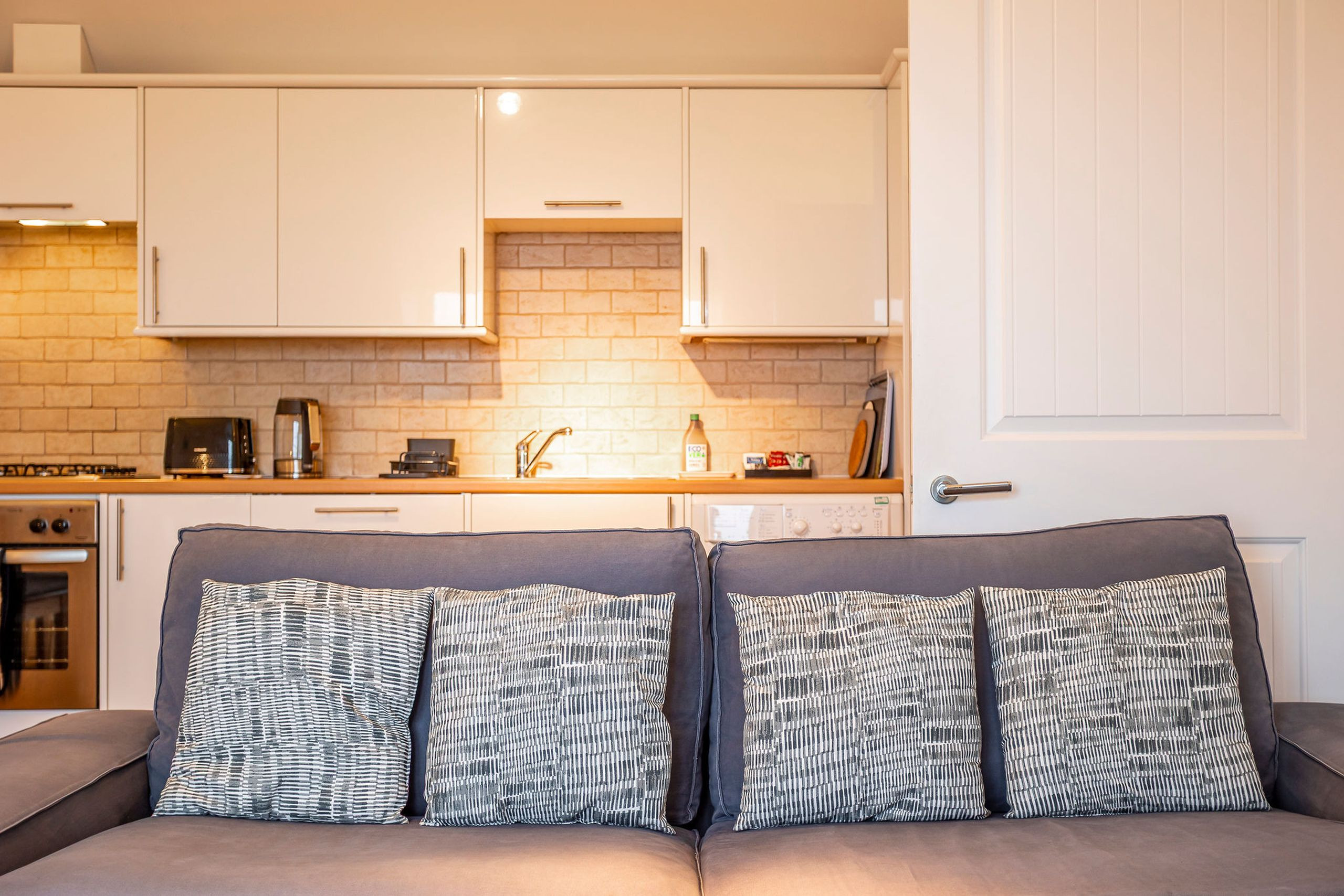 Inside, a short staircase leads up to a welcoming reception hall with wooden flooring and useful storage. The open-plan lounge/kitchen/dining room feels bright and contemporary, with a three-seater sofa and two-seater sofa bed, coordinated furnishings, TV and a dining table for four set by the windows to make the most of those sea views. The modern fitted kitchen keeps self-catering simple, with hob, oven, extractor, washing machine, fridge-freezer, dishwasher and microwave all neatly built in.