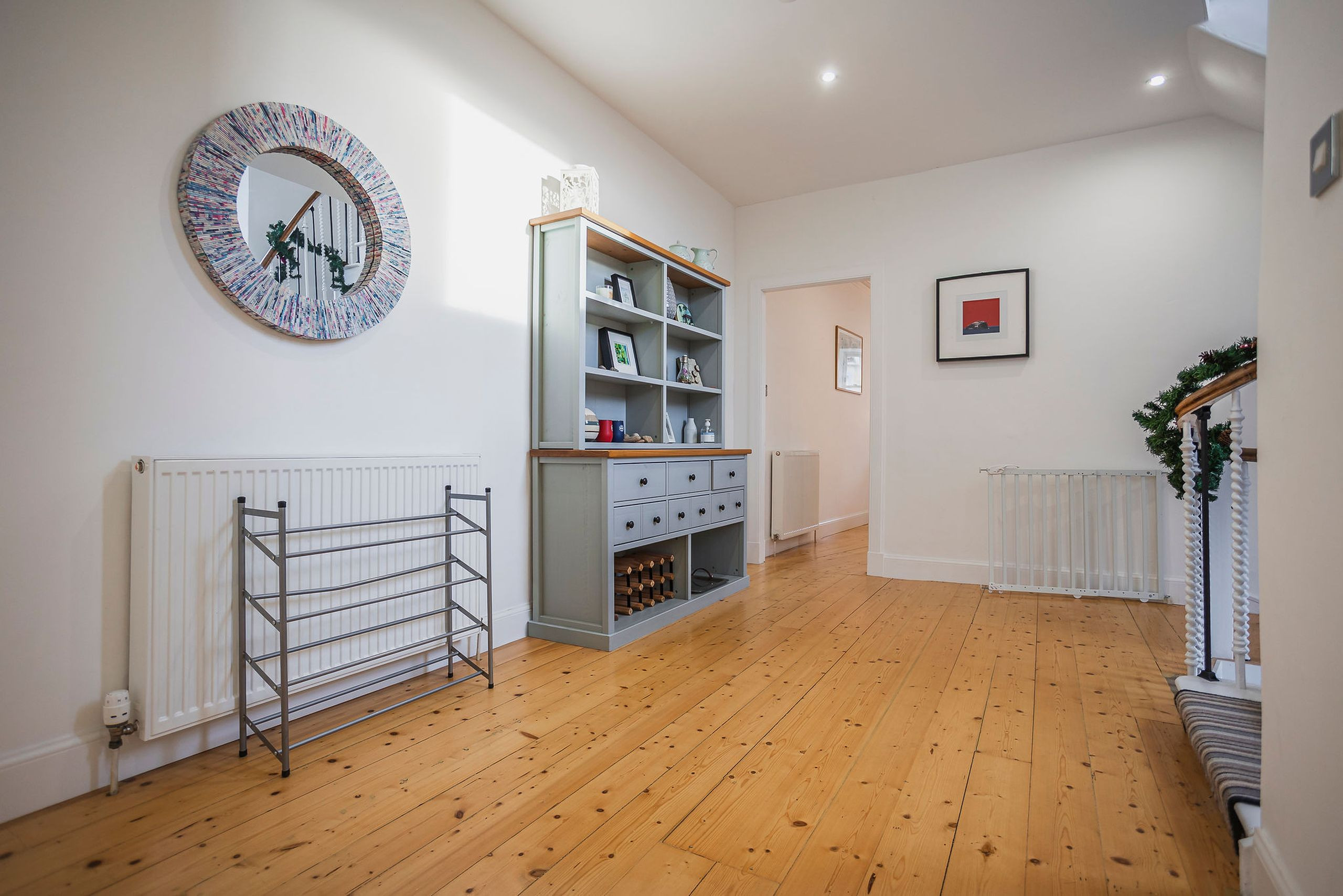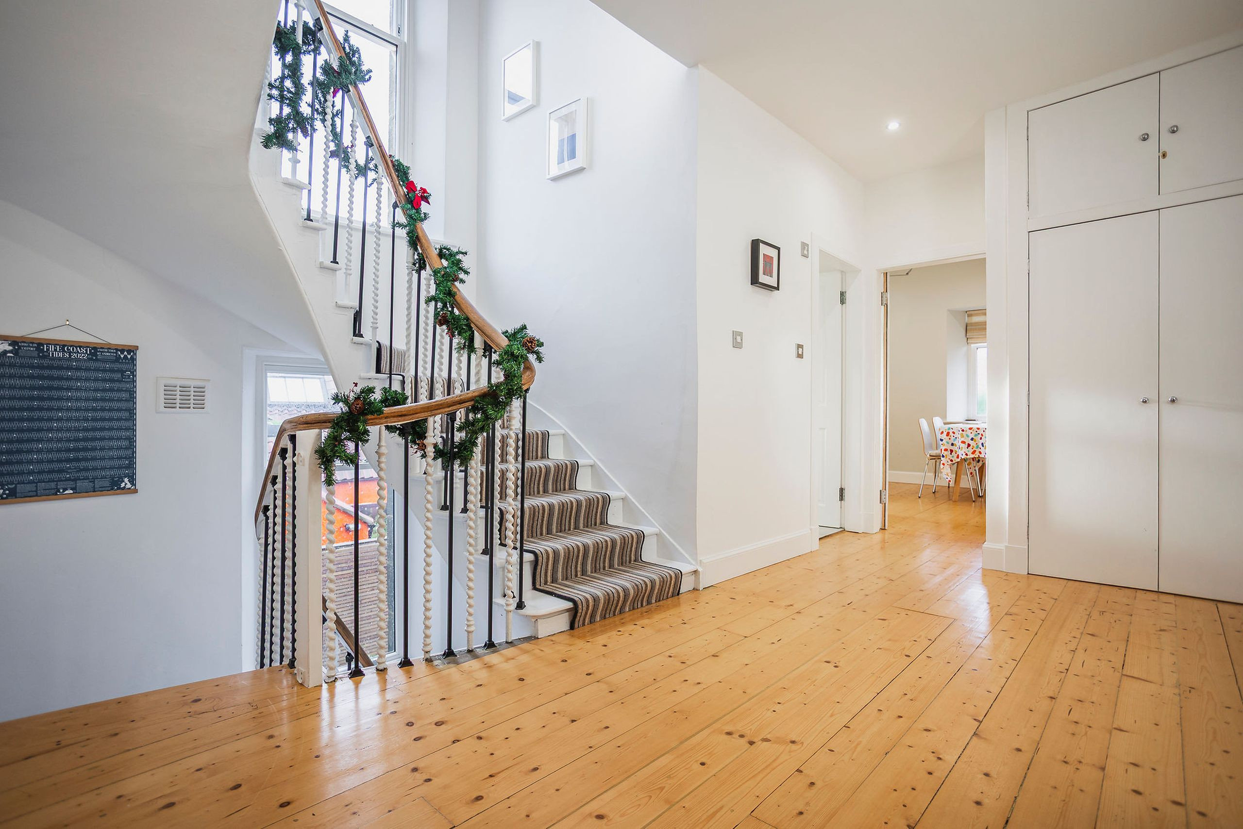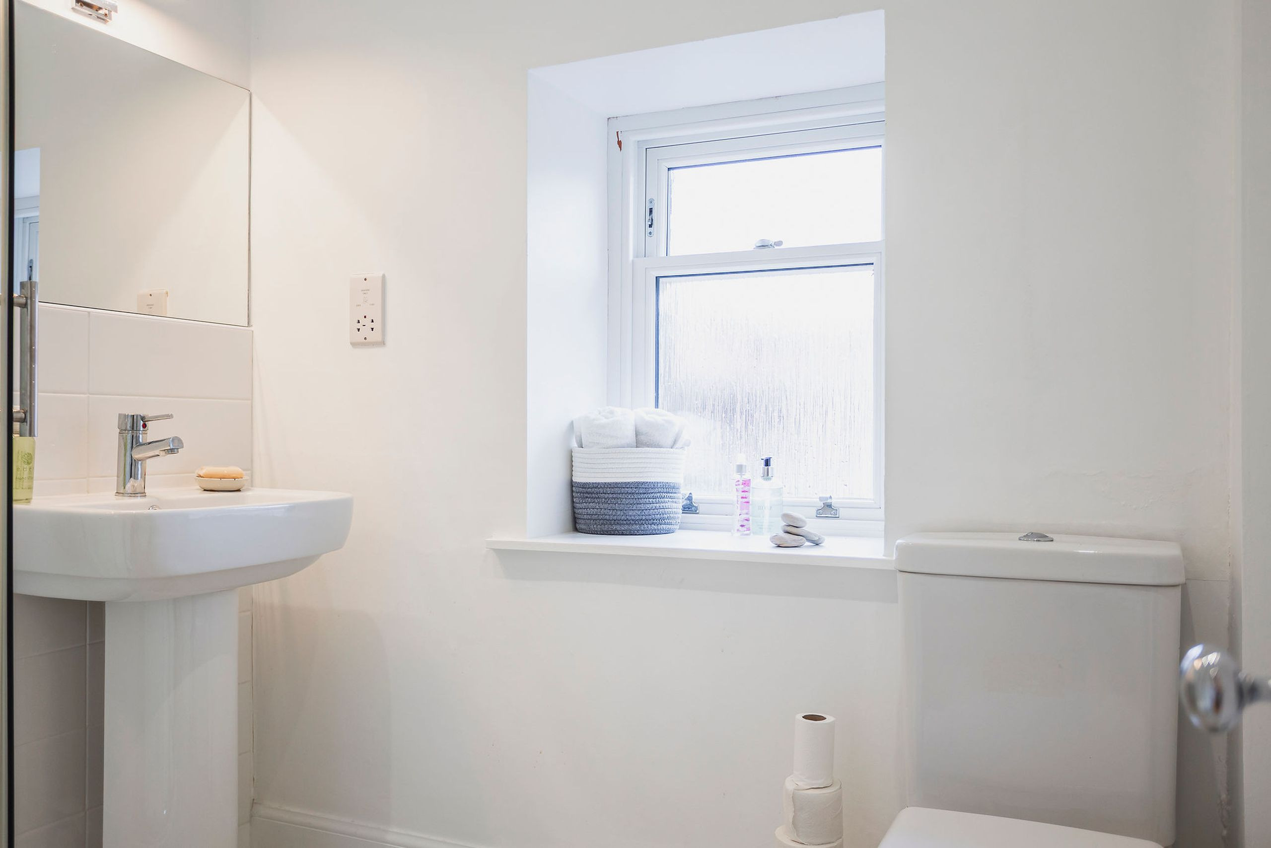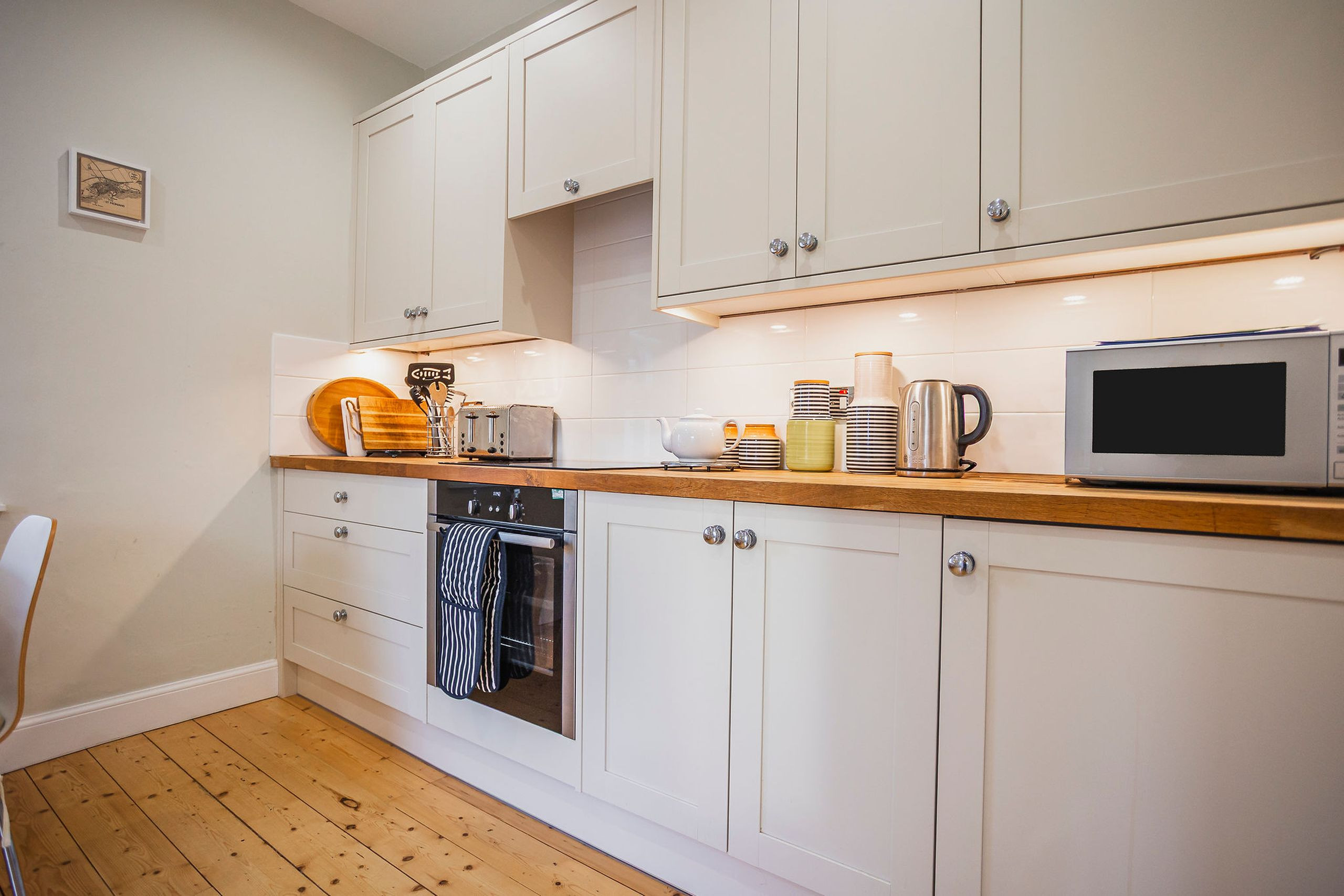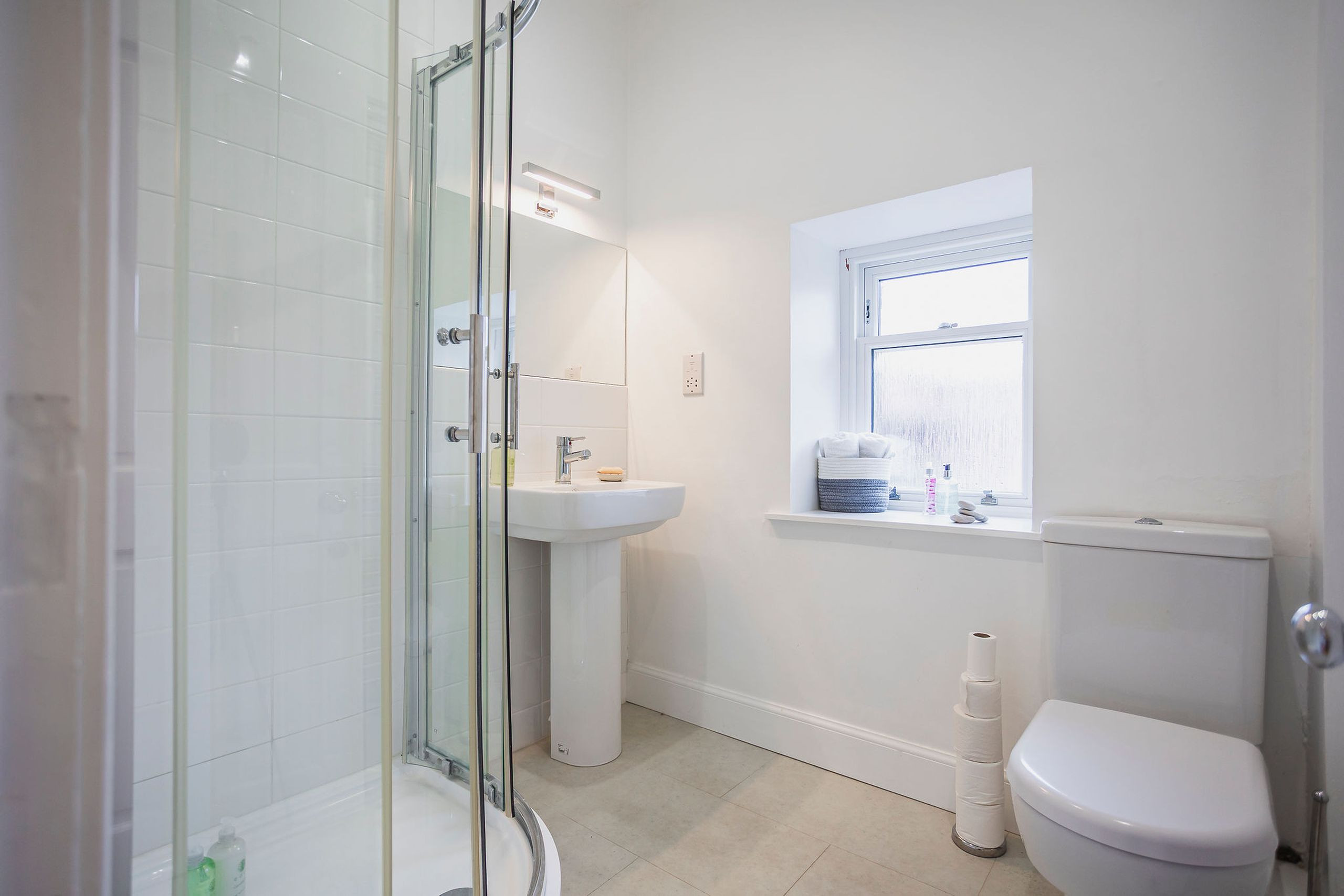 Set over two upper floors, the first level is all about relaxed, social living. A spacious reception hall leads into a fabulous lounge/dining room with twin front windows, wooden floors, a comfy sofa and accent chairs, Smart TV, and a dining table for six. There’s even a small desk for catching up on emails or planning the next day’s exploring. To the rear, the bright breakfasting kitchen pairs hardwood worktops with contemporary units and comes fully equipped with induction hob, oven, integrated fridge with icebox, dishwasher, washing machine, microwave, kettle, toaster and cafetière, plus a table for four. A stylish refitted shower room with rainfall corner shower, basin and WC completes this floor.