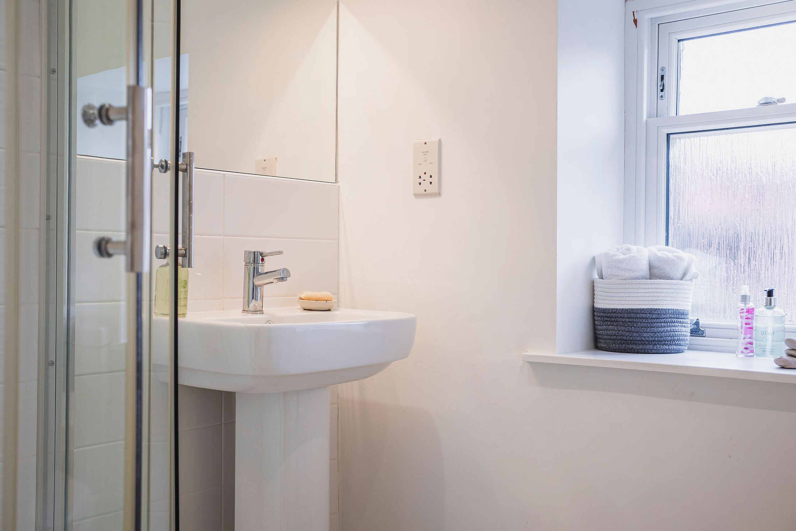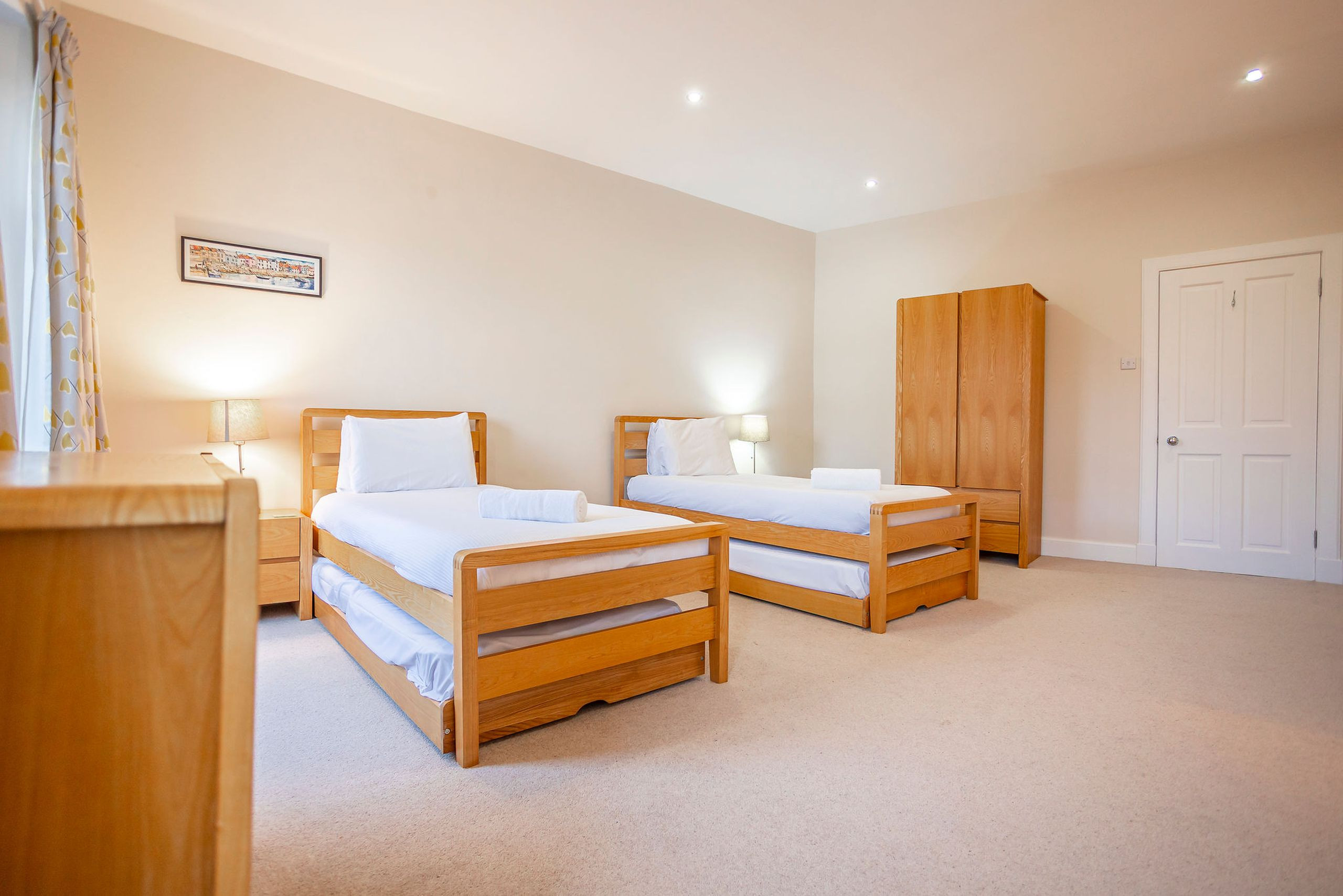 Upstairs, two generous bedrooms make Kittiwake ideal for families, friends or two couples. The elegant master bedroom to the rear offers lovely sea views, a double bed and coordinated storage, while the large front bedroom has twin windows, two single beds and two additional trundle beds, along with plenty of storage and a small Smart TV. A second modern shower room with large enclosure, vanity basin and WC serves this level.