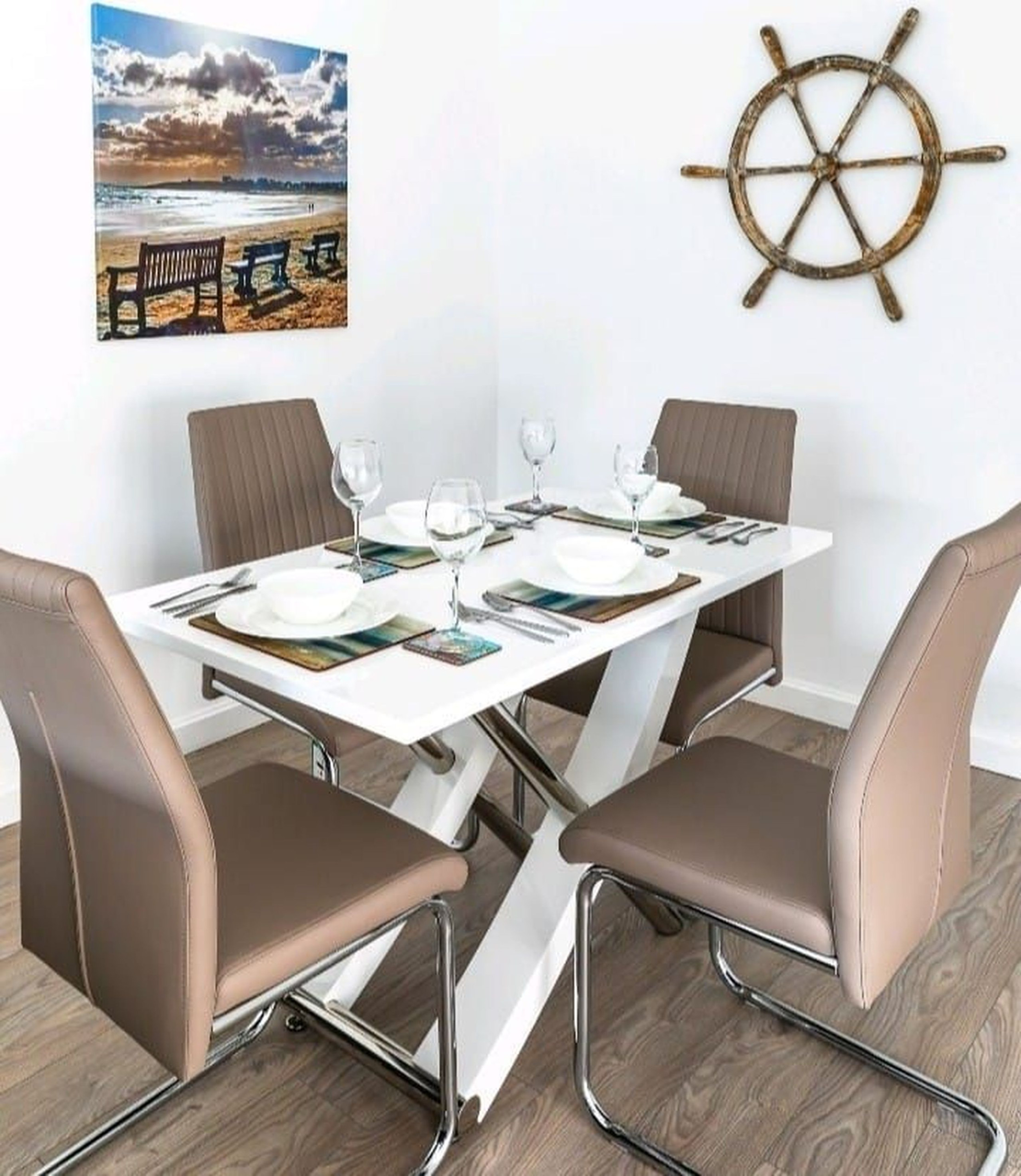 Inside, the open-plan living/dining room feels light and spacious, with large windows overlooking the enclosed rear garden. Two comfy leather sofas, a flat screen TV with Sky channels, DVD player, Wi-Fi, books and games make it easy to unwind after a day on the beach or nearby coastal paths. The modern dining table with four chairs also works well as a laptop-friendly spot if you’re working remotely. The fitted kitchen continues the fresh, contemporary feel, with coordinated worktops, dishwasher, integrated fridge, microwave, electric oven, gas hob and washer/dryer, plus a door leading straight out to the garden.