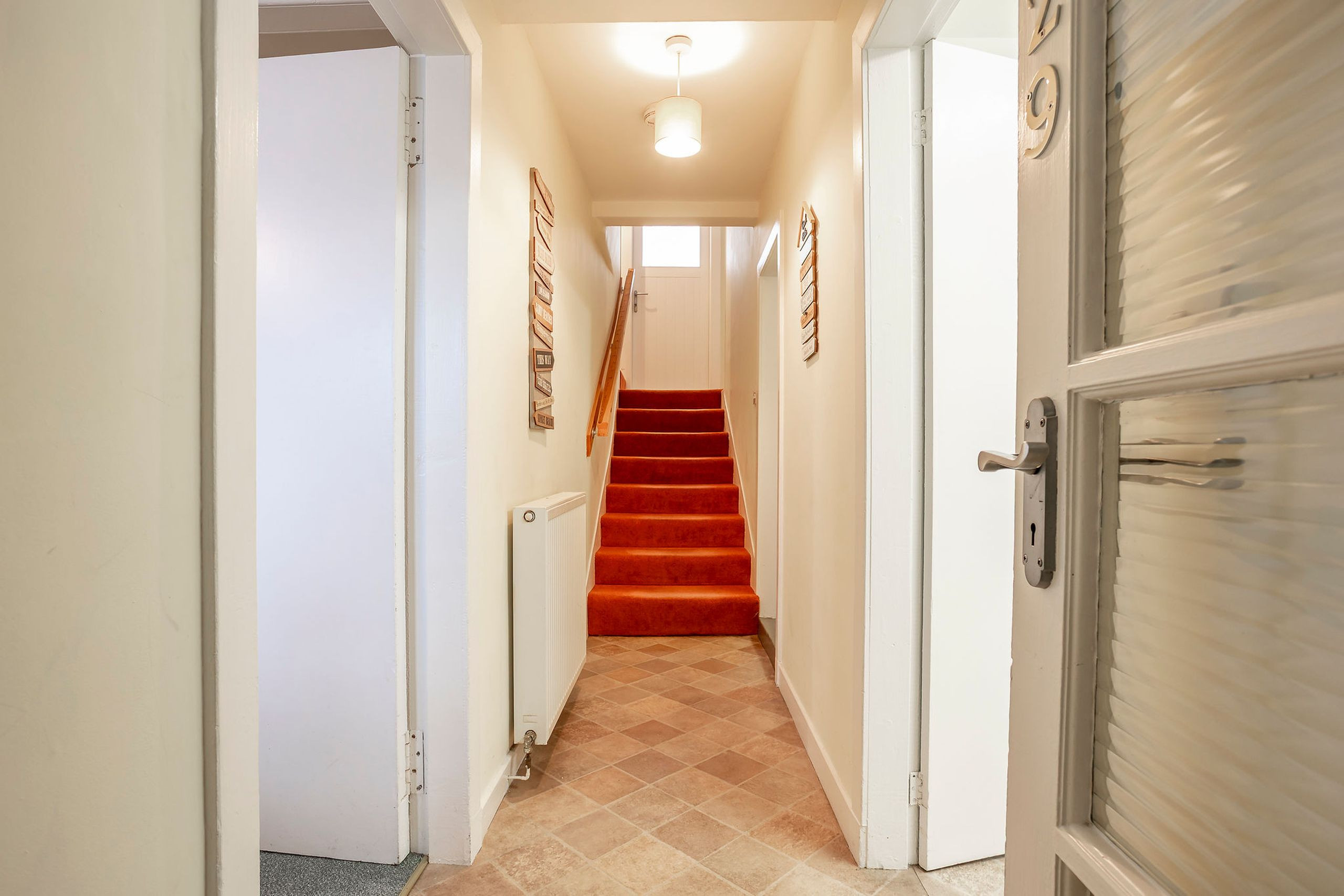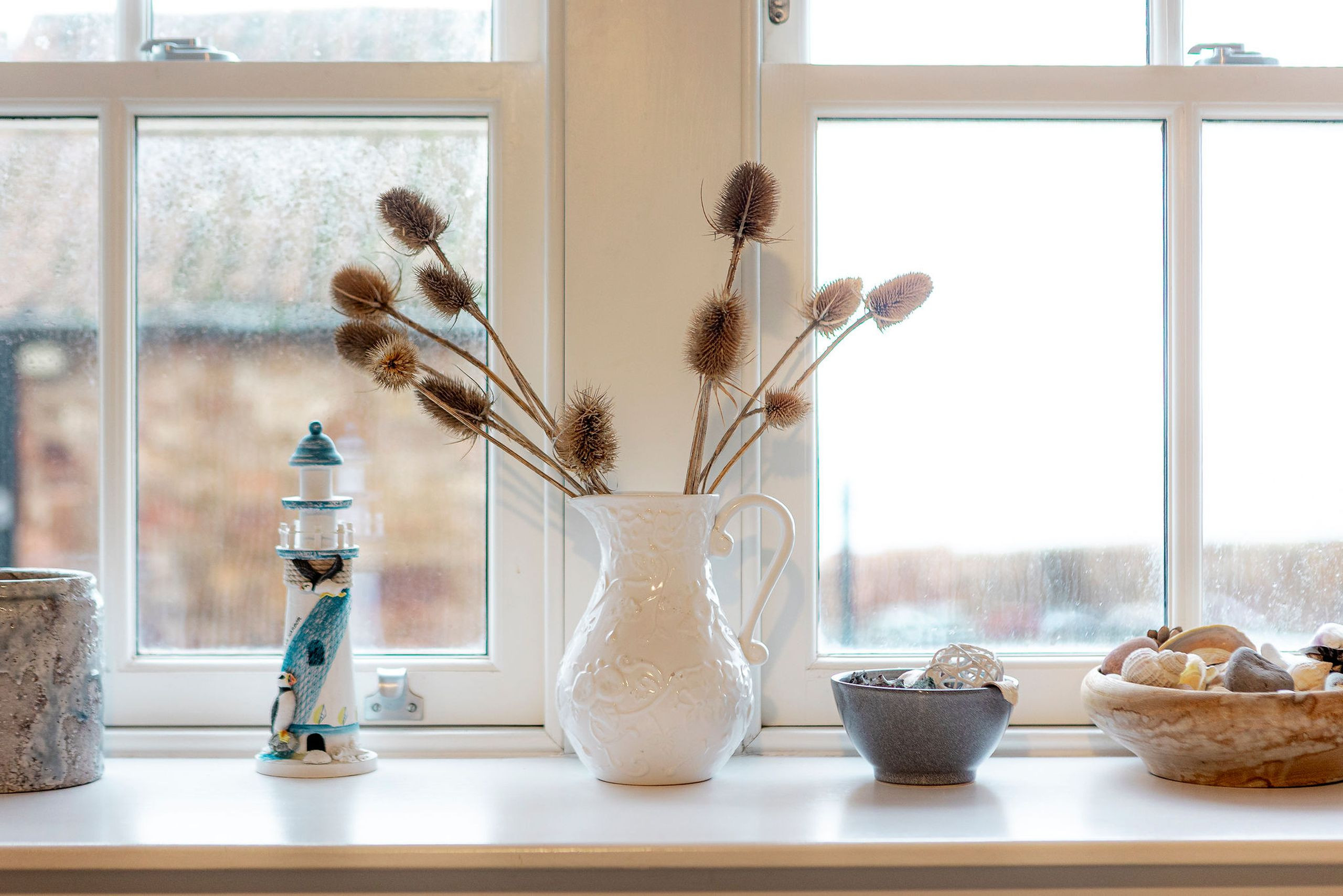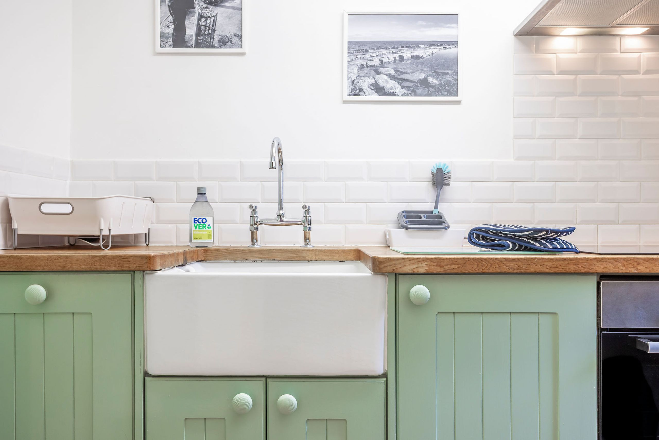 Pretty, cottage kitchen with front facing window, again overlooking the harbour. Electric hob and oven. Belfast sink.