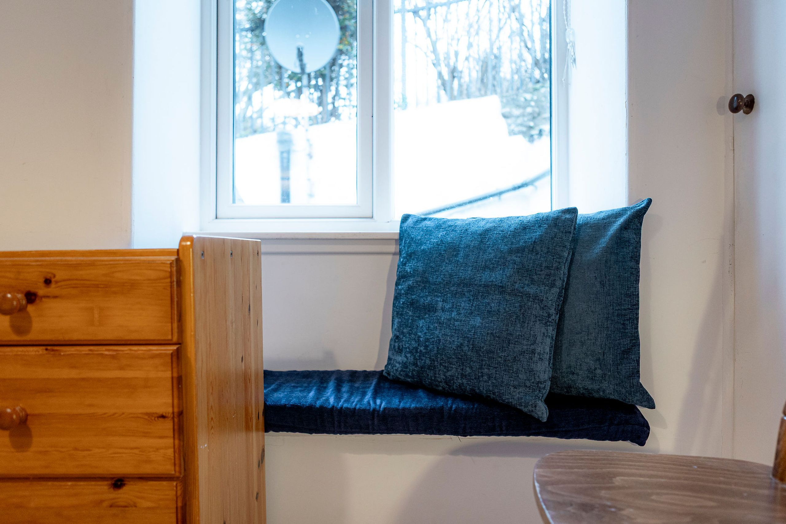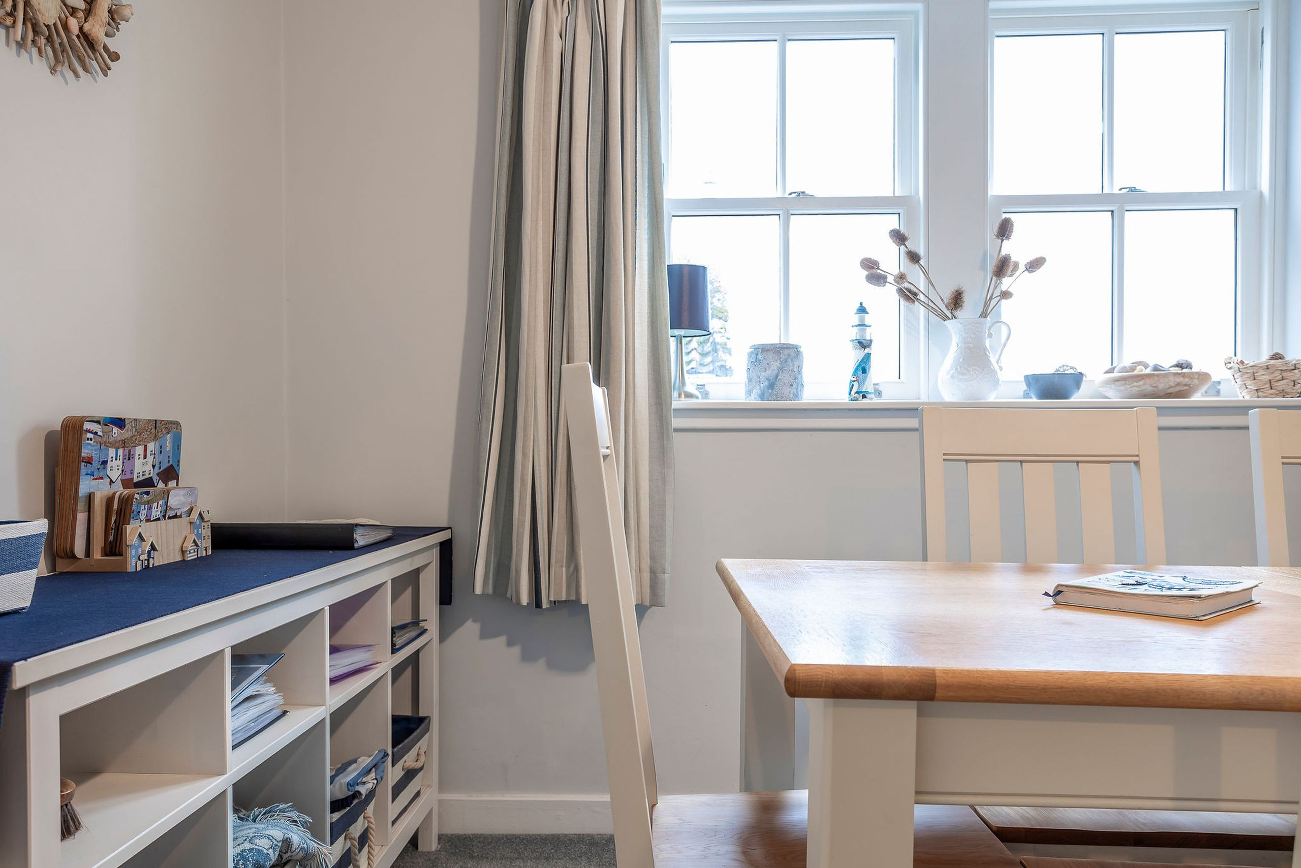 With window to the front overlooking the harbour, this bright lounge/dining room has comfortable sofa's, occasional furniture and soft furnishings. Dining table with 6 dining chairs and matching storage unit.