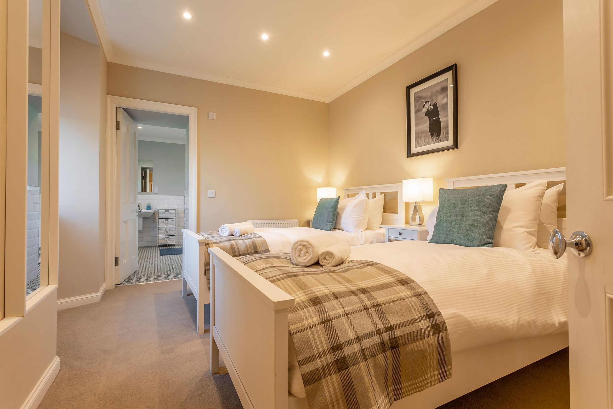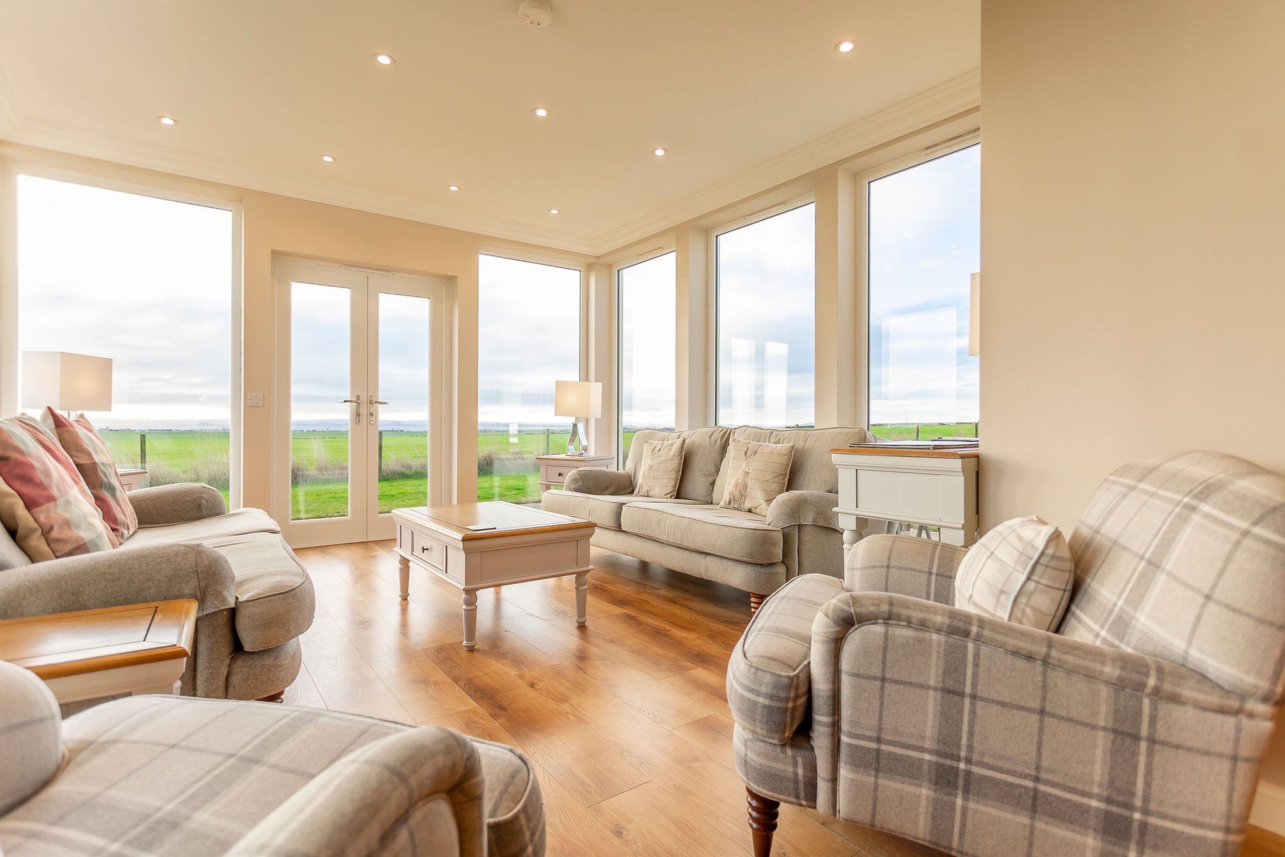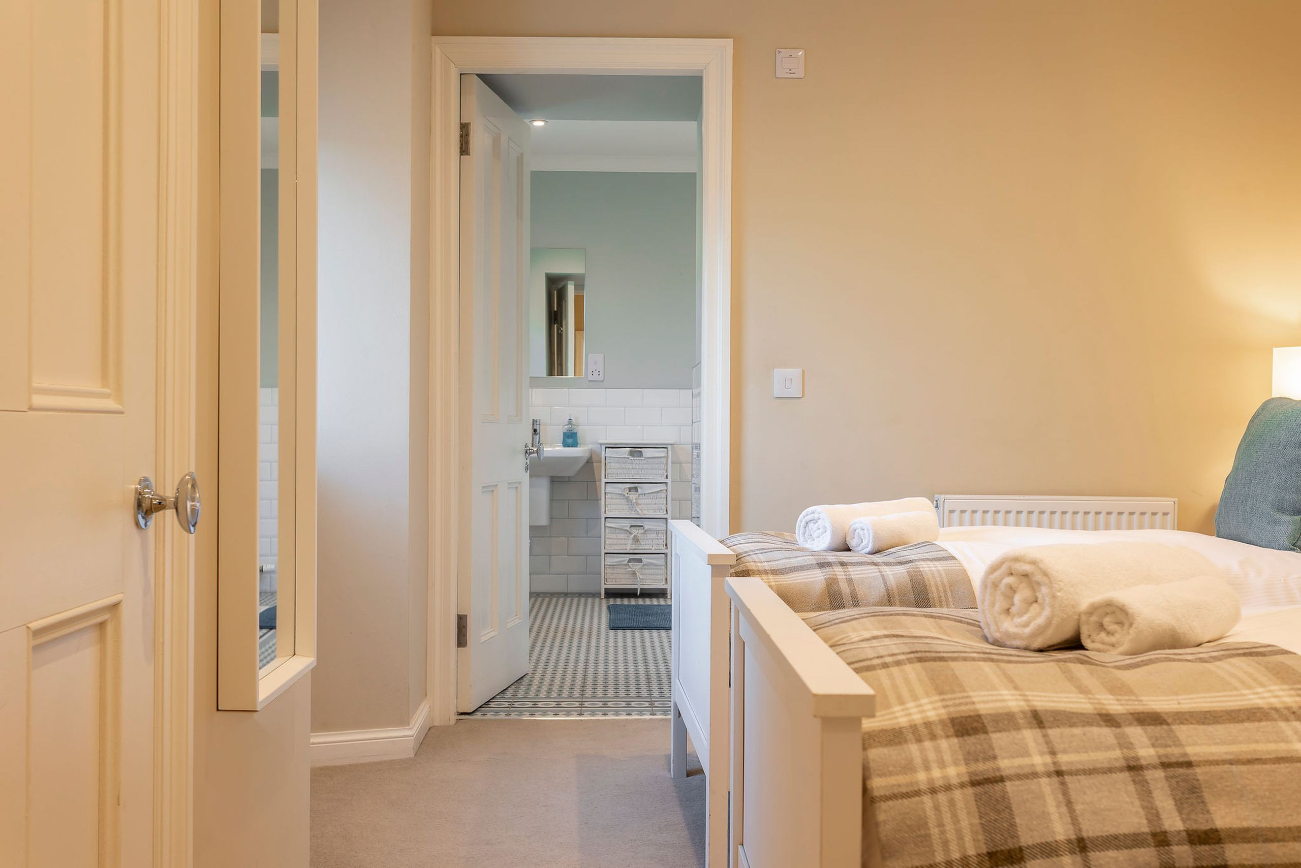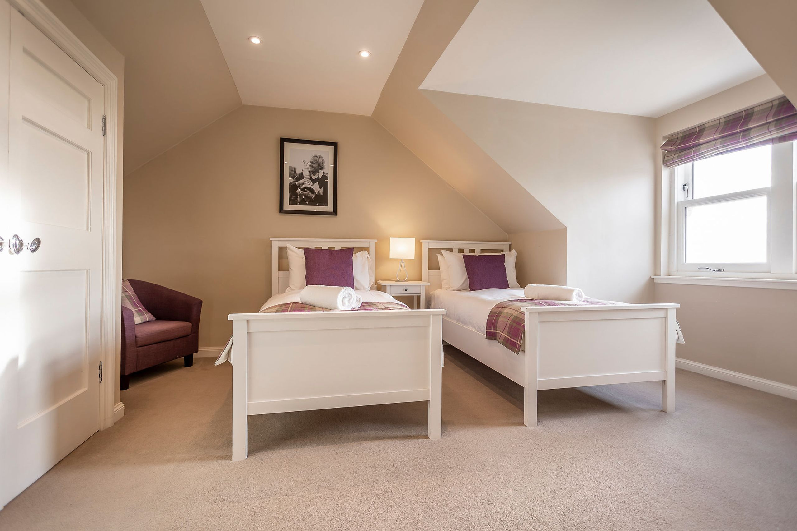 Sleeping arrangements are ideal for mixed groups. On the ground floor there are two en-suite bedrooms: one twin with a large walk-in shower, and one super king with French doors opening to the garden and countryside beyond. Upstairs, a family bathroom on the half-landing serves three further bedrooms: two twin rooms with built-in wardrobes, dressing tables and rural views, and a show-stopping master bedroom with super king bed and floor-to-ceiling windows on three sides, offering jaw-dropping panoramic views towards Anstruther.