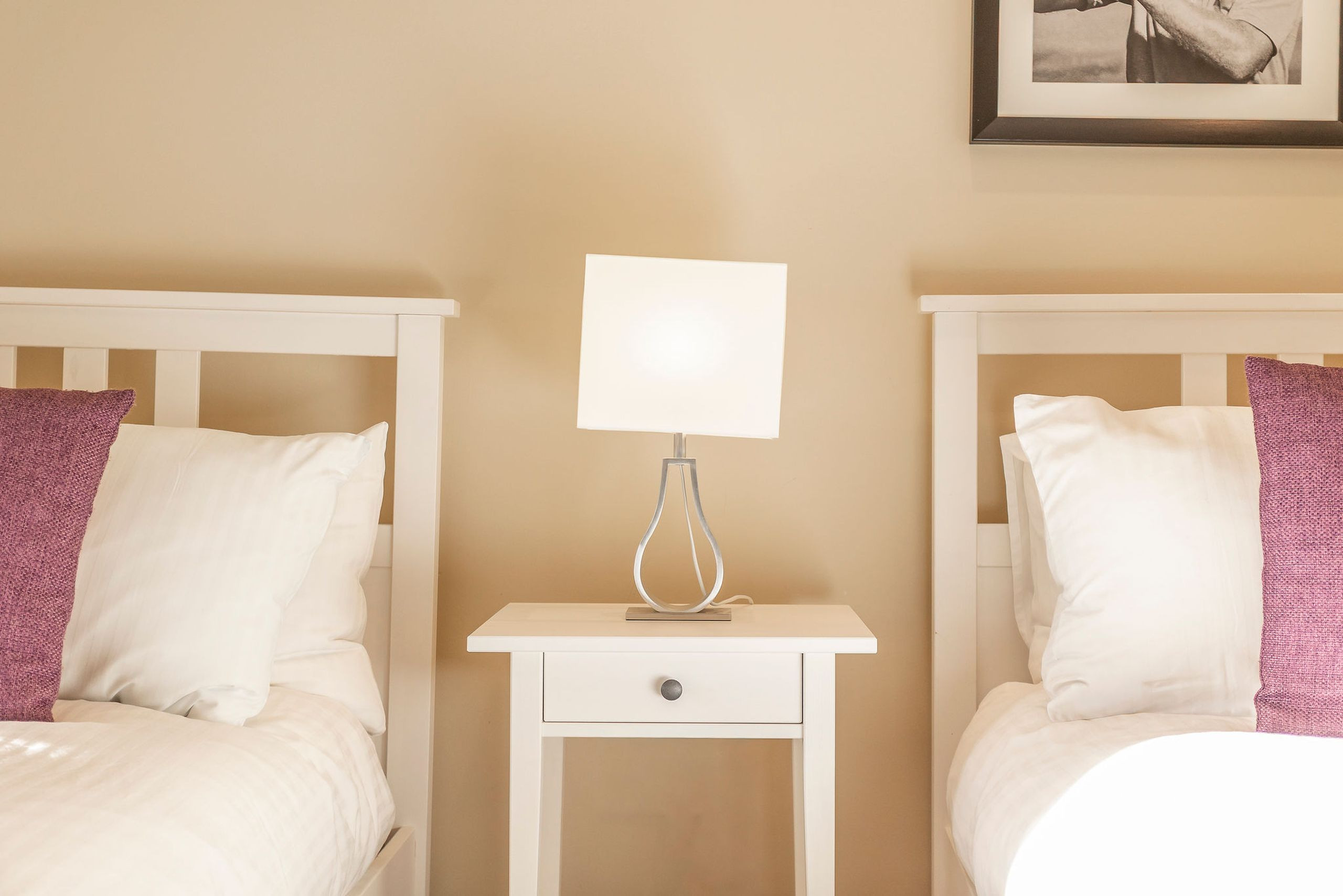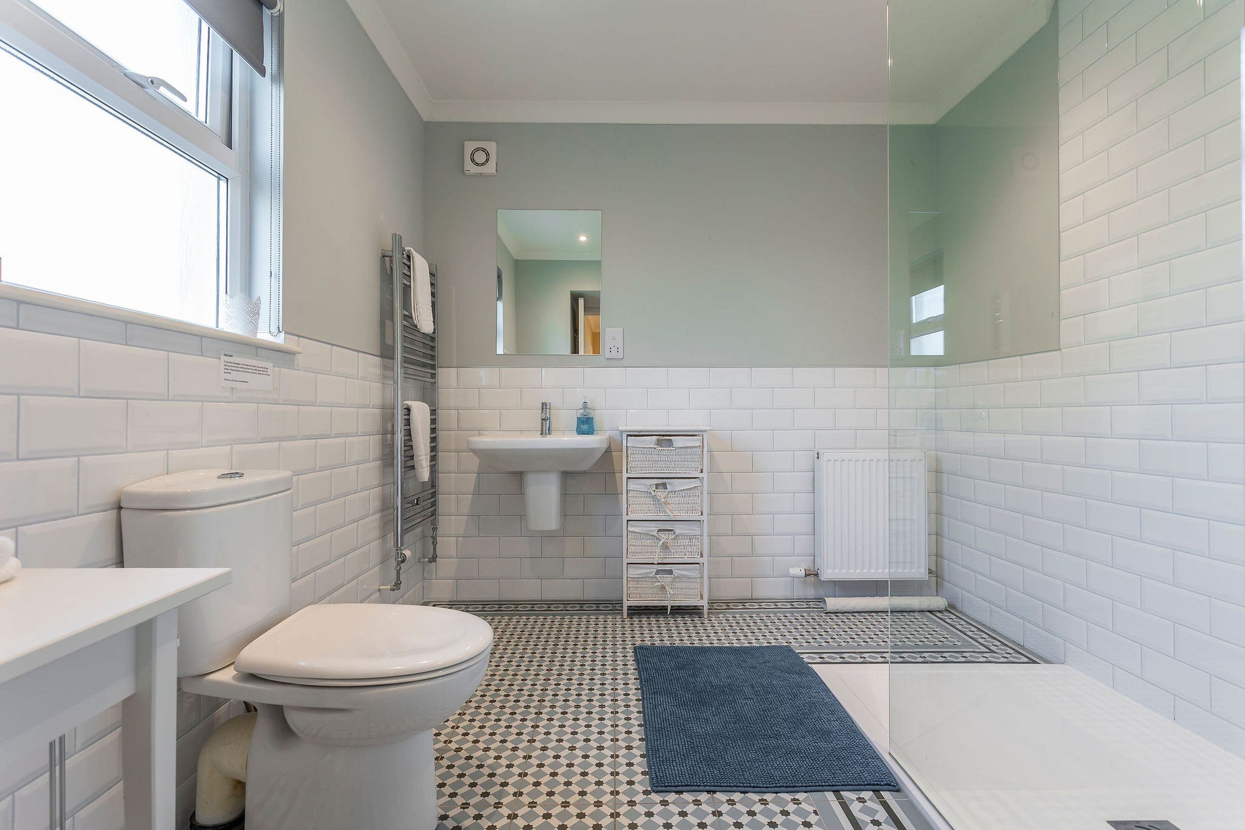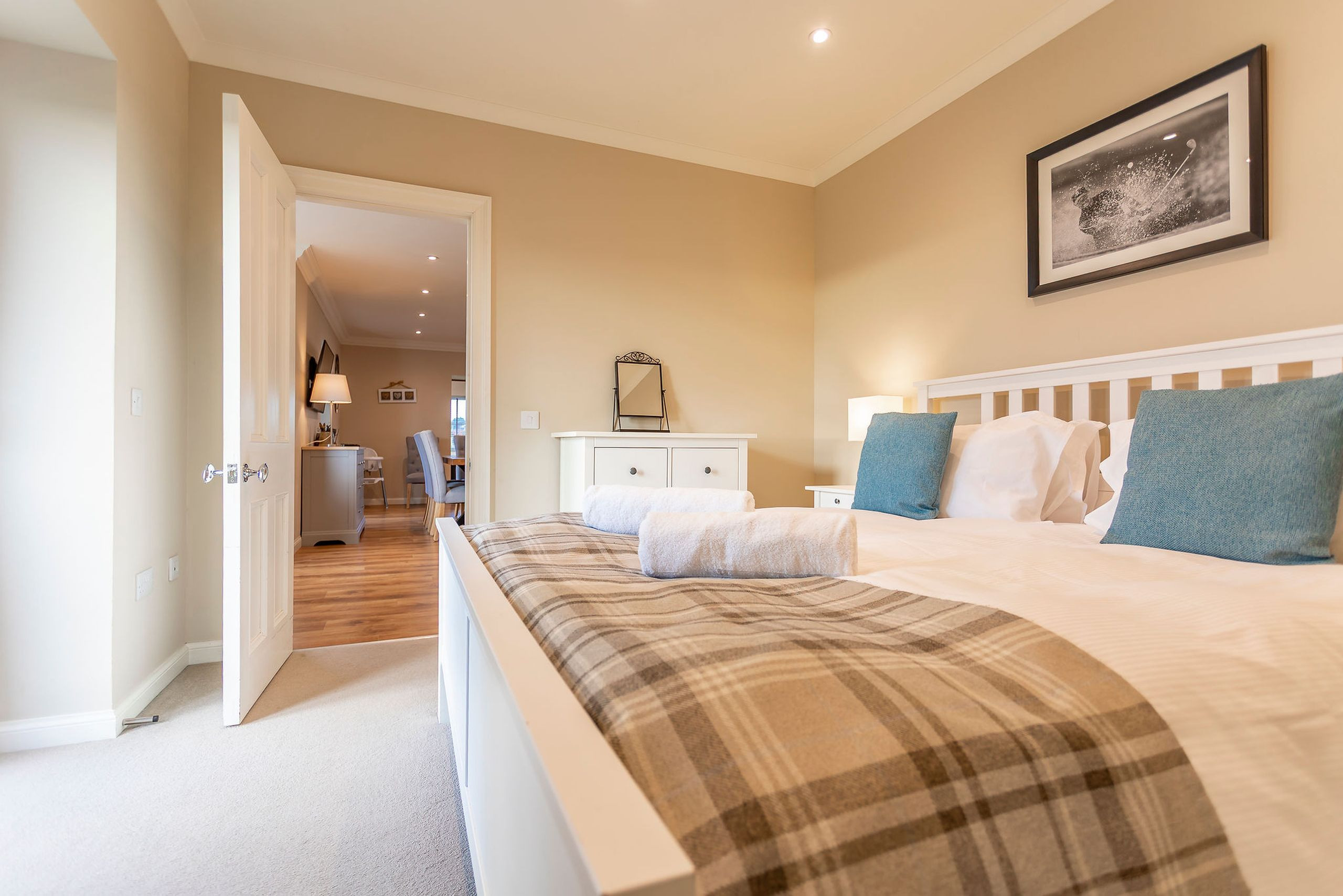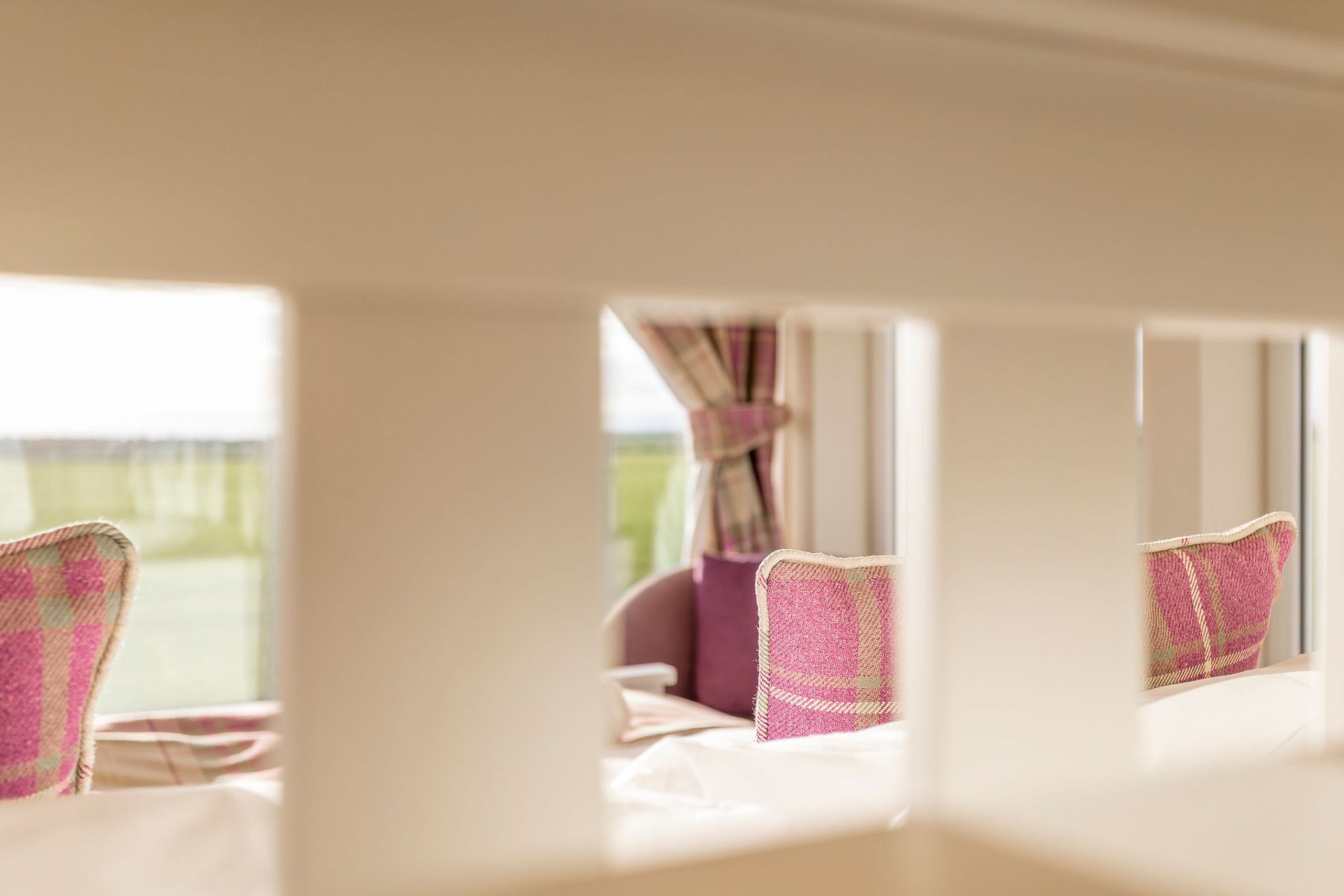 Sleeping arrangements are ideal for mixed groups. On the ground floor there are two en-suite bedrooms: one twin with a large walk-in shower, and one super king with French doors opening to the garden and countryside beyond. Upstairs, a family bathroom on the half-landing serves three further bedrooms: two twin rooms with built-in wardrobes, dressing tables and rural views, and a show-stopping master bedroom with super king bed and floor-to-ceiling windows on three sides, offering jaw-dropping panoramic views towards Anstruther.