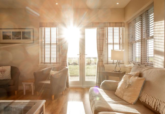 Inside, the layout is made for relaxed gatherings. On the ground floor, a welcoming snug with log burner and comfy sofas is perfect for curling up after a day on the coast, while the impressive open-plan kitchen, dining and living area forms the heart of the house. Here you’ll find a well-equipped kitchen with all the mod cons you need, an extending dining table seating up to ten, and a further seating area arranged around an open fire – ideal for long, chatty evenings. French doors open out to the garden and patio, and a spiral staircase leads up to a mezzanine level that works brilliantly as a play or games area for children. A separate utility room with laundry facilities keeps life practical on longer stays.
