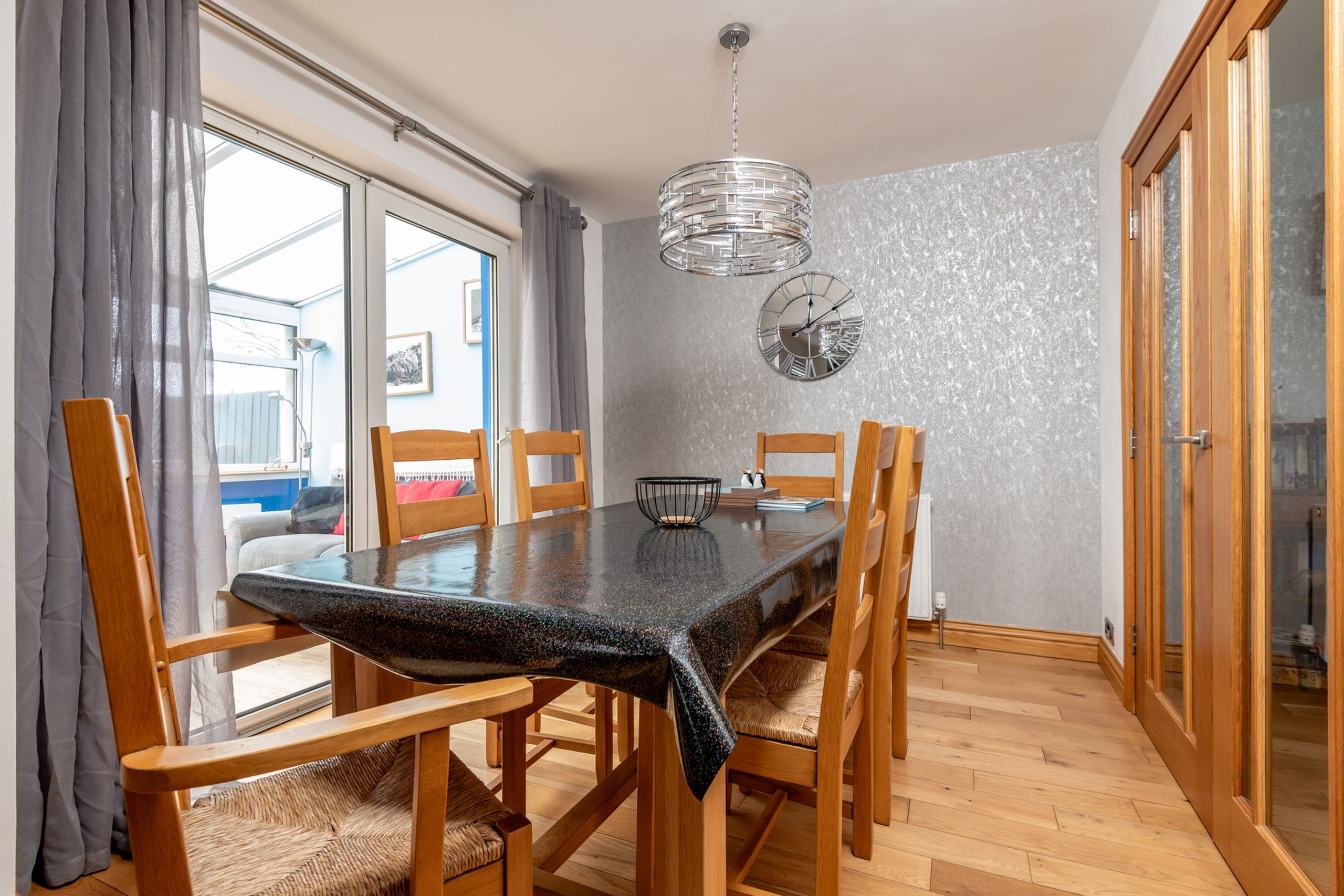 Inside, you’ll find a spacious open-plan kitchen and dining area with plenty of room to gather, plus patio doors leading through to a light-filled conservatory—an ideal spot for morning coffee or a quiet read. The kitchen is well equipped for self-catering with a fridge/freezer, oven, microwave, dishwasher, toaster, kettle, and a full range of kitchenware, plates, bowls, and utensils. A washing machine, iron, hair dryer, central heating, and Wi-Fi are all provided for a comfortable stay.