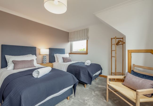 A welcoming reception hall leads into the ground floor living spaces. Double doors open to a spacious dual-aspect lounge, where large windows and doors onto the central gardens keep everything light and airy. Two three-seater sofas (one with chaise), an accent armchair with matching footstool, coffee table, side tables and lamps create a relaxed seating area, while a large Smart TV with Sky takes care of evening entertainment. The dual-aspect kitchen/dining room is fitted in a classic shaker style with a broad breakfast bar and high stools, electric hob, oven, extractor, dishwasher, fridge-freezer and coffee machine. A glass dining table with eight contemporary chairs makes this a great space for long, lazy meals after a day exploring the East Neuk or playing golf. Off the kitchen, a handy utility room houses the washing machine, microwave and BBQ, with a door straight out to the central gardens. There’s also a contemporary ground-floor cloakroom with WC and wash hand basin, plus a flexible study/bedroom 4, which can be used as a work space with day bed or made up as either a single or double (with two single duvets) depending on your group.
