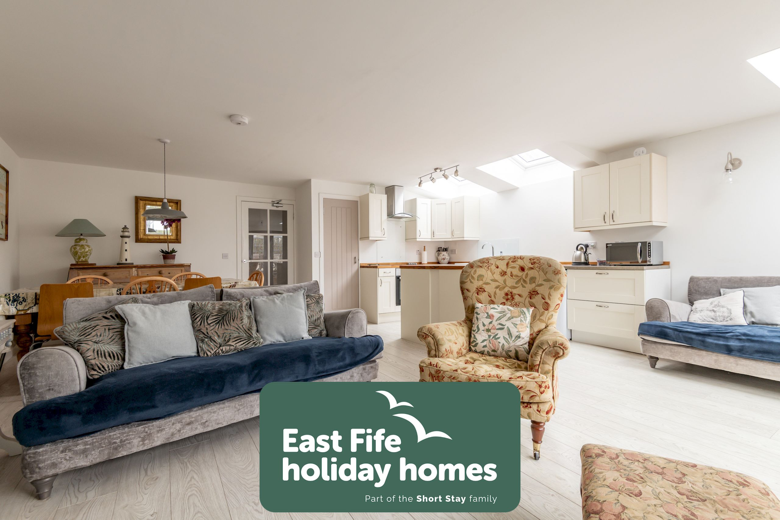 Juniper Cottage is a fabulous modern detached home in Elie, individually designed and built by the owners around 14 years ago, and it offers the perfect balance of privacy and village convenience. Tucked away in a quiet setting, you are still only minutes from the cafés, shops and everyday essentials on Elie High Street, and just a short stroll from the long sandy beach for sea swims, sandcastle days and sunset walks. Inside, the house is bright, spacious and thoughtfully laid out for easy holidays together, sleeping up to eight guests across three bedrooms with two bathrooms, making it ideal for families, friends and multi generation breaks. The open, airy feel creates a relaxed space to gather, while the generous proportions give everyone room to unwind after days exploring the East Neuk. Outside, a secluded rear garden with a patio sets the scene for lazy breakfasts, long lunches and outside dining in the fresh coastal air. Practical touches make stays simple, including one off road parking space and a garage that is ideal for storing bikes and beach gear, so you can make the most of coastal paths, village adventures and days out to St Andrews, all from a comfortable and well positioned base.