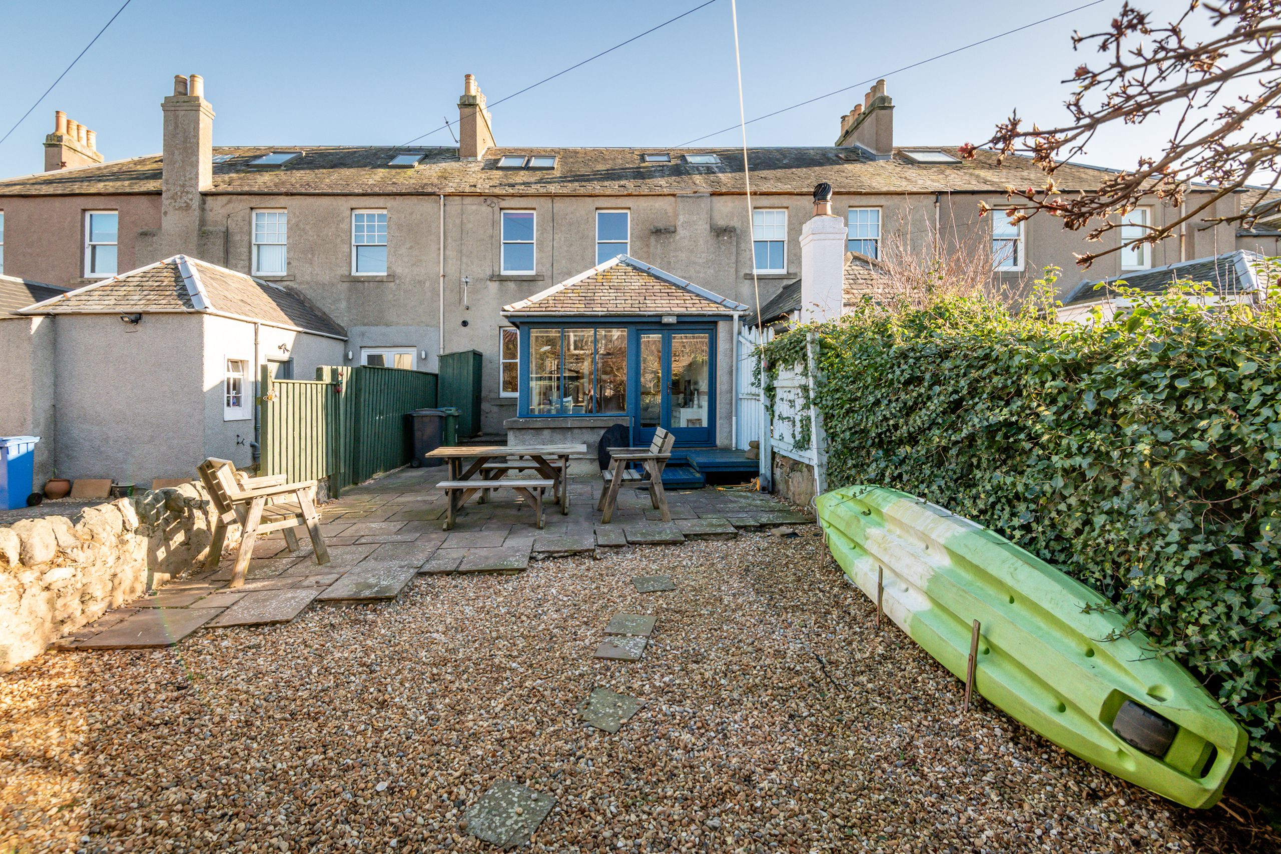 Devon Cottage in Elie is a beautifully renovated traditional terraced cottage that combines coastal charm with bright, contemporary comfort. Sleeping up to eight guests across three bedrooms with two bathrooms, it’s an ideal choice for families and friends looking for an easy, beach focused escape in the East Neuk. Finished to a high standard throughout, the cottage feels fresh and welcoming, with sociable spaces to come together after a day outdoors and plenty of room for everyone to relax. Step out into the fully enclosed rear garden, a real sun trap that catches the light throughout the day and offers a private spot for morning coffees, lazy lunches and unwinding in the evening, with peace of mind for children and dogs. Location wise, it’s hard to beat: the cottage is literally seconds from Elie’s long sandy beach for sea swims, sandcastles and sunset strolls, and just a minute from the golf course for early tee times or a quick wander over the dunes. With Wi Fi included and dog friendly stays available (supplement applies), Devon Cottage makes a brilliant base for making the most of Elie, the coastal path and the picture postcard villages nearby.