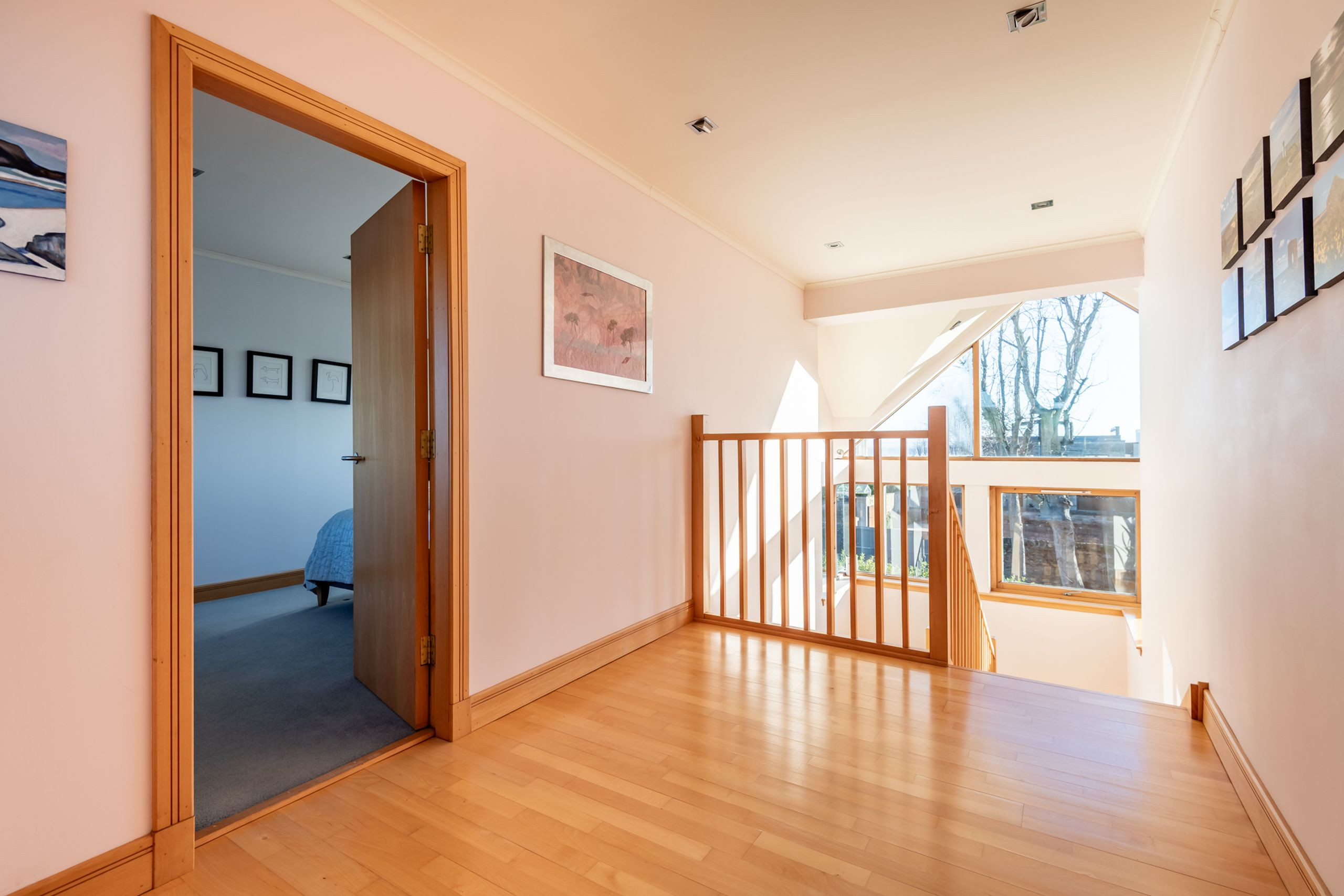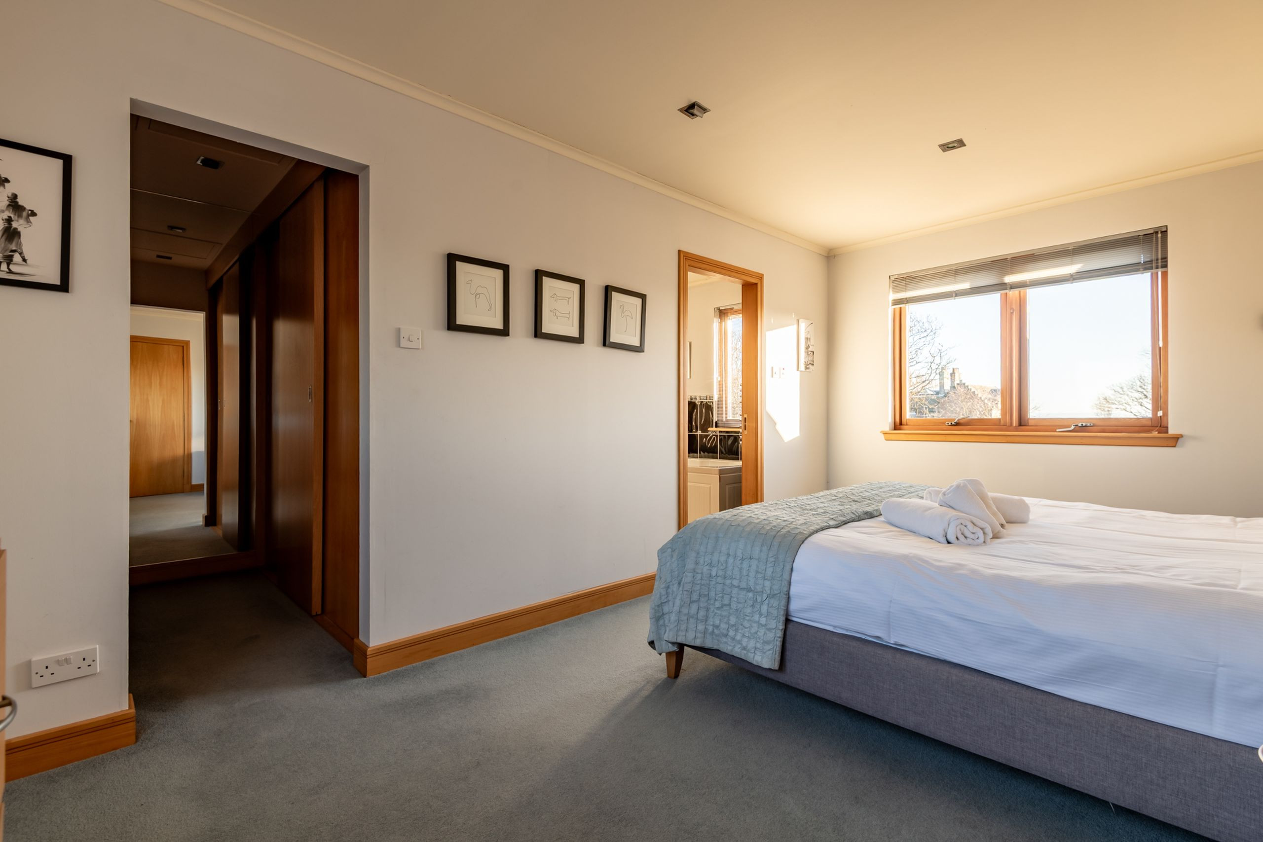 Upstairs, a striking mid-level window wall floods the staircase with natural light and frames open views across the garden towards the sea. At the rear, a stunning first-floor lounge looks out over Elie Golf Course through an array of windows, with a vaulted ceiling, exposed hardwood beams and a decorative stone and marble fireplace adding to the sense of space and occasion – the perfect spot to unwind after a day on the fairways or the beach. The front of the house is home to a luxurious master suite with super king-size bed, walk-in dressing area and a generous en suite with bath, separate shower, vanity basin and WC. Three further bedrooms on this level offer flexible sleeping: a king-size double, a twin room with two singles, and an L-shaped room with a single bed plus fold-out bed chair and large TV – ideal for teens or extra guests. A smart additional shower room at the rear serves the rest of the floor.