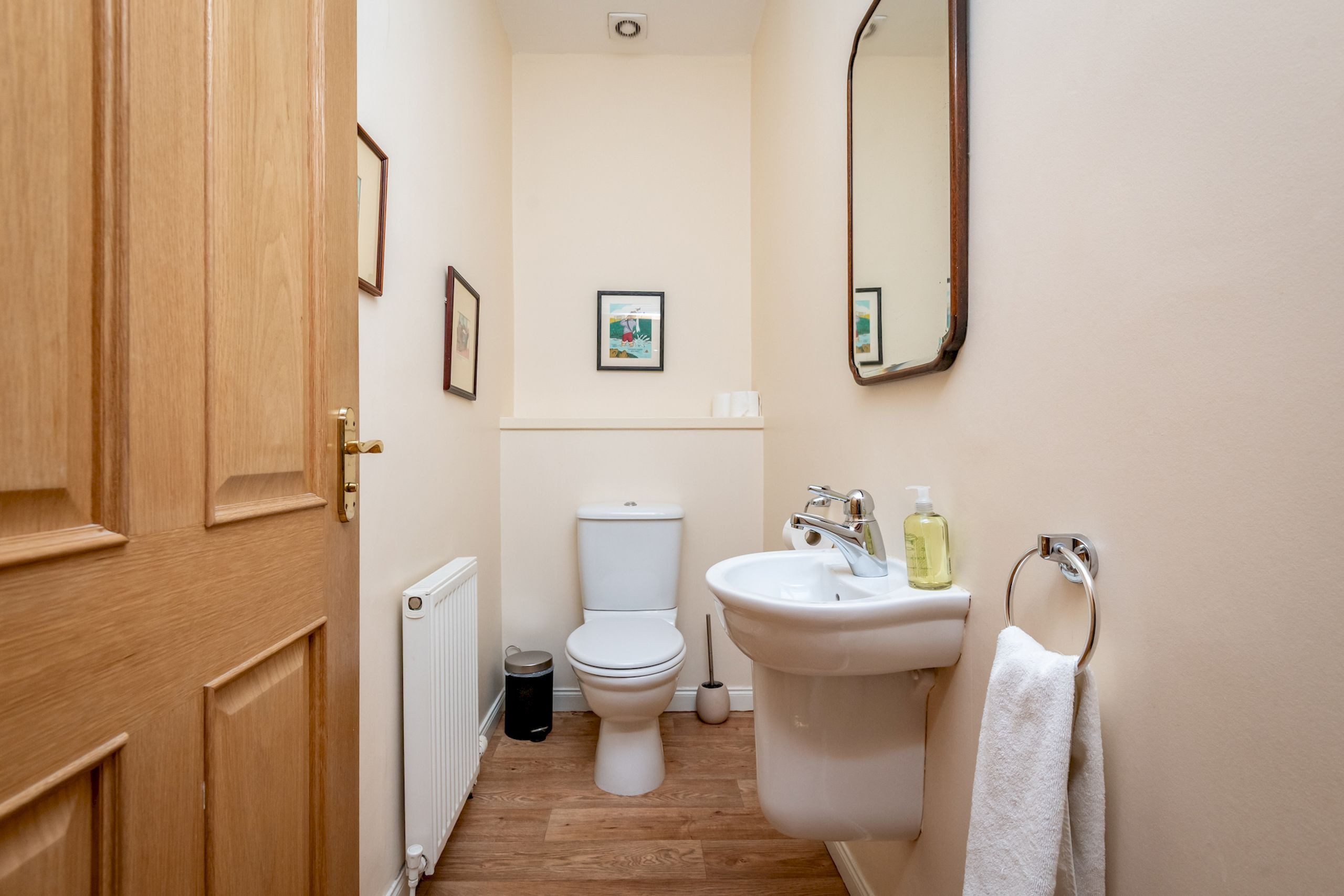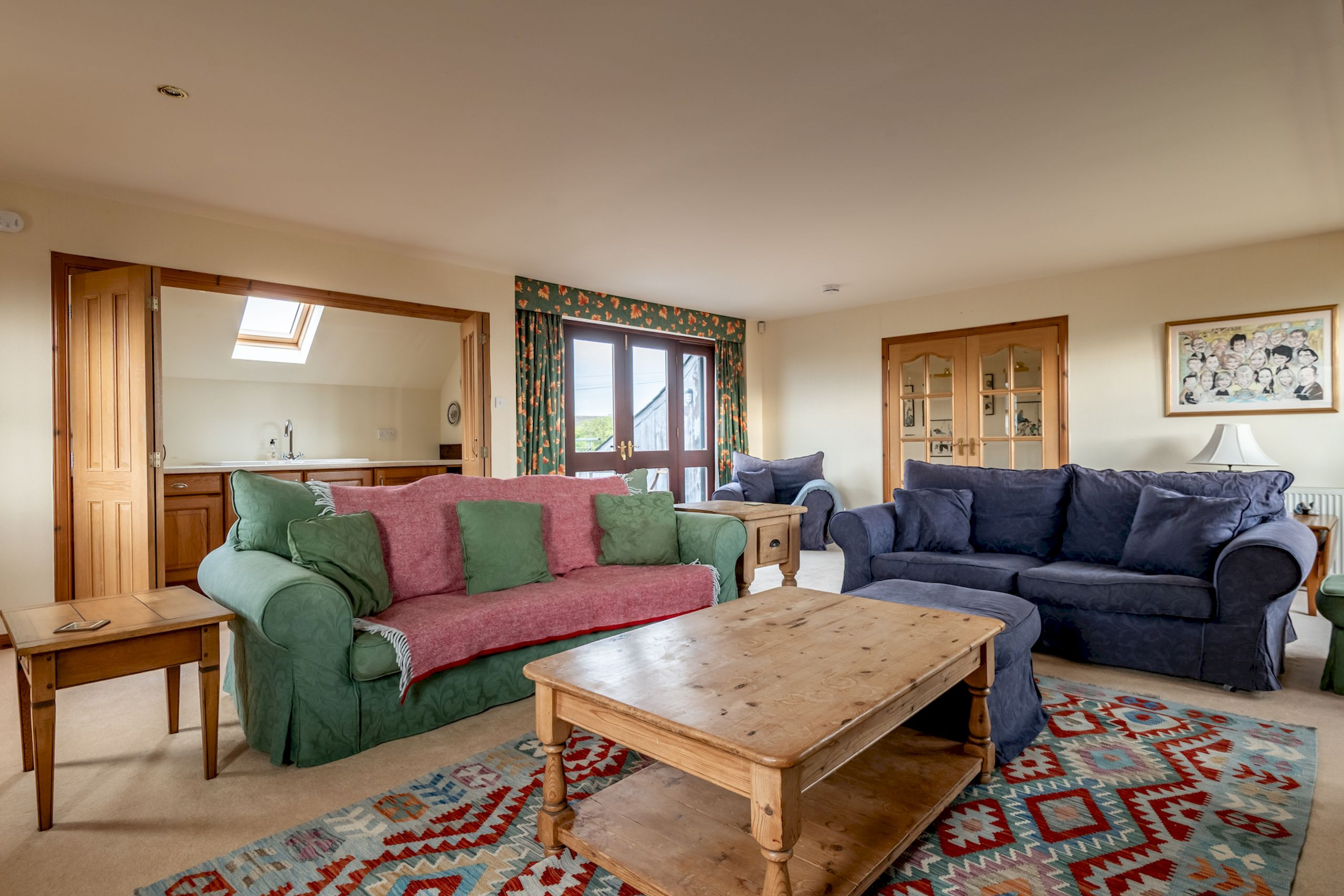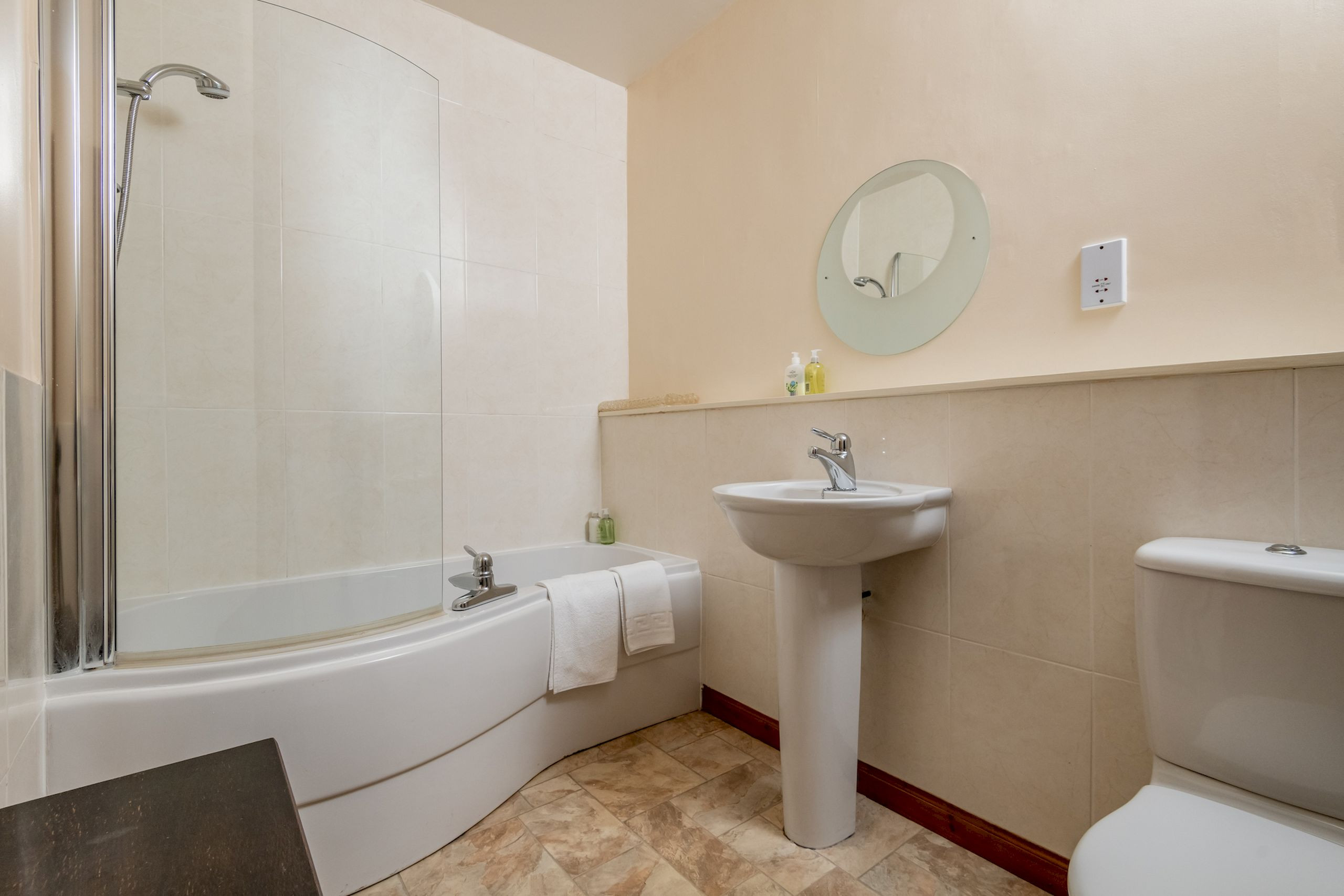 The ground floor is set up beautifully for sociable, relaxed living and works well for guests with limited mobility. A family-sized dining kitchen with modern units, range-style gas cooker, dishwasher, washing machine, tumble dryer and fridge-freezer makes self-catering straightforward, with a kitchen table for casual meals and a door straight out to the enclosed rear courtyard. There’s also a separate front dining room with a large table and seating for up to ten – ideal for long dinners or celebratory gatherings – plus a twin bedroom and a freshly renovated cloakroom with WC and vanity basin (refurbished April 2023).
