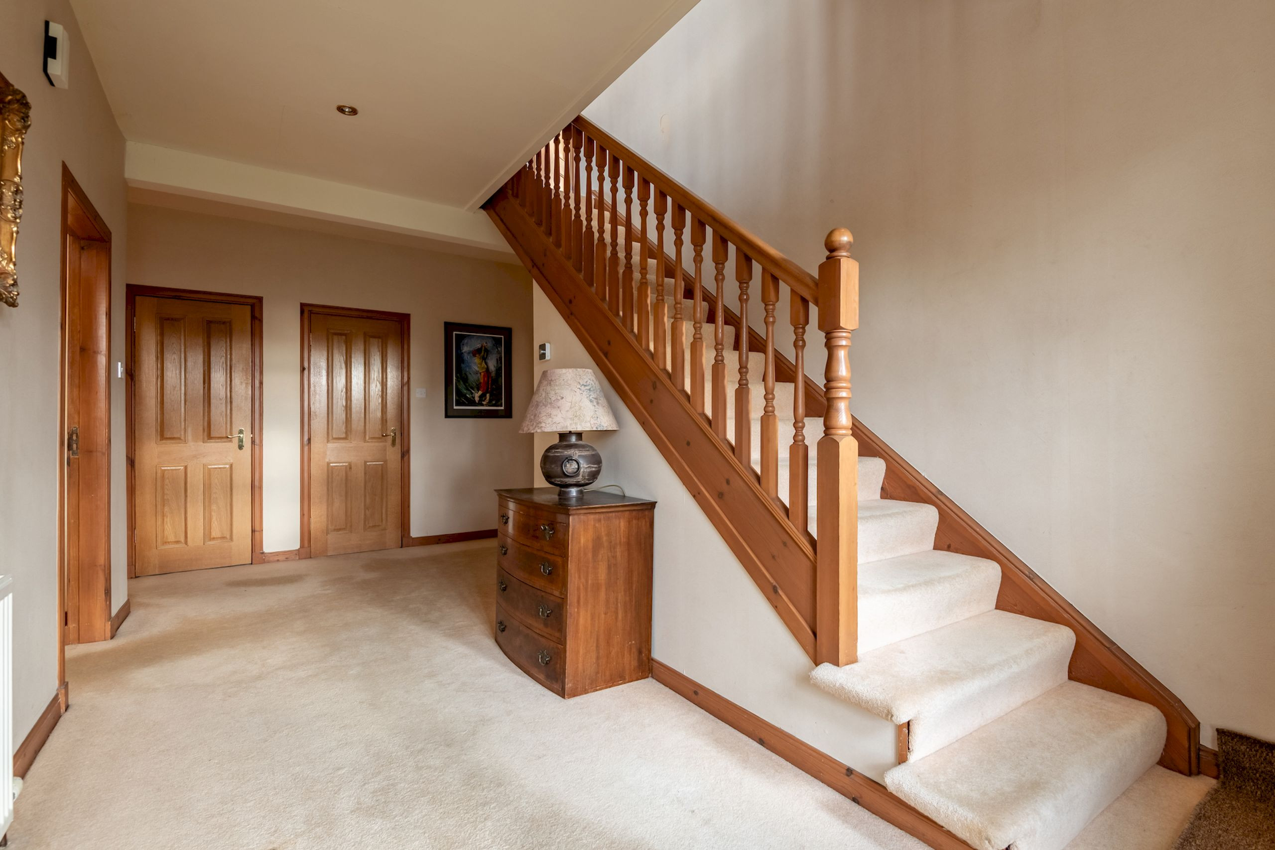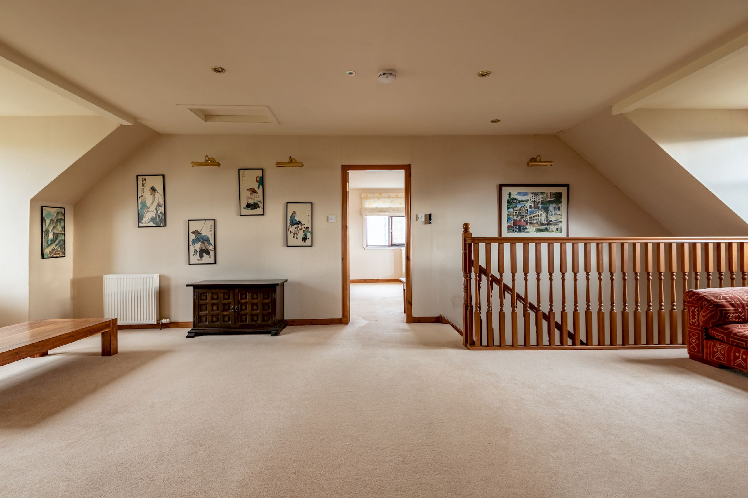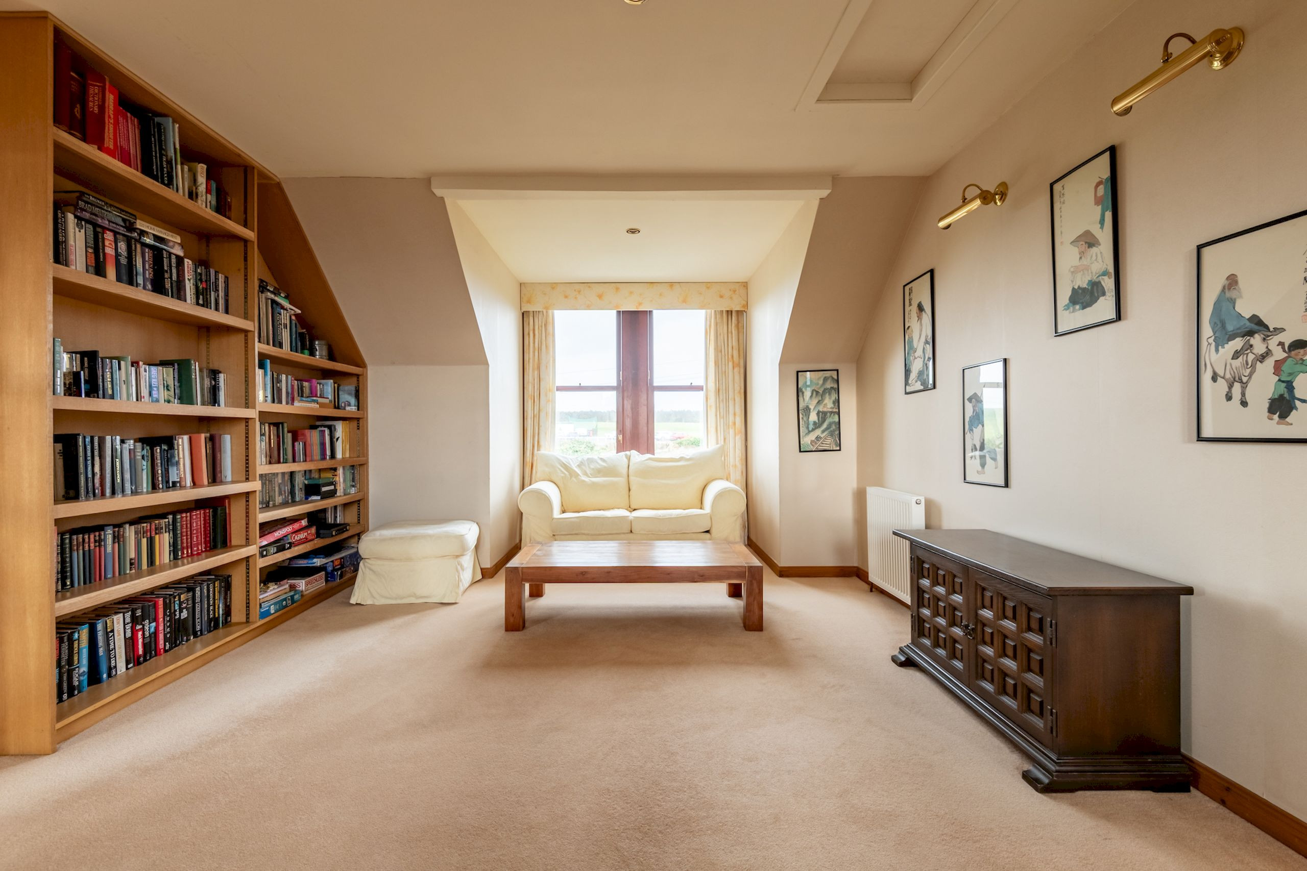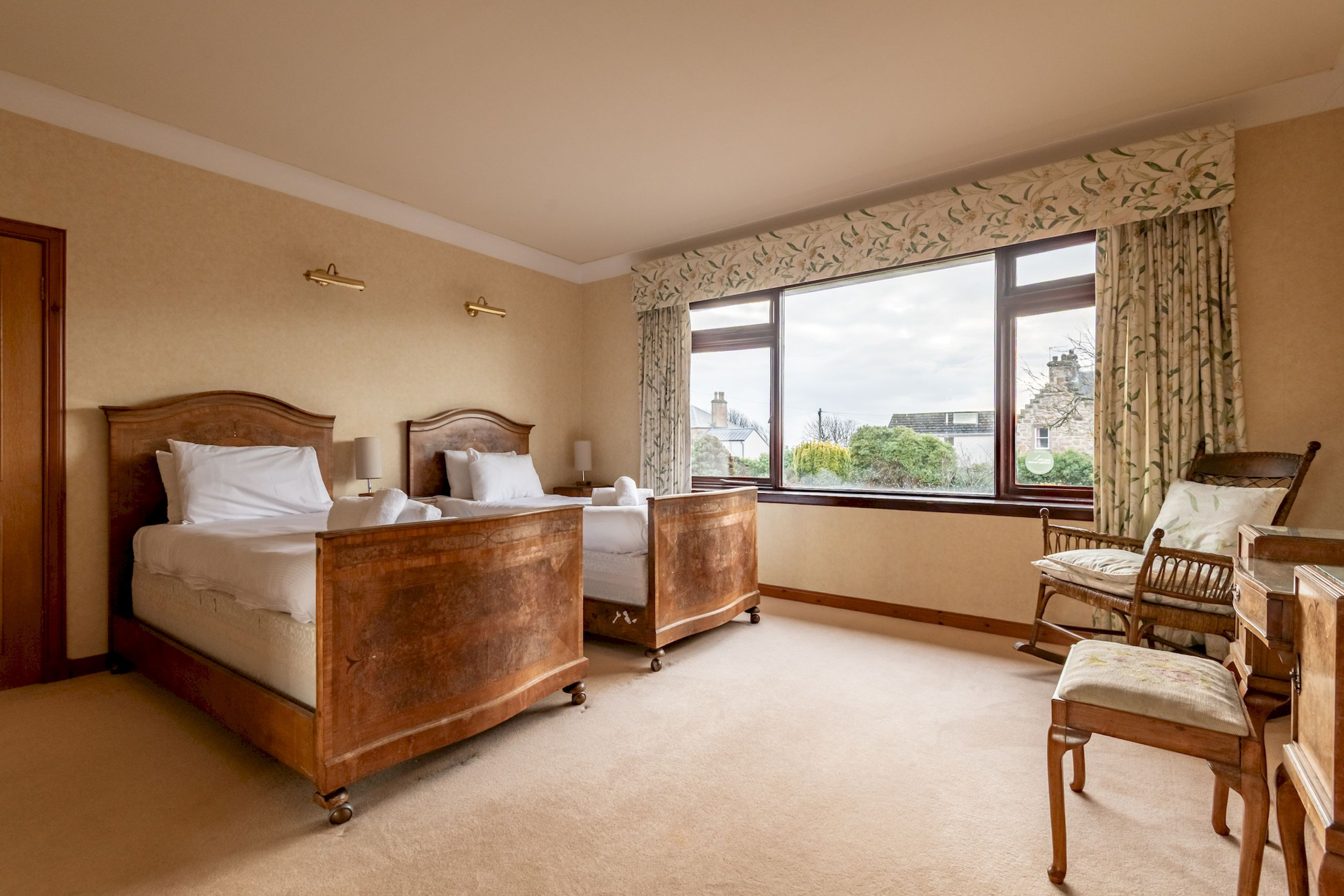 On the first floor, the sitting room is positioned to make the most of the views towards Elie Parish Church through its bay window. Two generous sofas, club chairs, a traditional fireplace and bookcase create a warm, inviting space to unwind after a day on the beach or exploring the East Neuk. This level also has a stylish front-facing king-size bedroom and two luxuriously refurbished bathrooms (April 2023): one with a freestanding bath, vanity unit and WC, and another sleek shower room with glass enclosure, vanity basin and illuminated mirror – perfect for unhurried, spa-style evenings in.