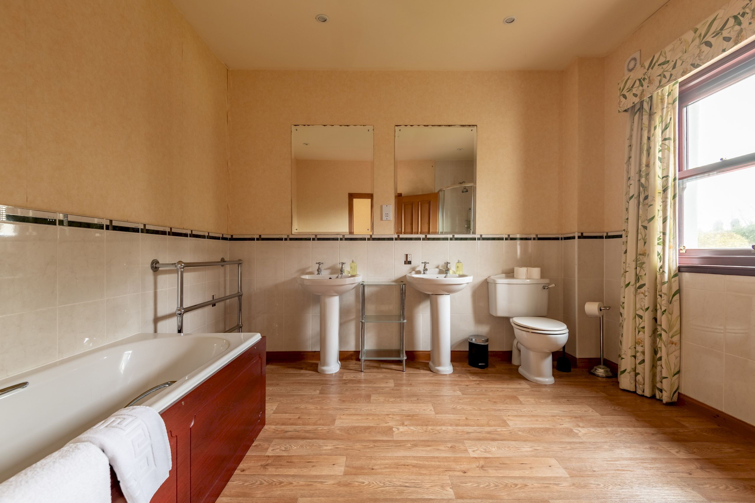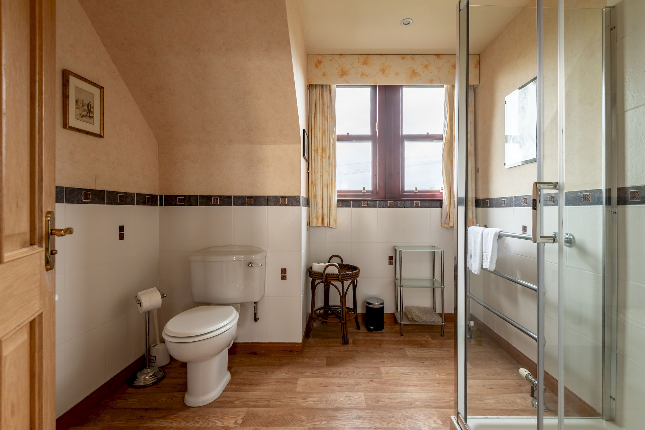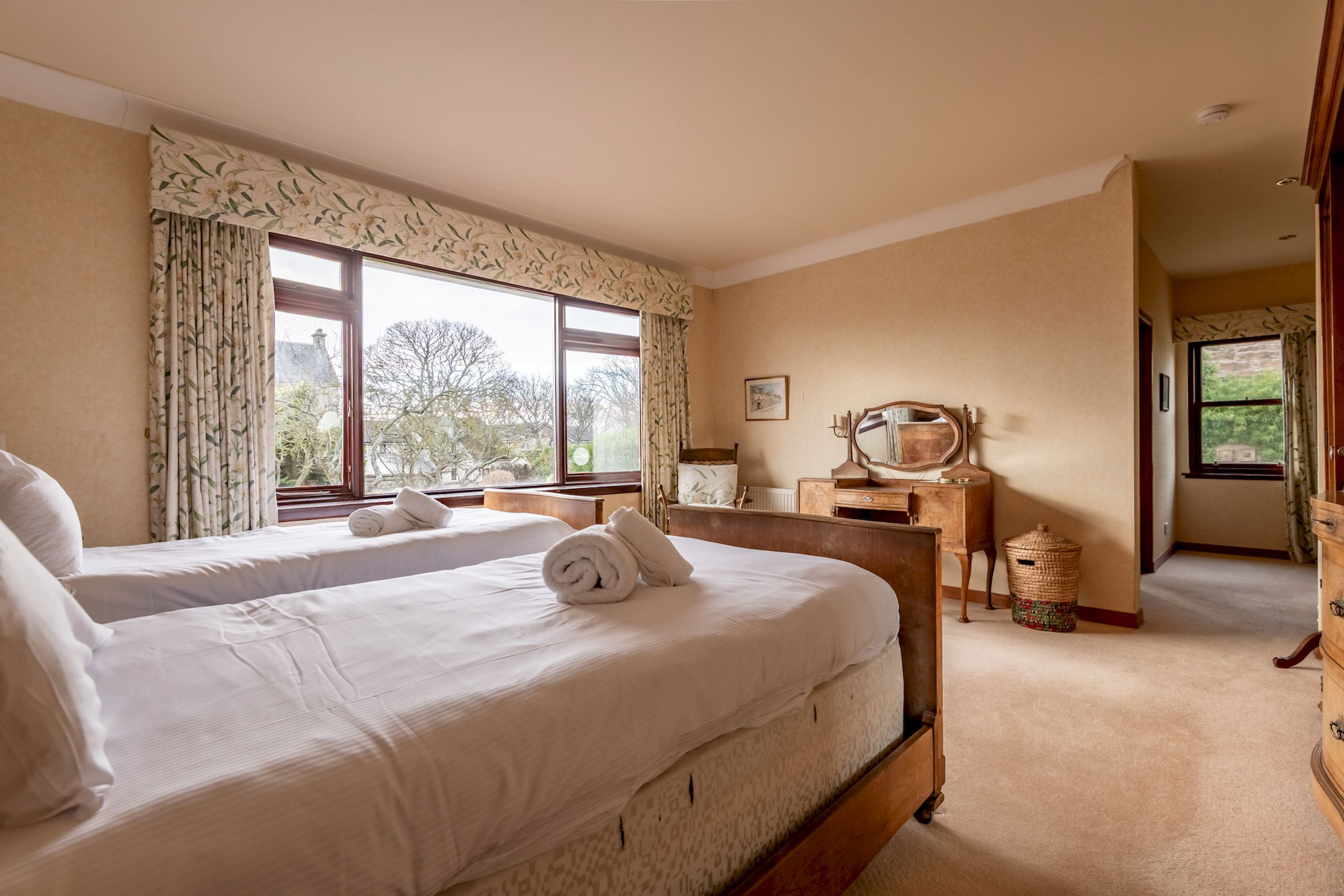 The top floor offers further flexible sleeping space, with a super-king bedroom framed by triple windows and lovely views, and a twin bedroom with bay window, both with plenty of storage. A spacious third shower room, also newly renovated in 2023, serves this floor with a large shower enclosure, vanity basin, WC and illuminated mirror.