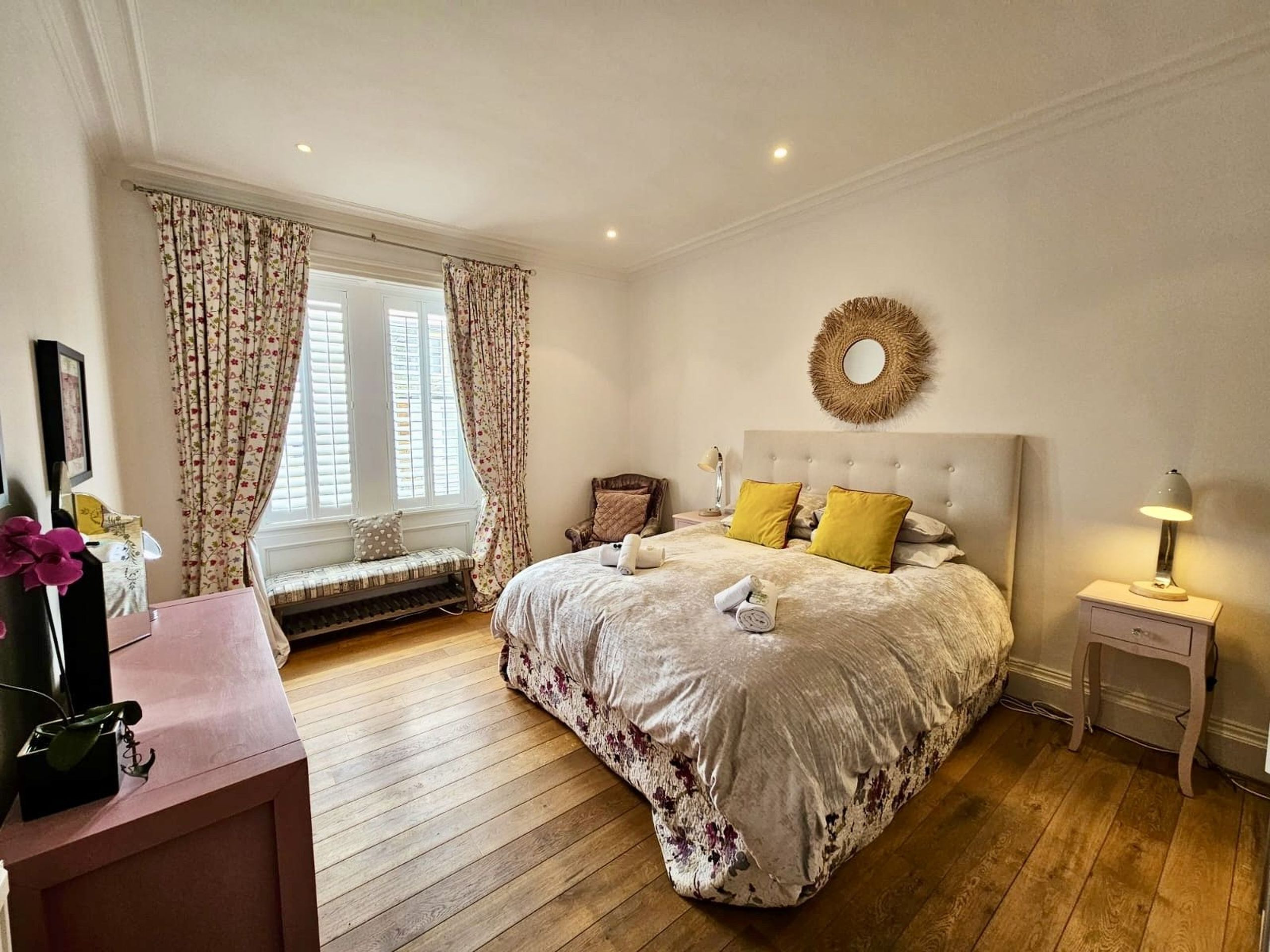The ground floor is all about sociable open-plan living. A spacious reception hall leads into a fabulous lounge/dining/kitchen area that runs from front to back, with almost full-height patio doors opening onto both the lawned front garden and the private rear patio – perfect for drifting in and out on warm days. Hardwood floors run throughout, with blinds on each door and window, and the lounge area is furnished with large sofas (new for 2025), a big coffee table and Smart TV. The dining table seats up to ten for long, chatty meals, while the well-equipped kitchen includes a gas hob, electric oven, fridge-freezer, microwave and Nespresso coffee machine (bring your favourite pods). Just off the kitchen, a separate utility room with extra units, sink, washing machine and tumble dryer leads straight to the rear garden. Also on this level you’ll find a comfortable front-facing double bedroom and a modern shower room – ideal for guests who prefer to stay closer to ground level.