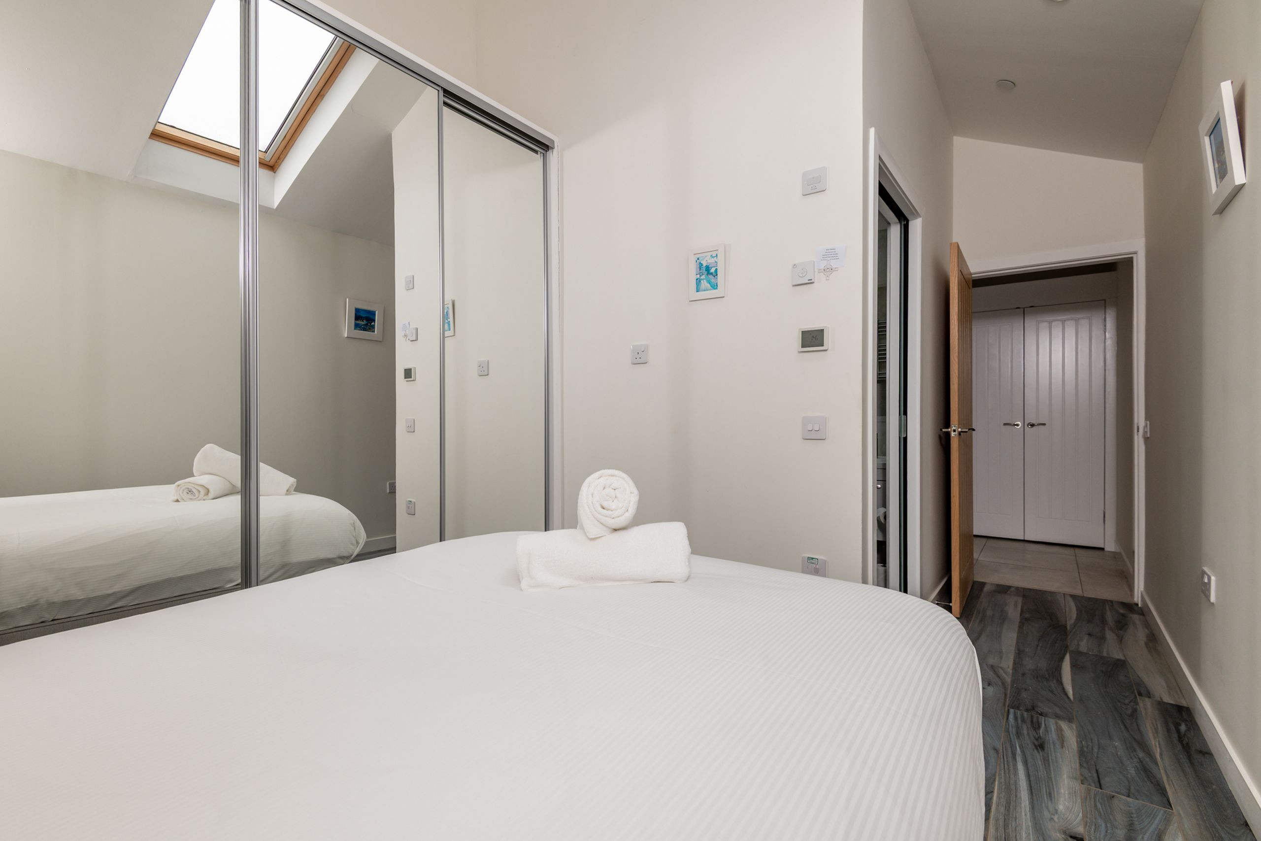 Both bedrooms are calm and contemporary, with soft grey flooring, neutral tones and fitted wardrobes. The main double bedroom has a stylish bed with bedside cabinets and wall lighting, while the second bedroom offers two single beds with central storage, ideal for friends or family. There’s a smart shower room with double-sized enclosure, WC and basin, plus a separate bathroom with bath, overhead shower and WC – very handy for sharing guests.