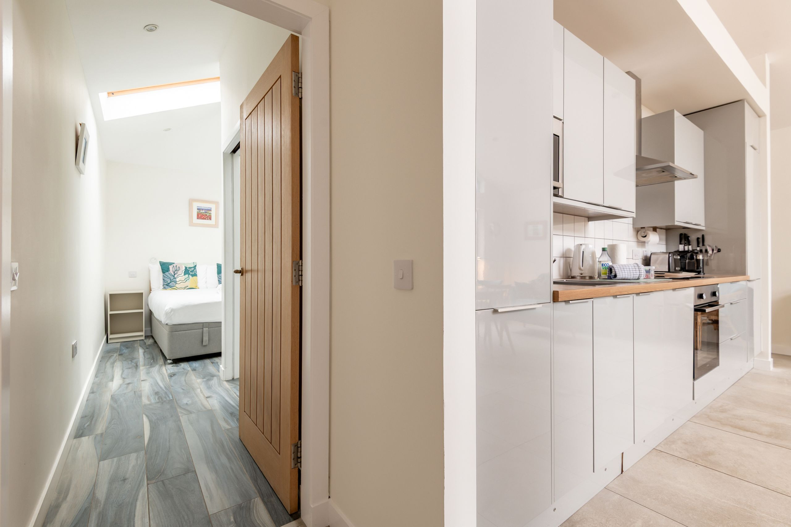 Inside, the heart of the house is the fabulous open-plan lounge, dining and kitchen area. Flagstone flooring, neutral décor and a wall of folding glass doors keep the space bright and airy, with those doors opening straight onto the patio so you can blend indoor and outdoor living on sunny days. There’s a contemporary sofa, chair and ottoman, a dining table for four, and a wall-mounted TV with Chromecast for streaming. The glossy grey kitchen units hide everything you need for relaxed self-catering: induction hob, electric oven and grill, extractor, integrated 60/40 fridge-freezer, washing machine and Nespresso coffee machine.