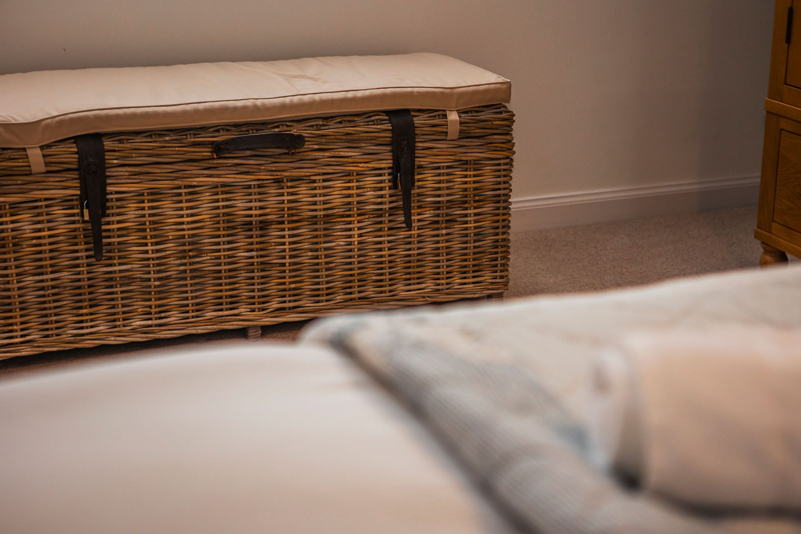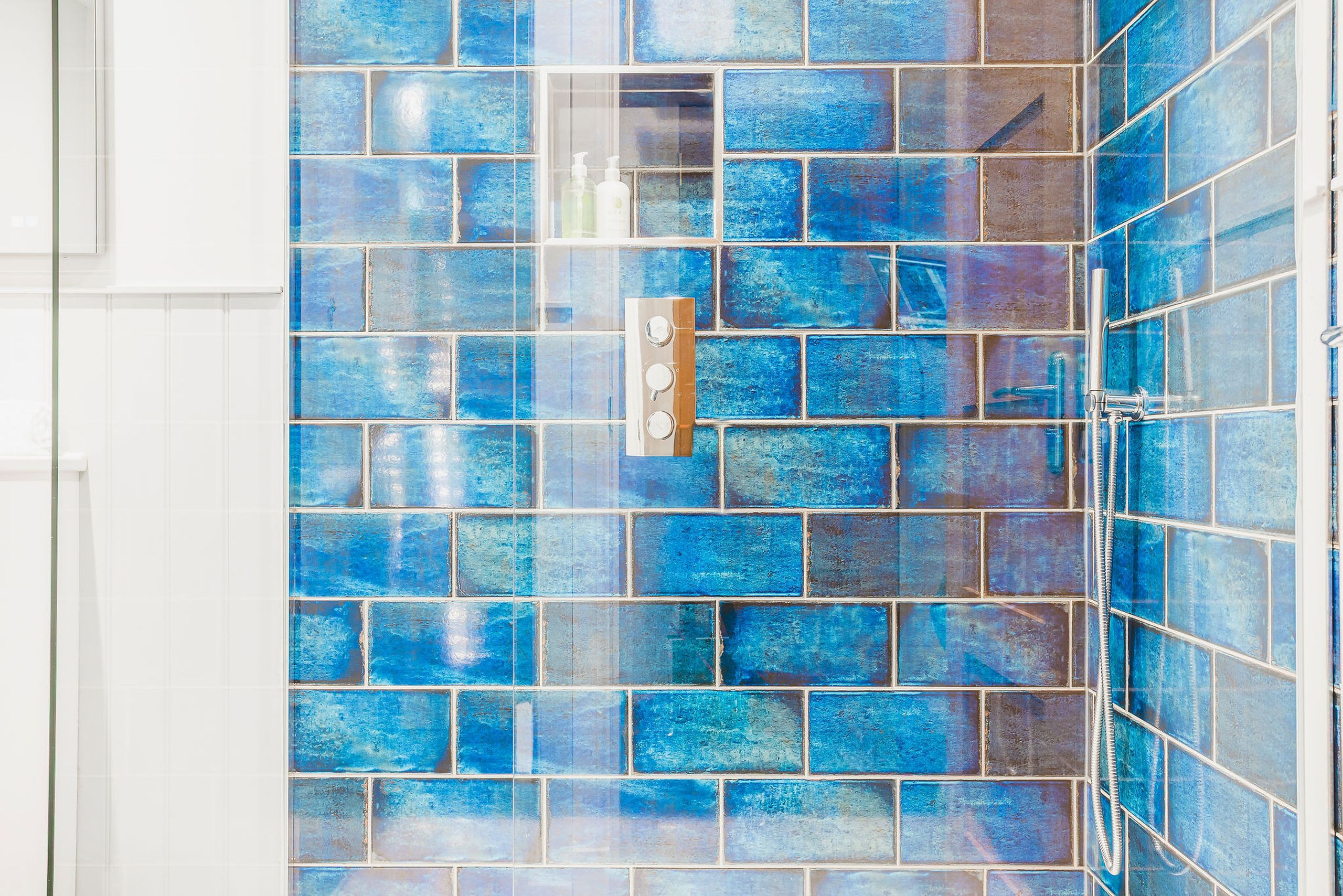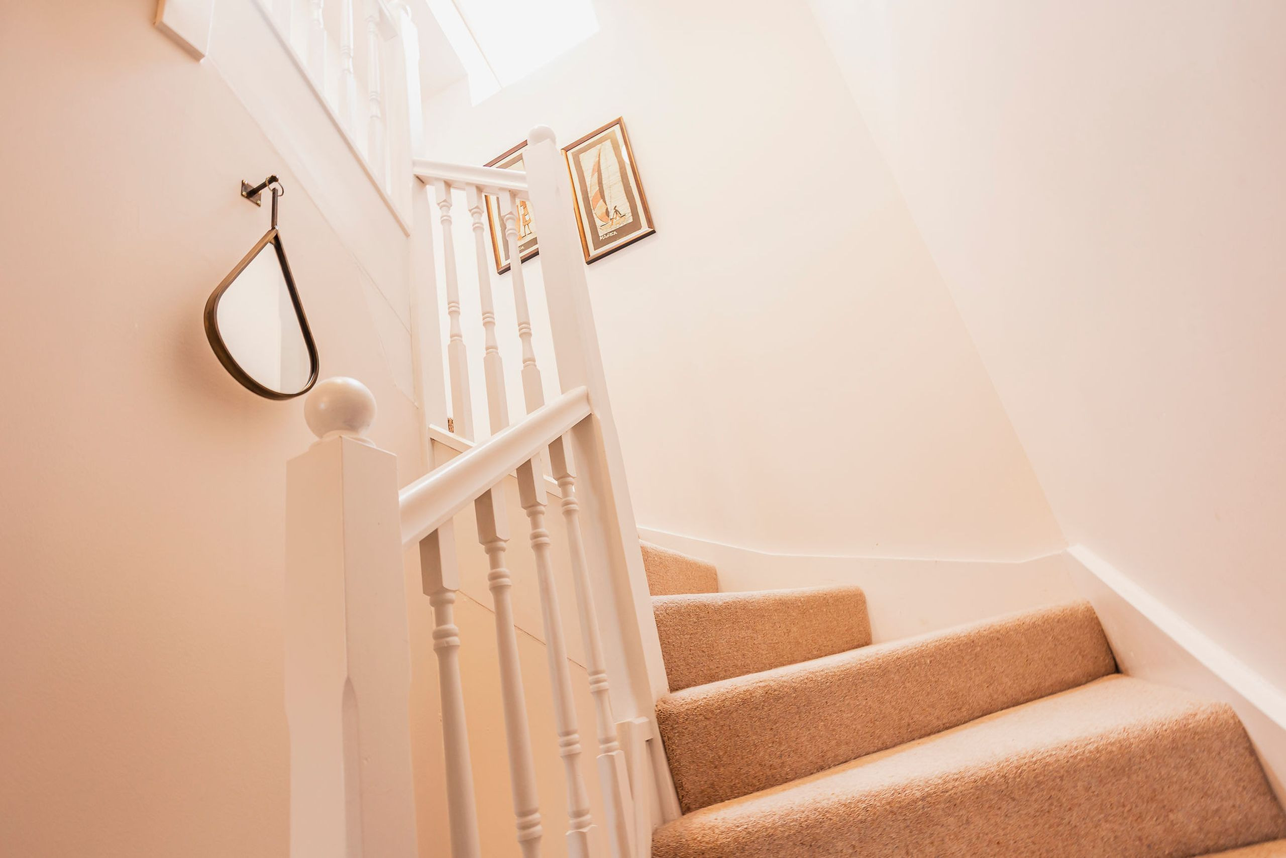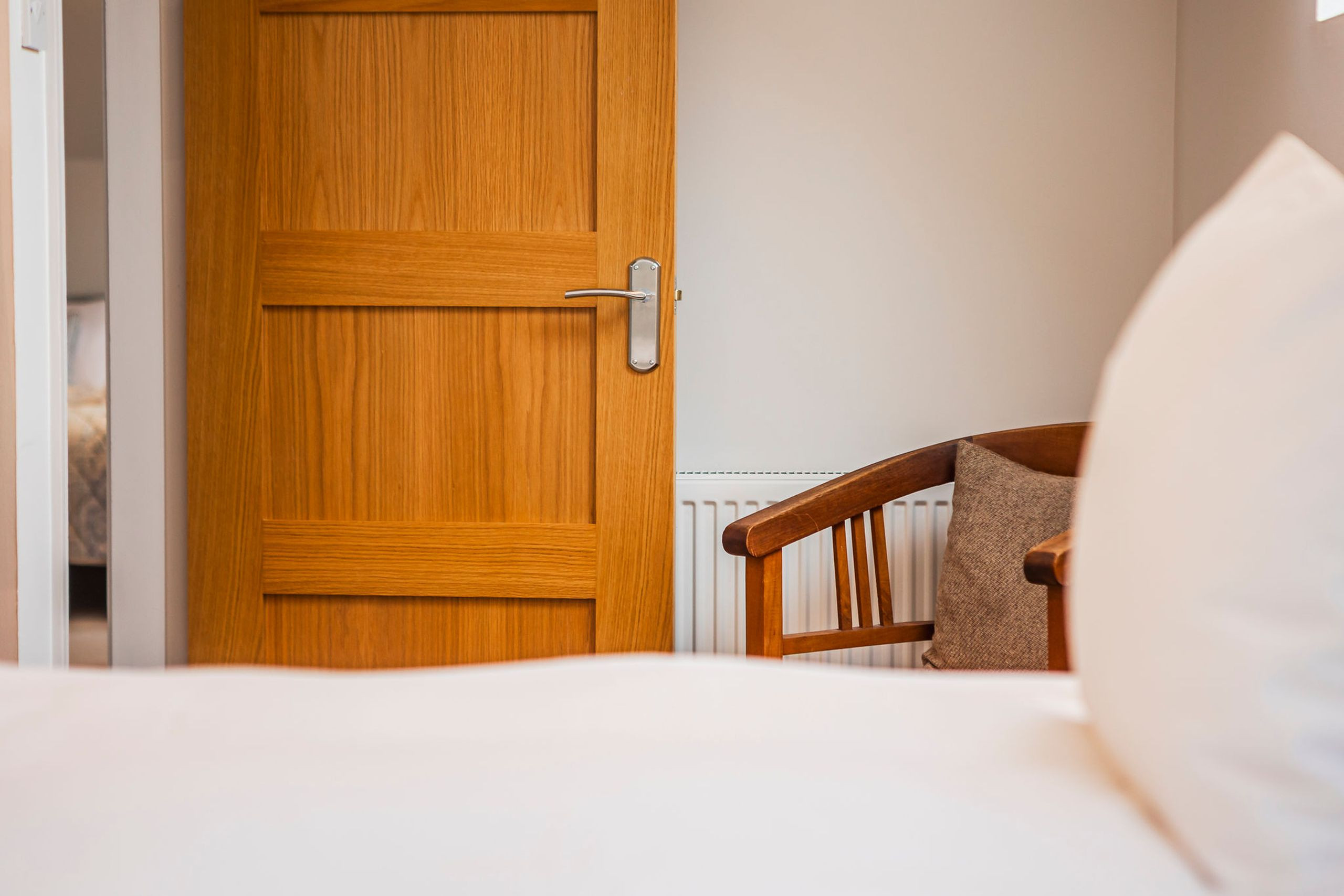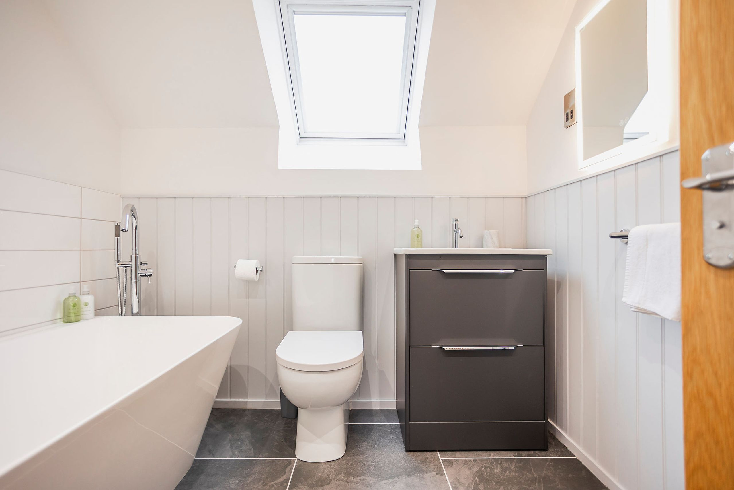 Upstairs, three inviting bedrooms offer flexible sleeping. The spacious master has a king-size bed (with super-king duvet), double wardrobe, chest of drawers and Velux windows to two sides. One twin faces the rear with zip-and-link beds that can be made up as a super king on request, while the second twin faces the front with two singles and ample storage. A sleek family bathroom with freestanding bath, handheld shower, vanity basin and heated towel rail completes the layout.