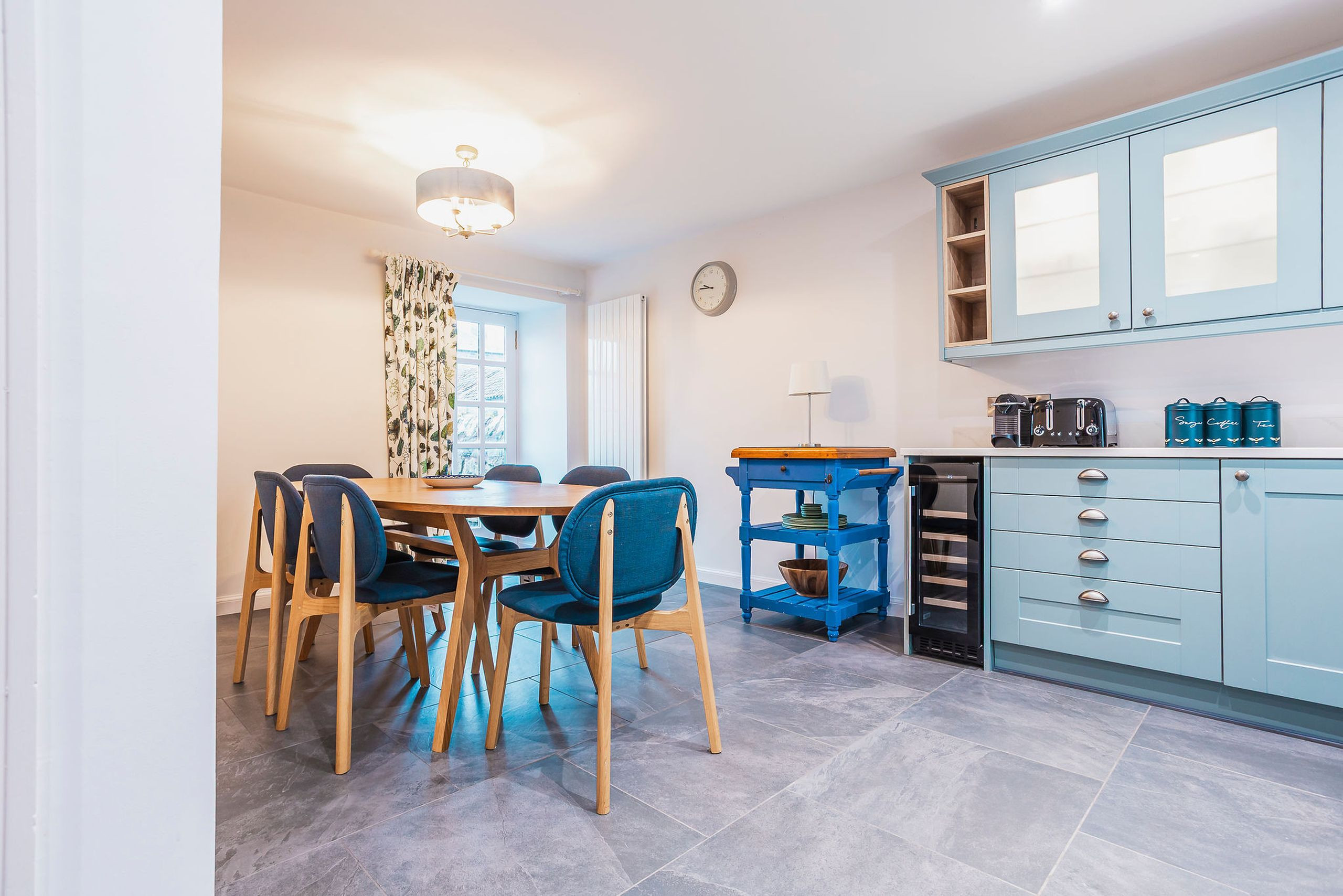 The luxury L-shaped dining kitchen is well equipped for longer stays, with an electric range cooker, washer/dryer, dishwasher, fridge-freezer, microwave, wine cooler, coffee maker and plenty of storage. A dining table for six sits by the door to the enclosed rear patio, making it easy to drift outside for alfresco meals in warmer weather. A contemporary ground-floor shower room with rainfall shower, vanity basin and heated towel rail keeps things practical for groups.