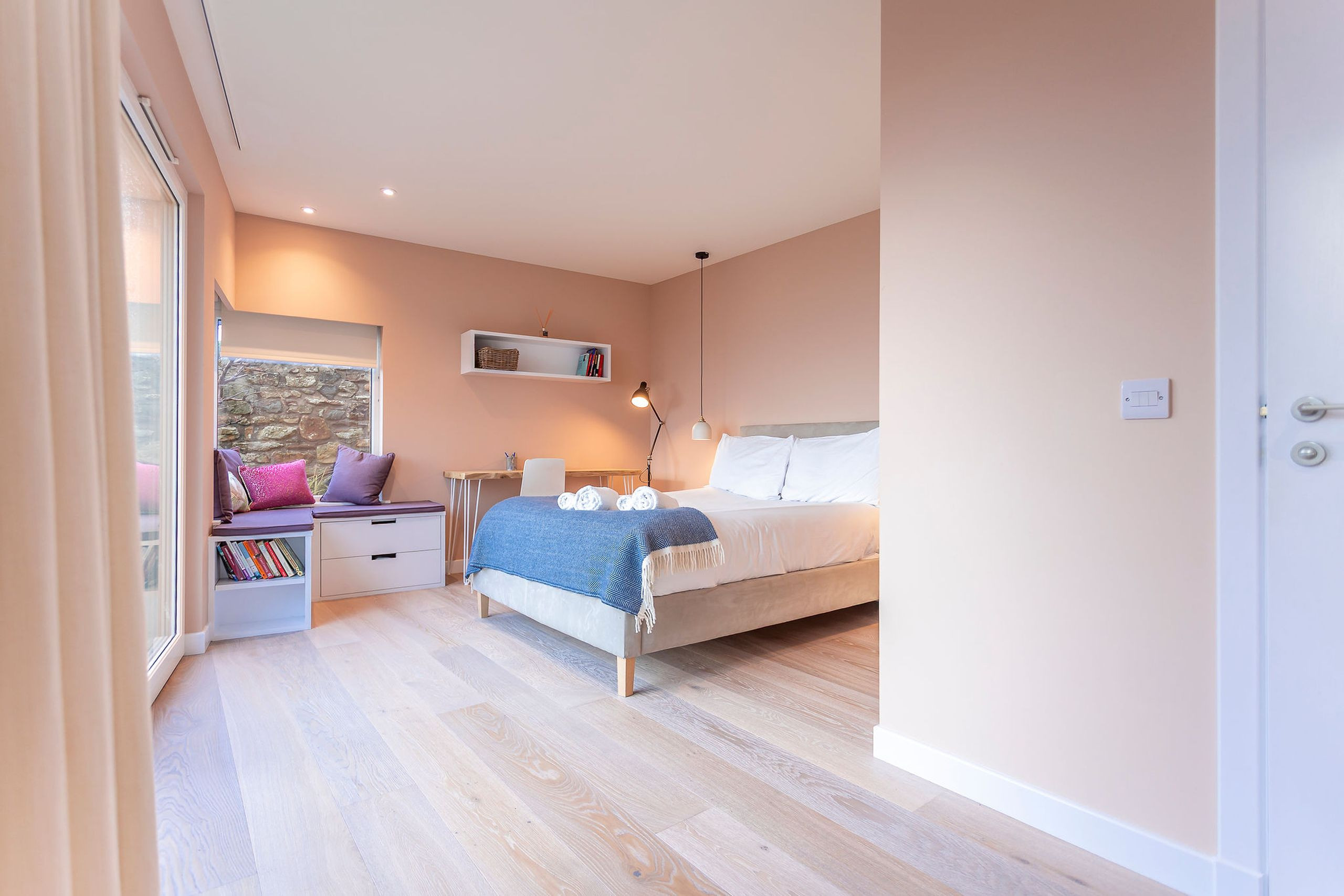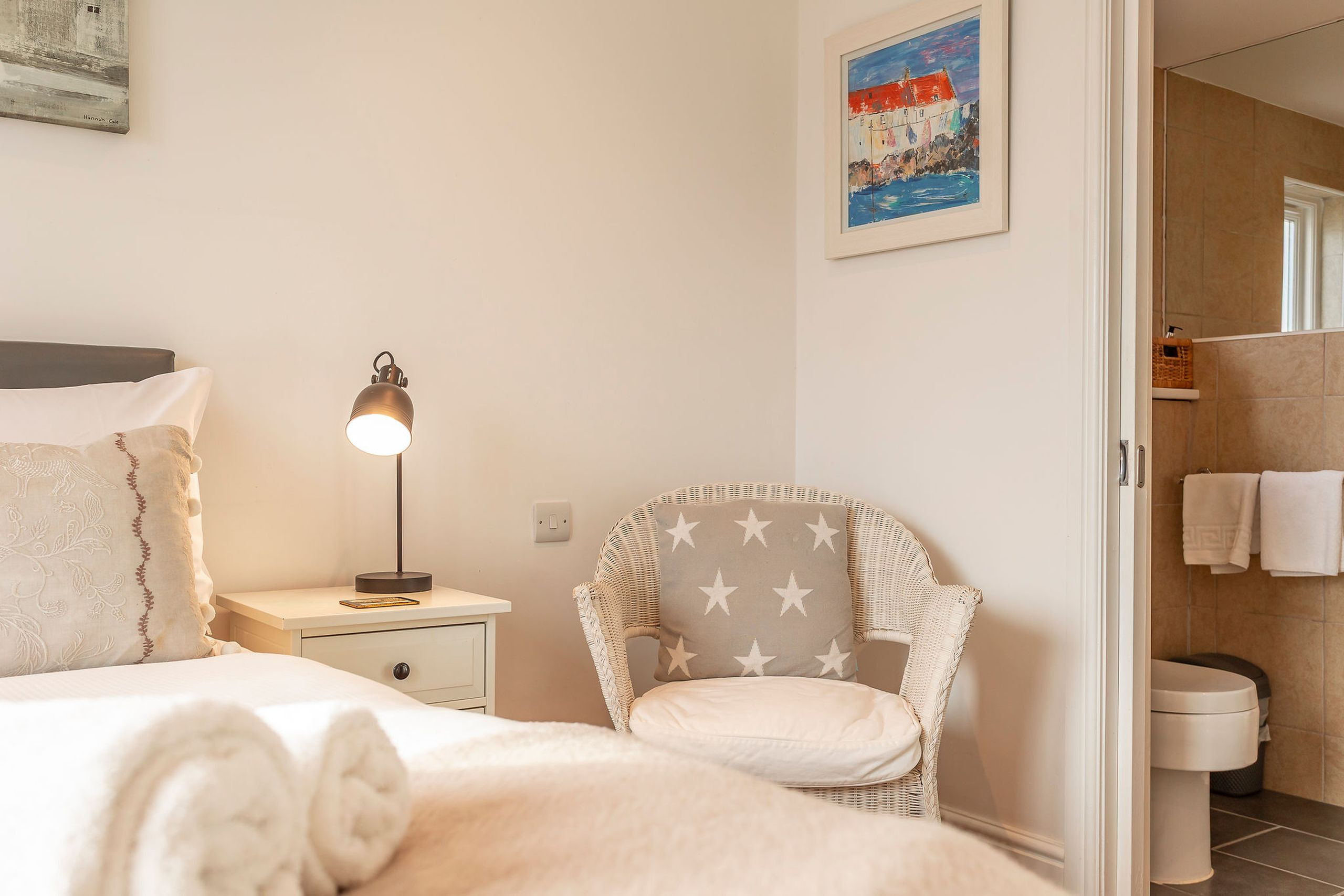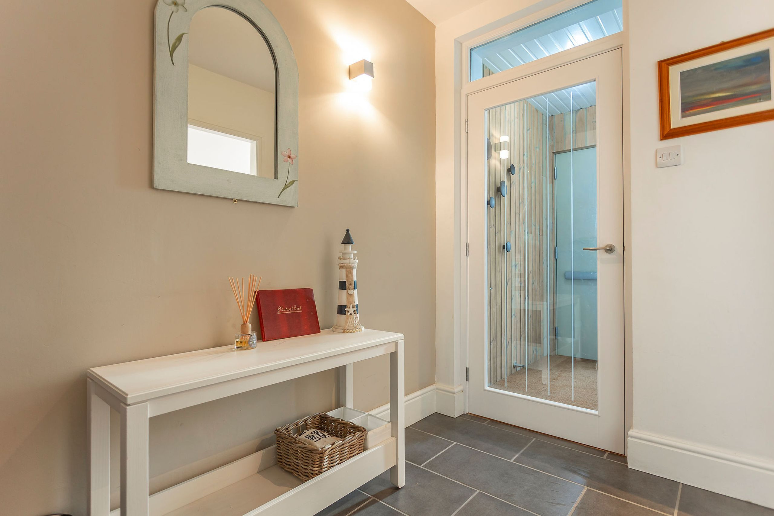 The front door opens to a welcoming reception hall and a ground floor sea facing bedroom with an en suite, ideal for visiting grandparents or a quiet guest room. A short staircase with contemporary steel balustrade leads up to the main living areas, giving the house a cosy layered feel.