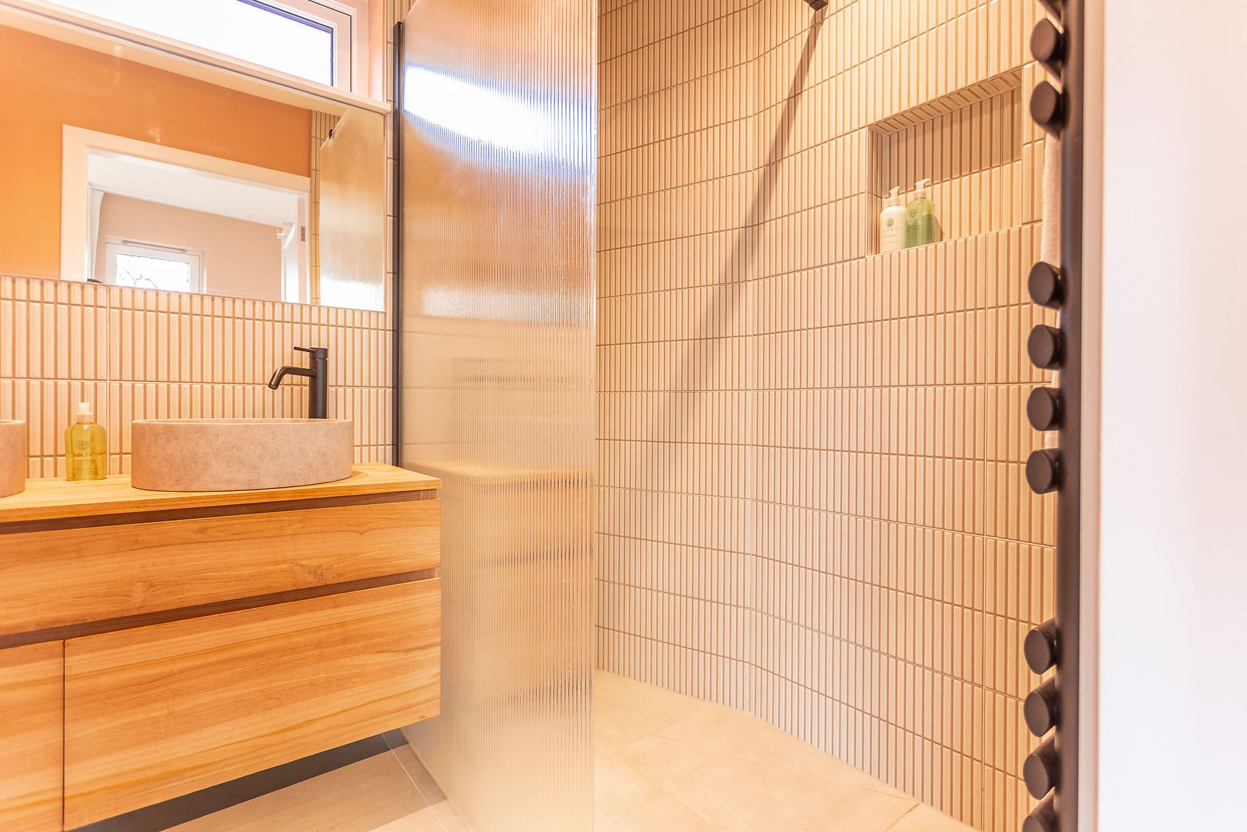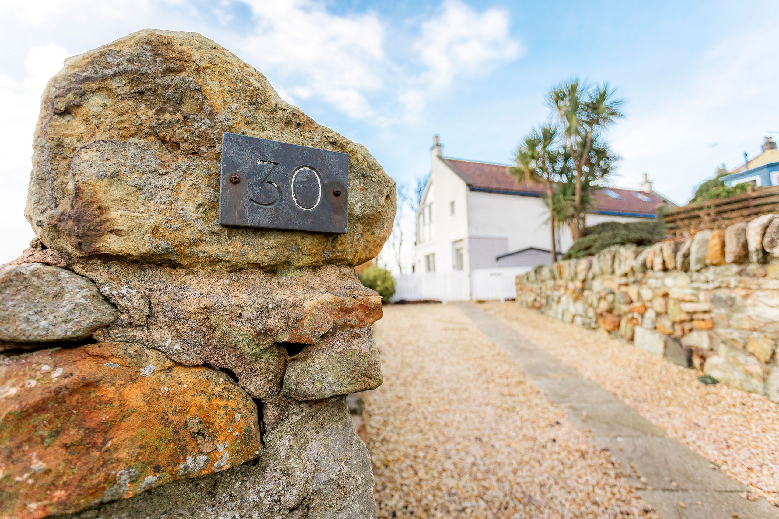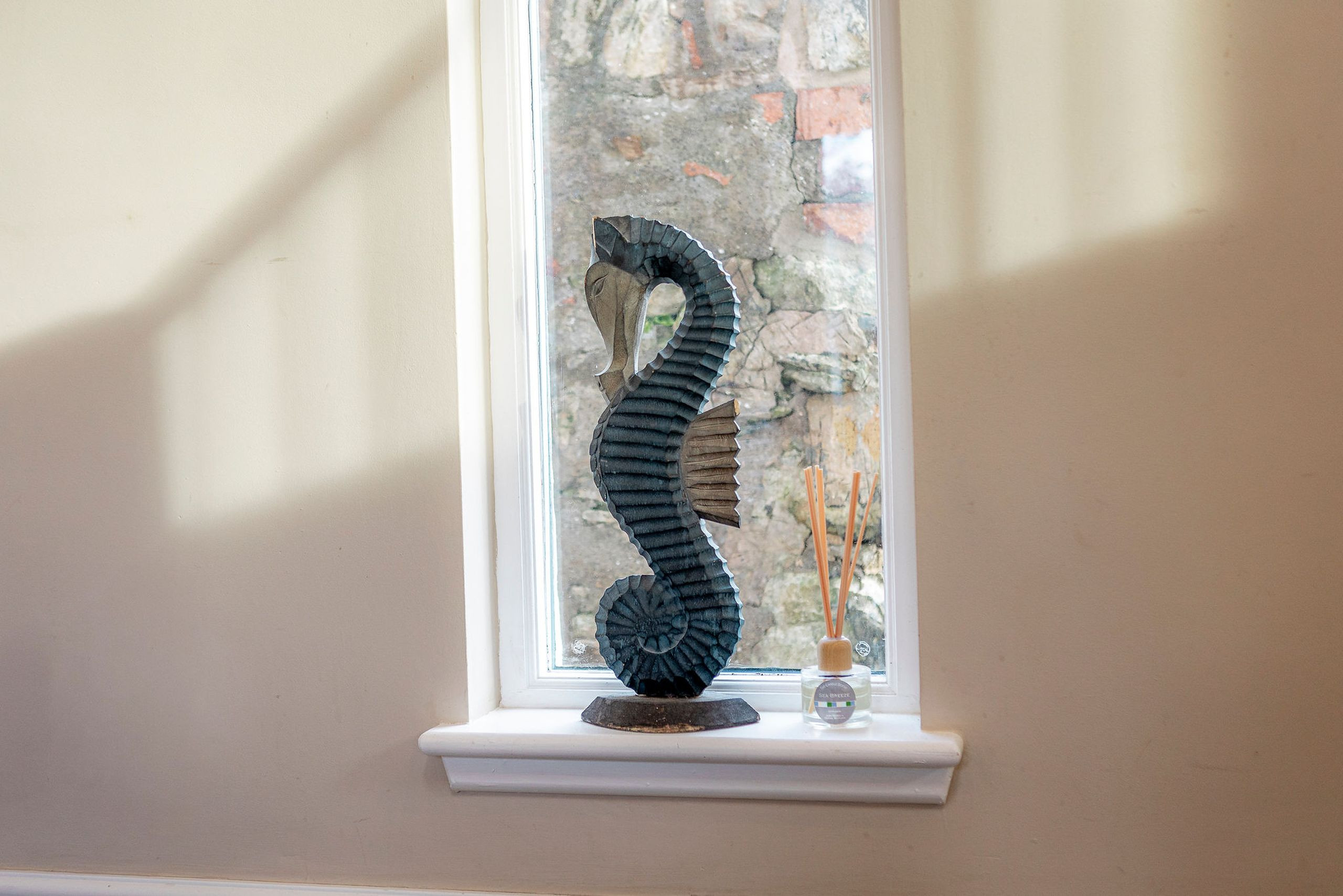 The front door opens to a welcoming reception hall and a ground floor sea facing bedroom with an en suite, ideal for visiting grandparents or a quiet guest room. A short staircase with contemporary steel balustrade leads up to the main living areas, giving the house a cosy layered feel.