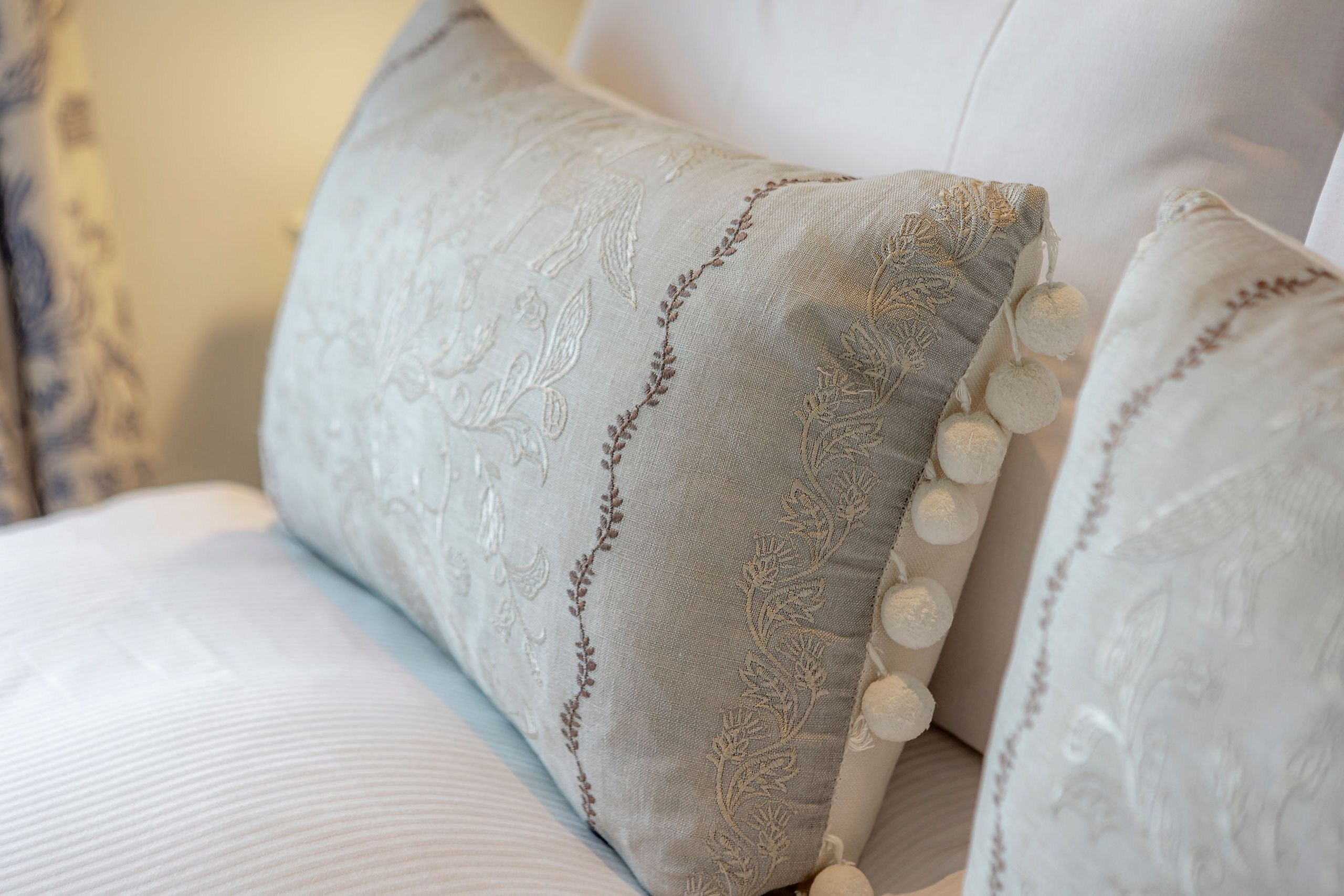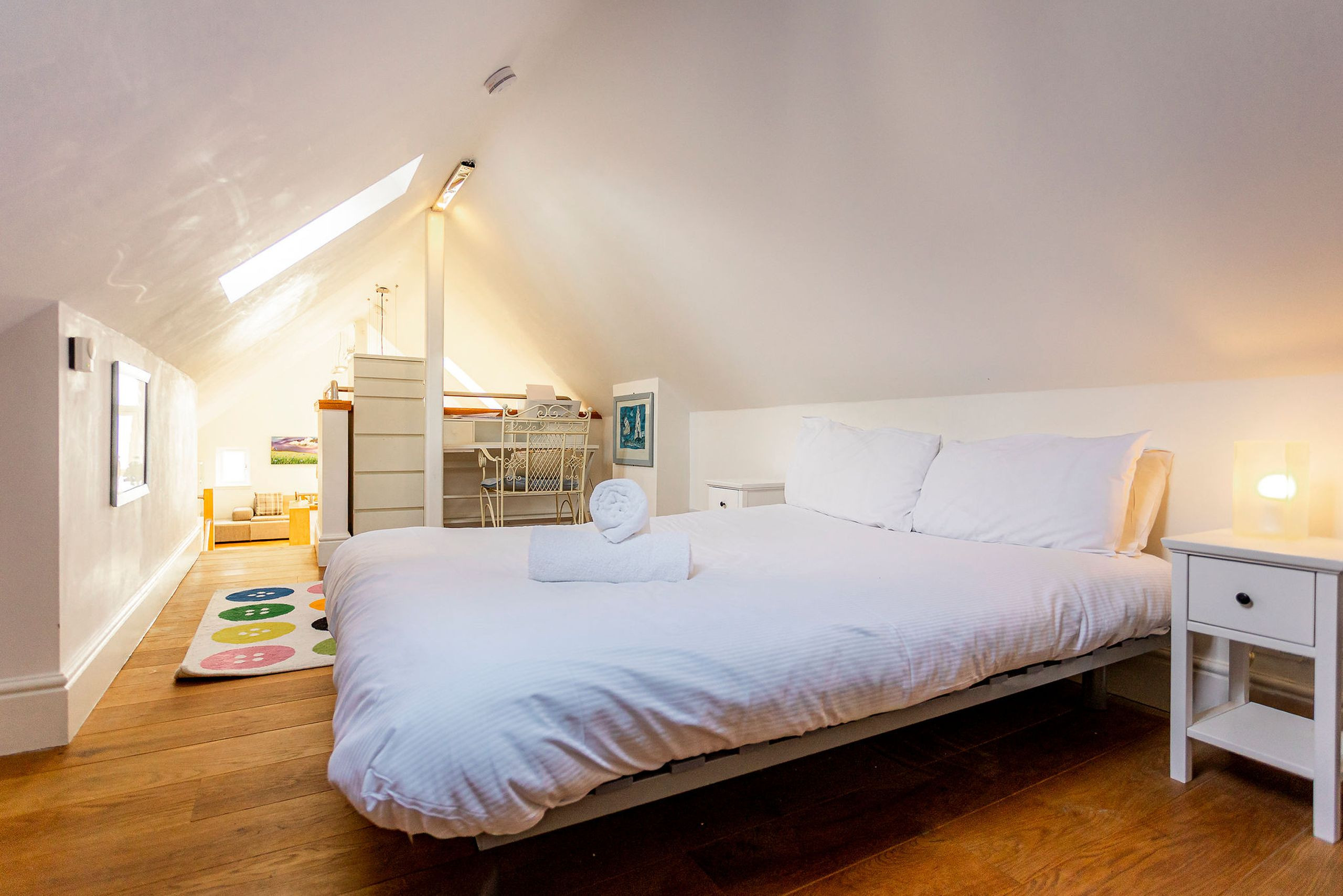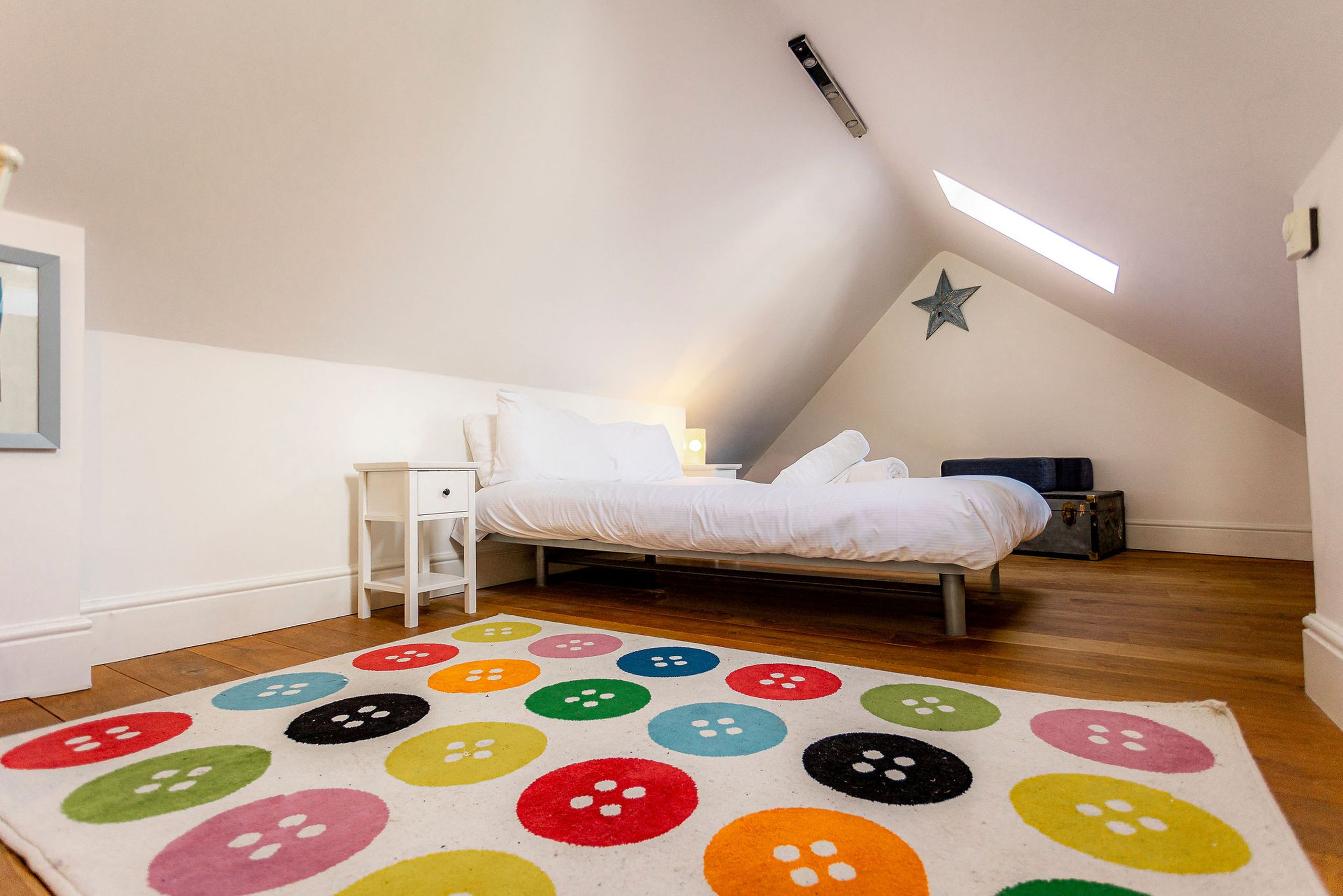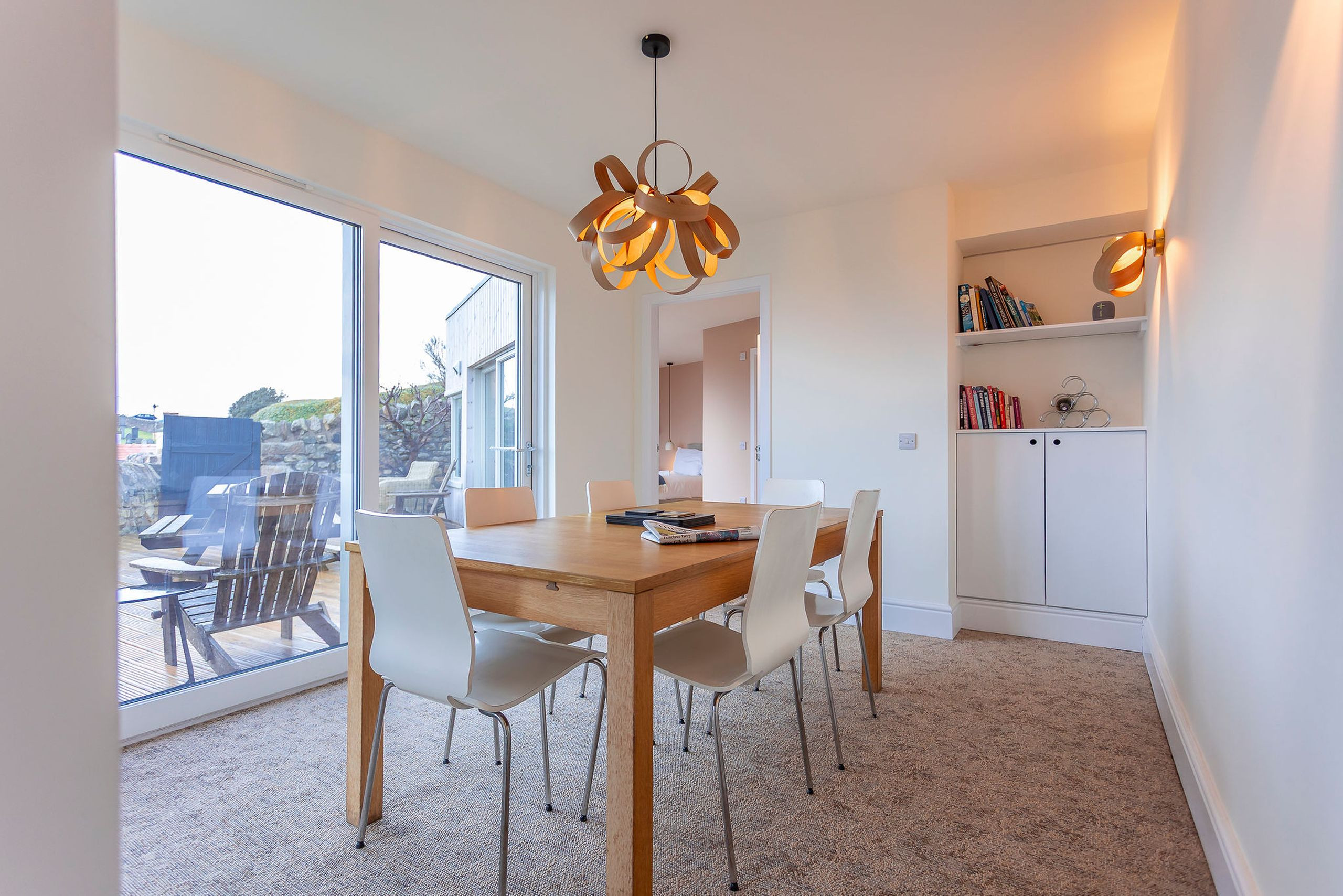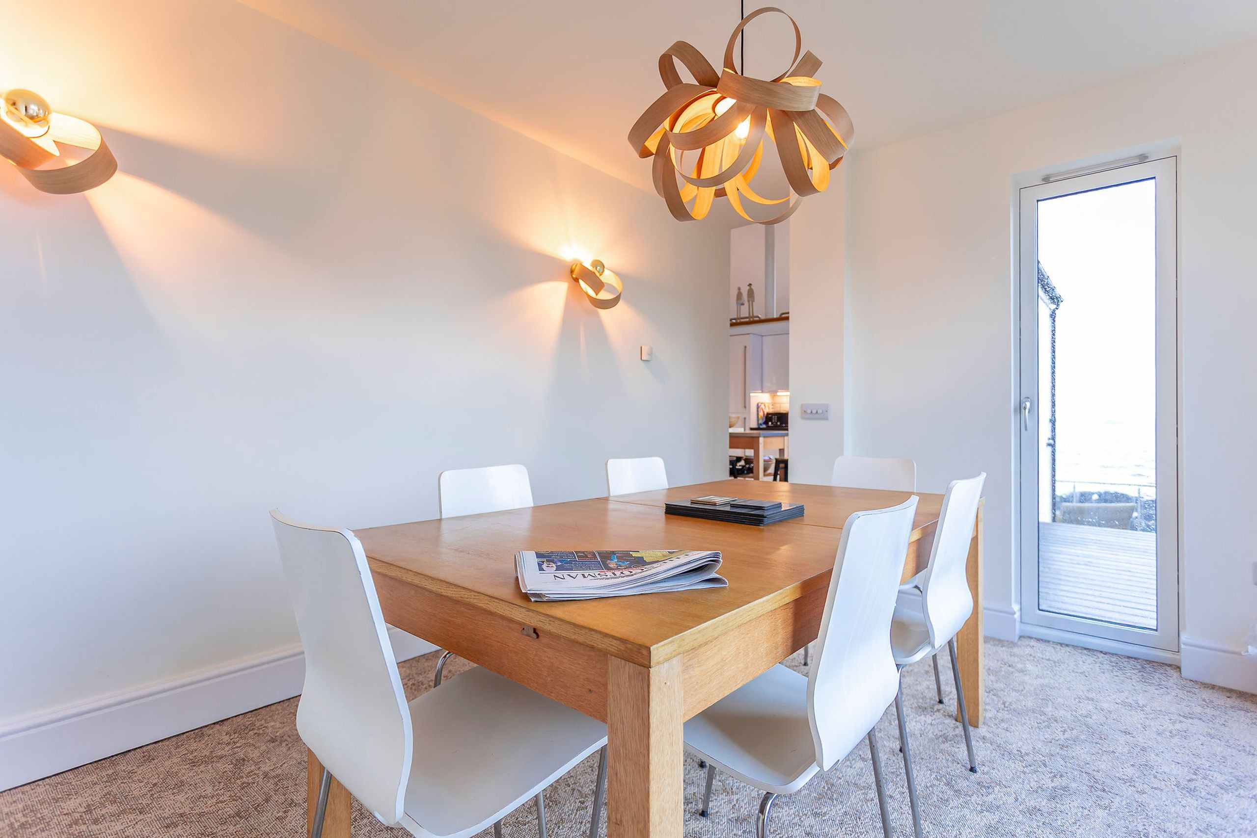 On the first floor the kitchen is the heart of the home: a luxurious fully equipped space with a new butcher’s block perfect for family cooking and baking. The adjacent dining room, created in the new extension, has stunning sea views and folding doors that open to the decking, great for family meals that move outdoors in summer.