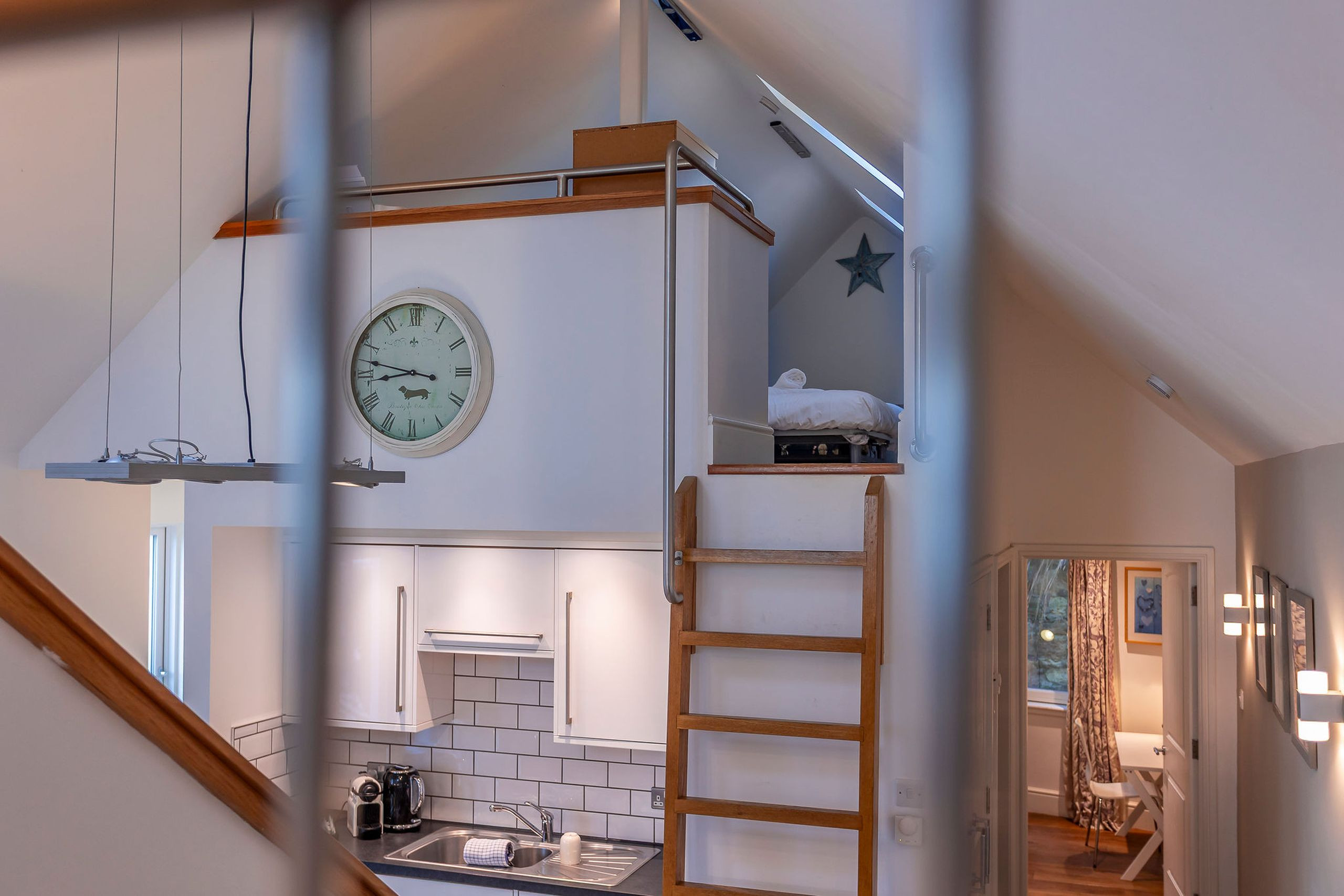 A mezzanine chill out space, accessed by a fixed ladder, offers a quiet nook for reading or a teenage hangout, while seven steps up lead to a bright lounge with a Juliet balcony and breathtaking panoramic views, a lovely spot for family movie nights or watching the sunset together.